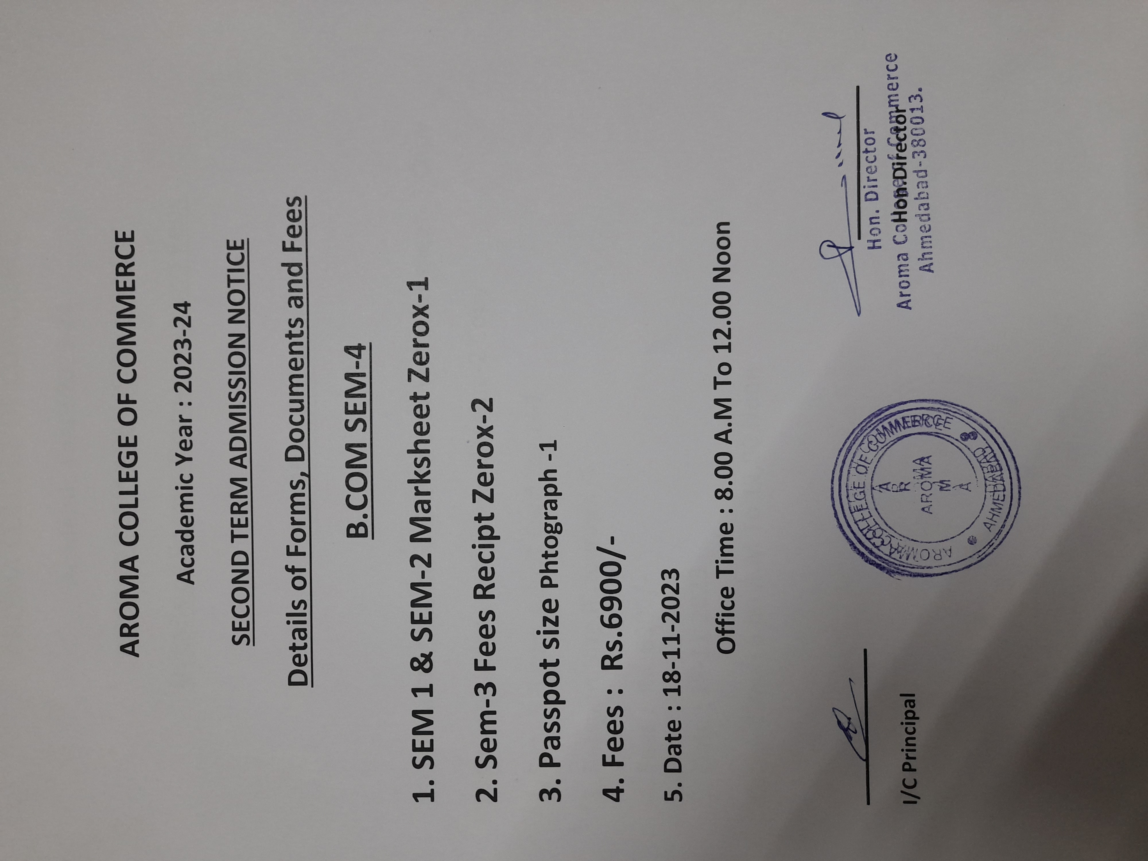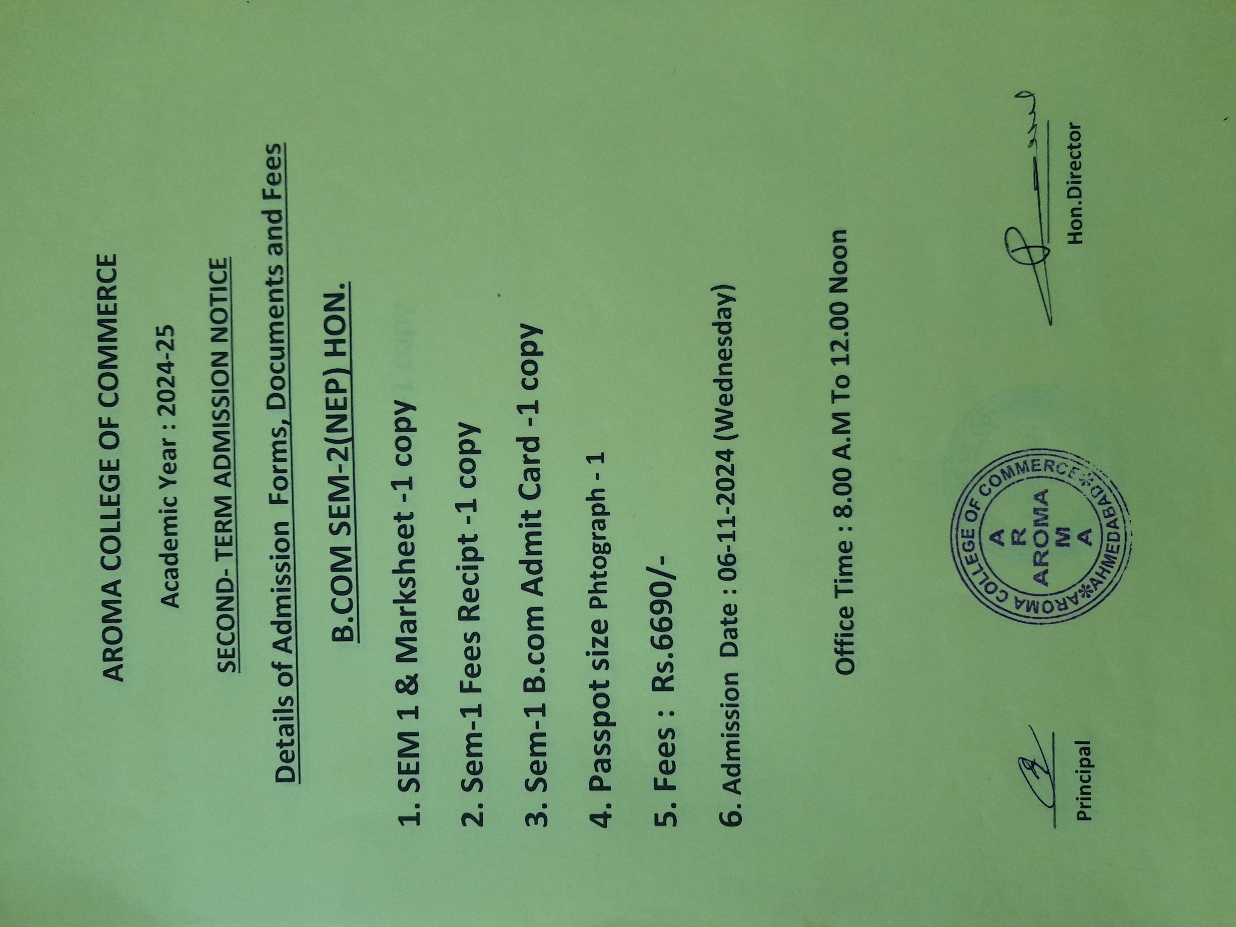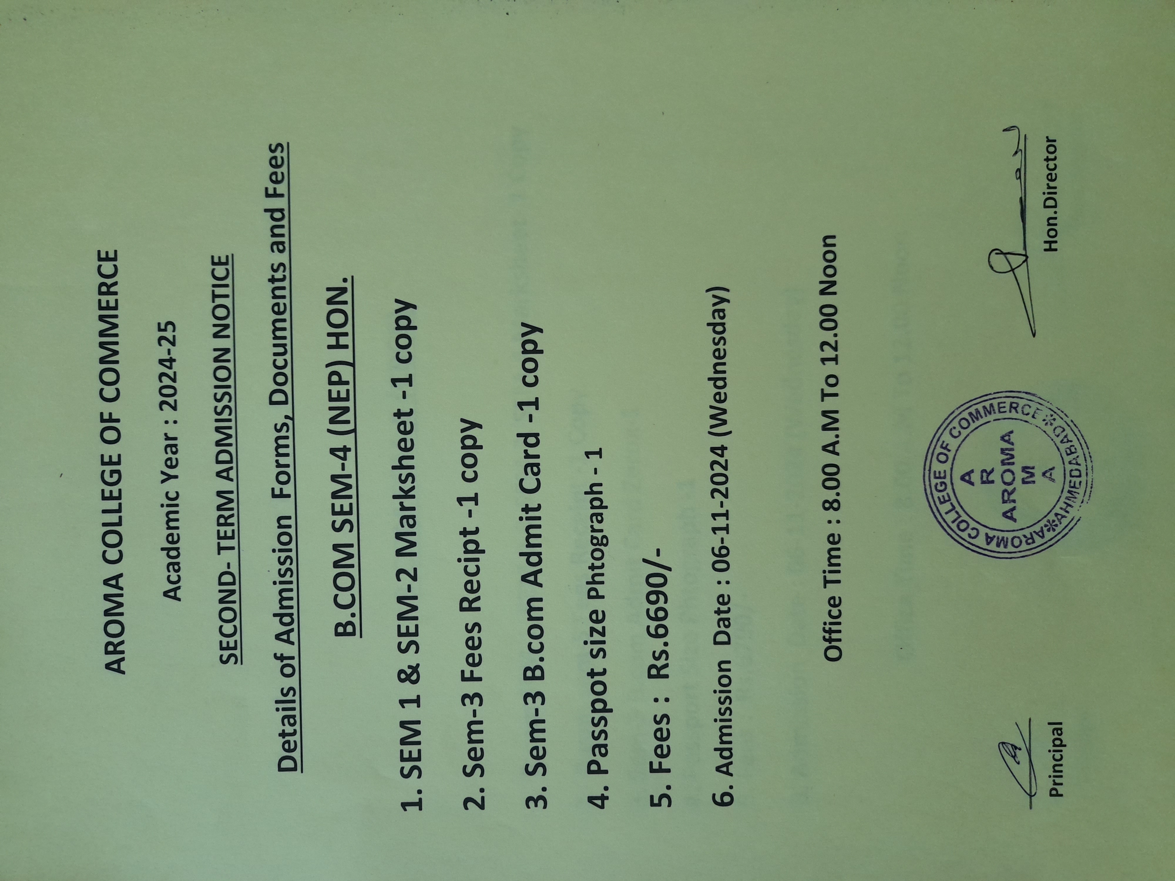 Second Term Admissions notice for Bcom sem-2 NEP - 4 Years HONOURS Degree