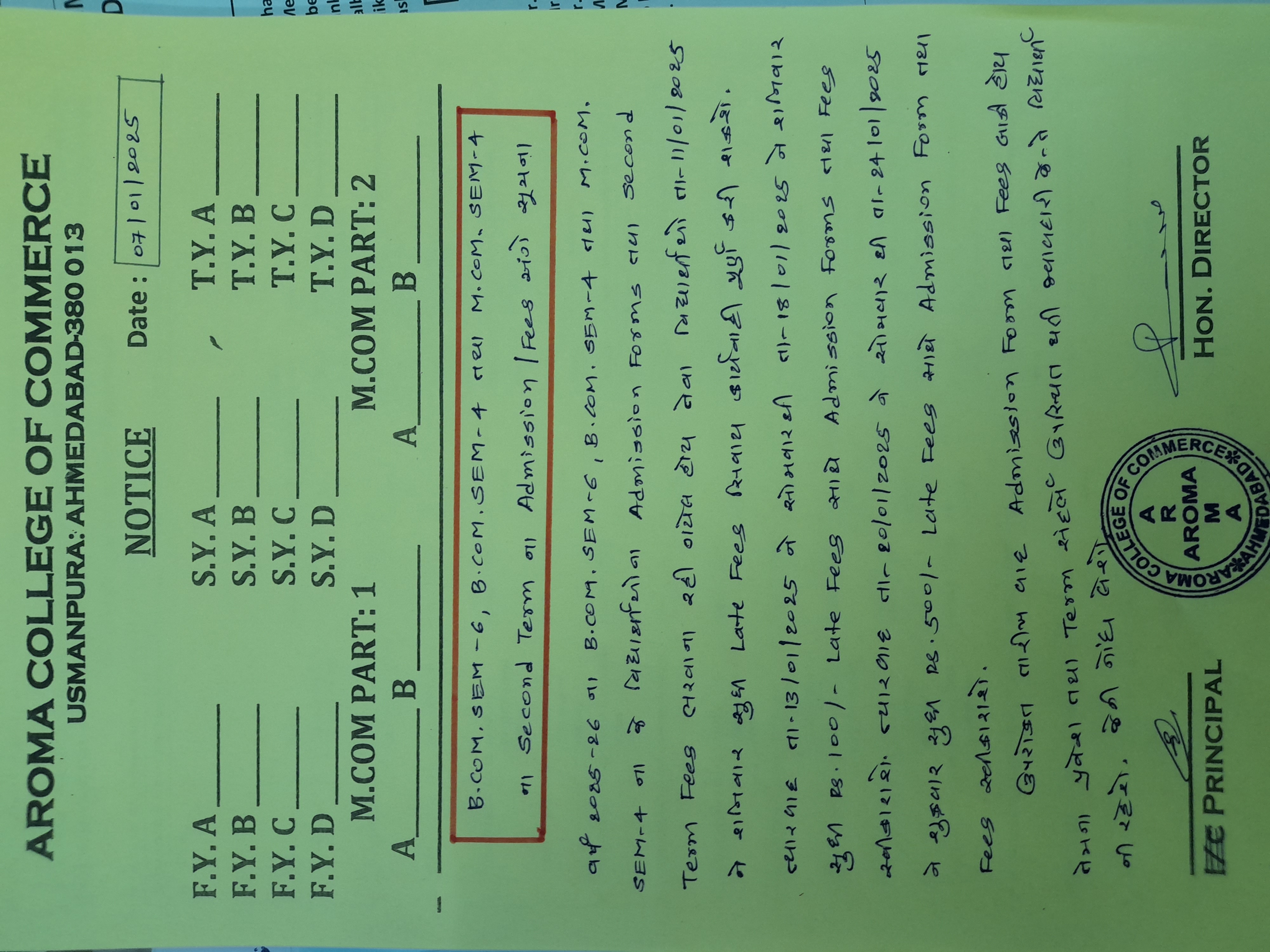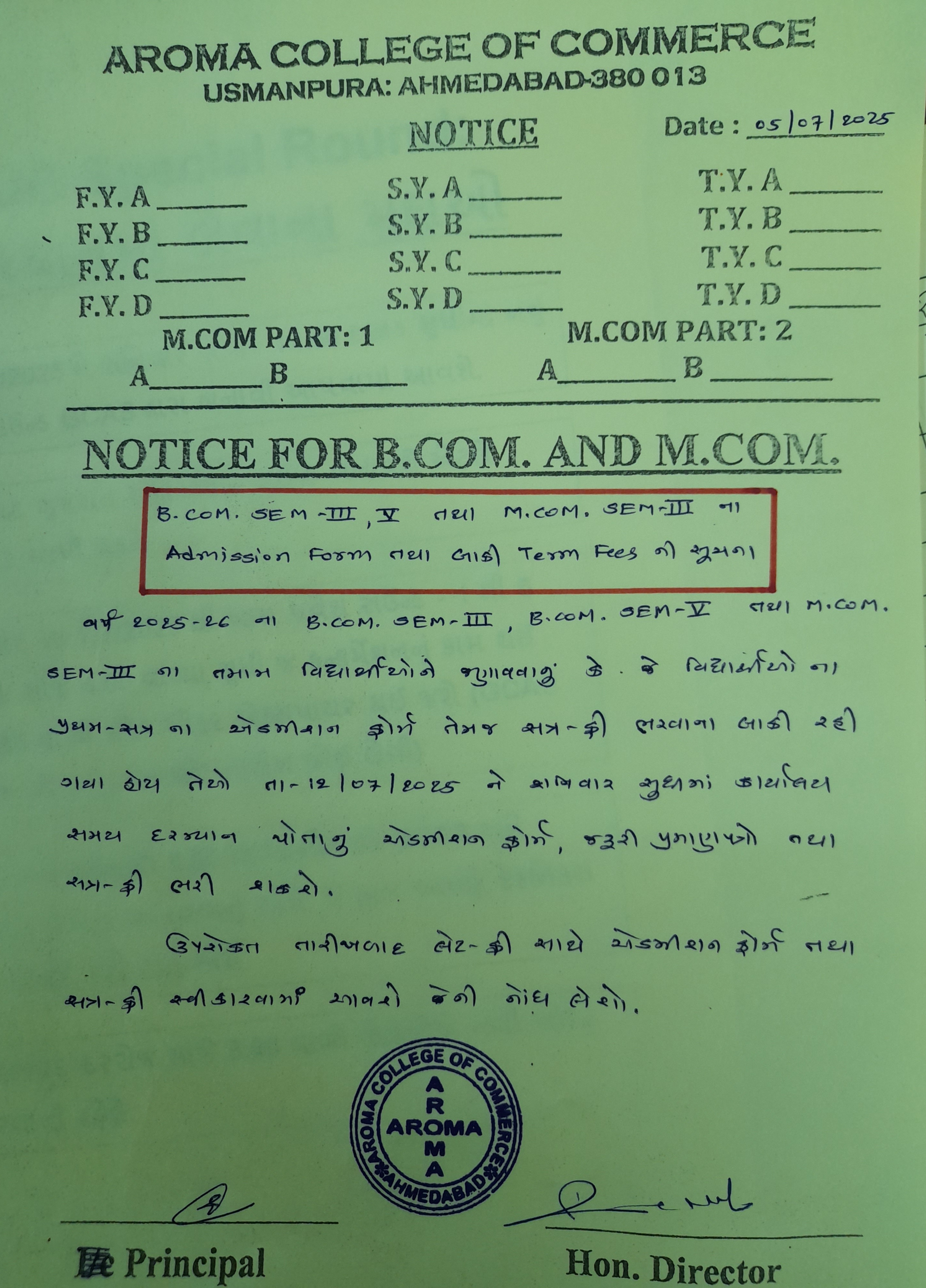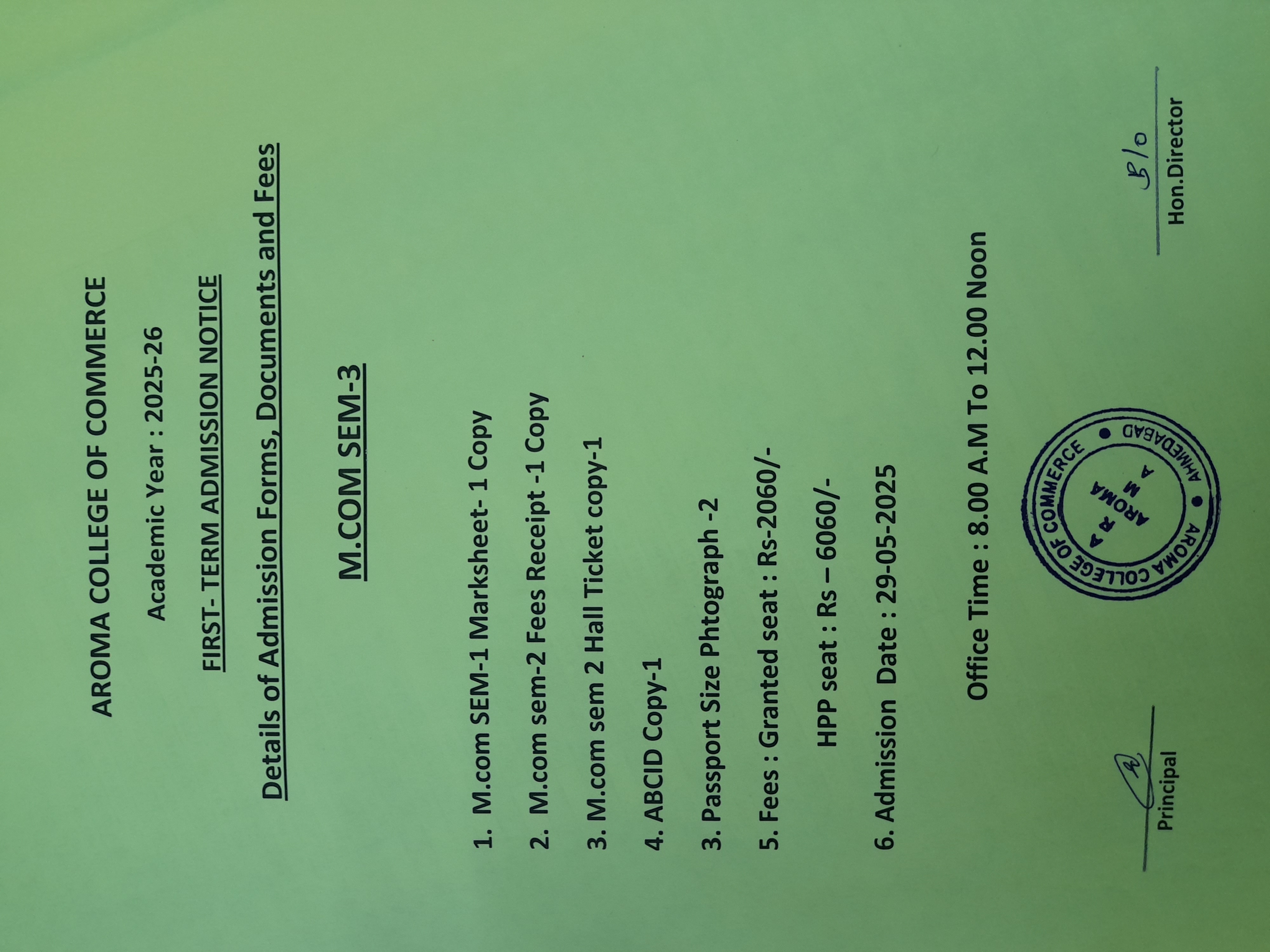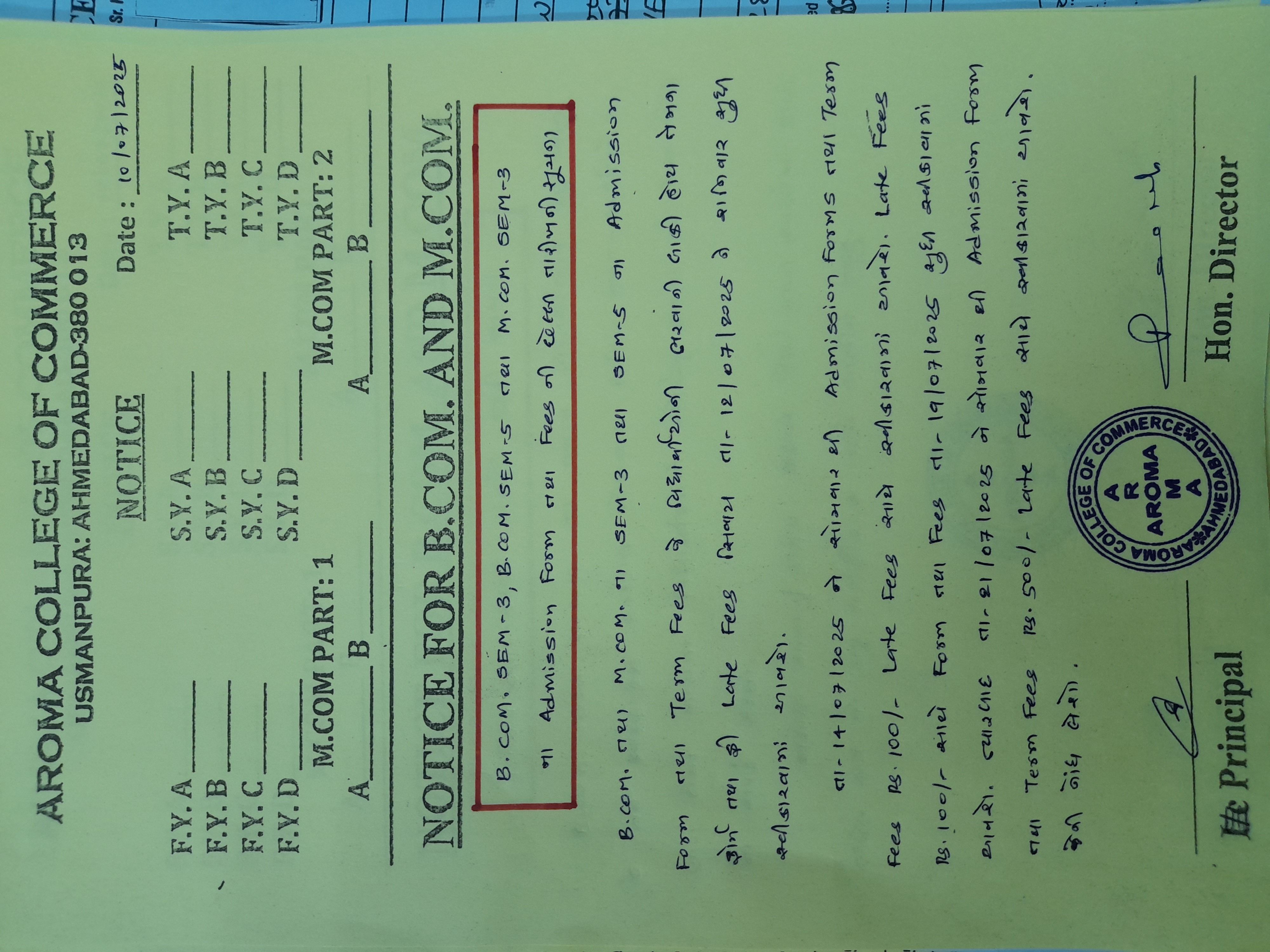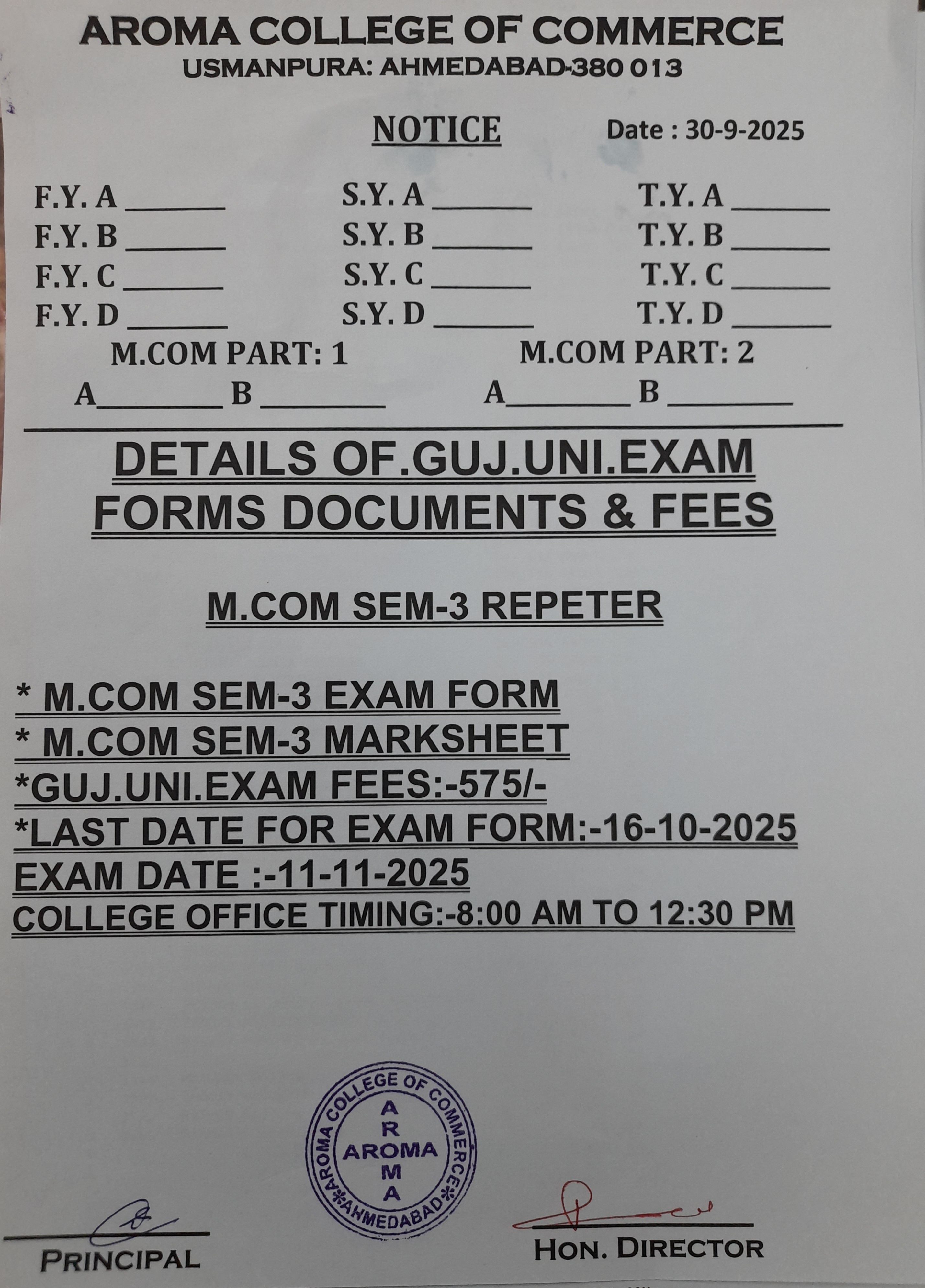 Important Notice: Last date for Admissions Forms and Term Fees with late fees for B.COM.SEM-3 ,B.COM SEM-5 and M.COM SEM-3 will be 02/09/2025 and Considered for Internal Exam starting from 15/09/2025.