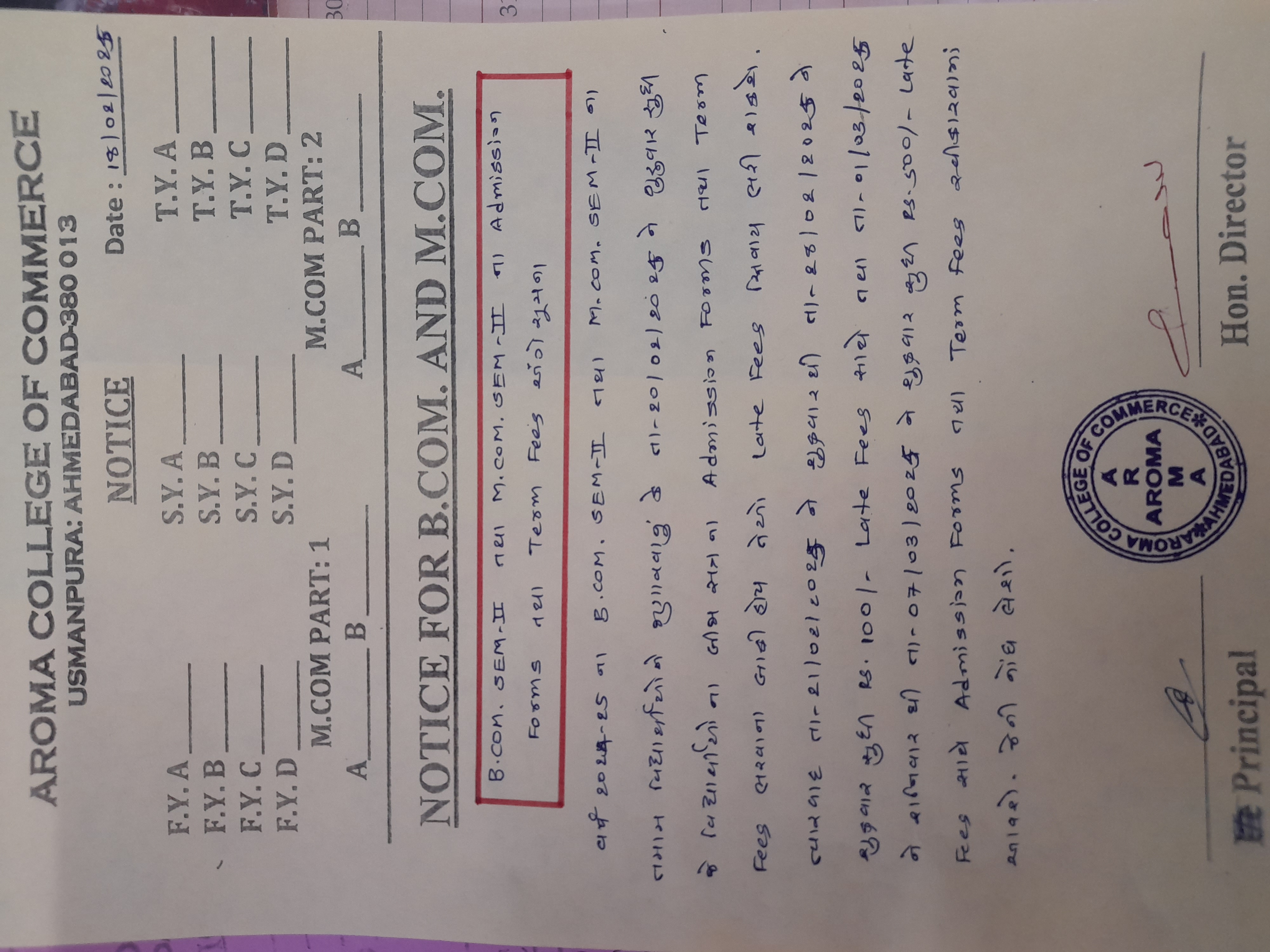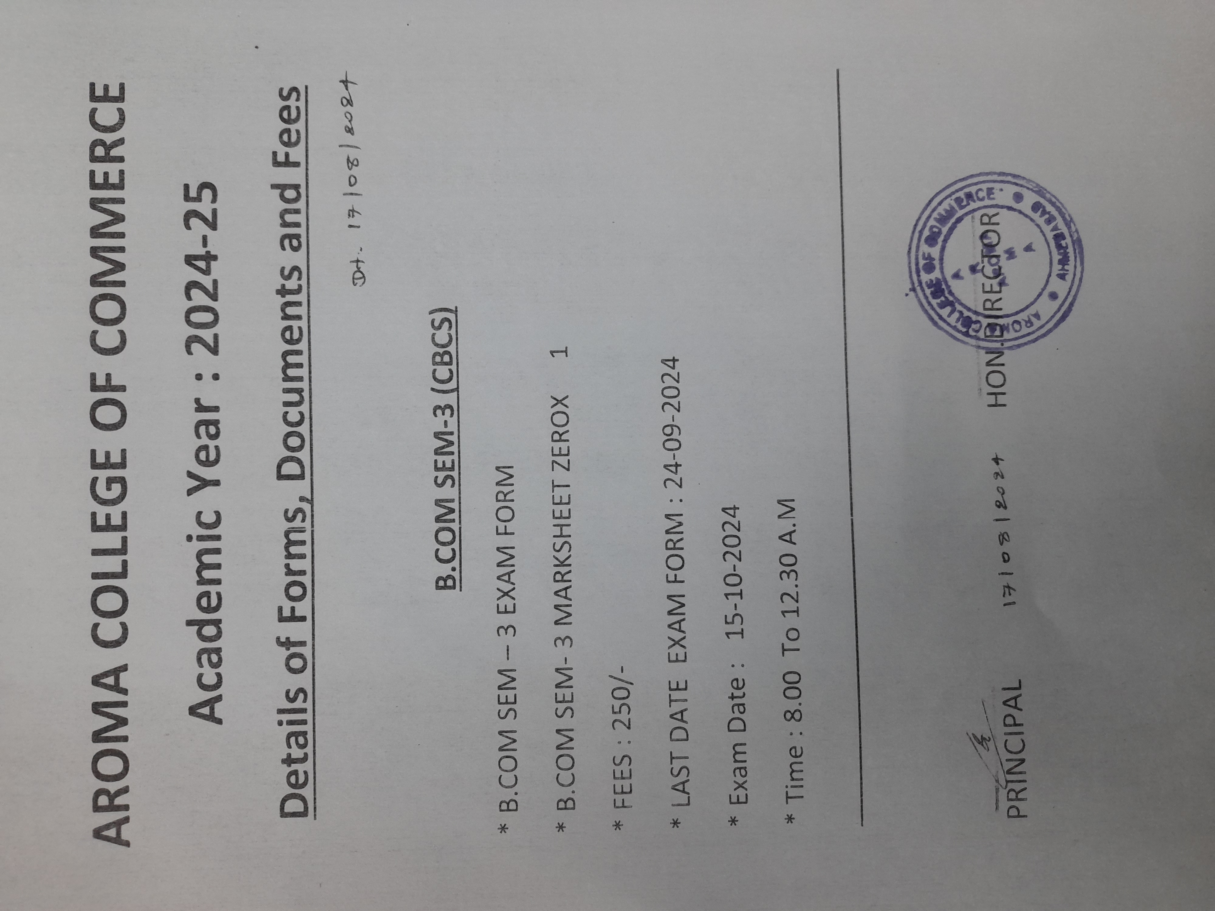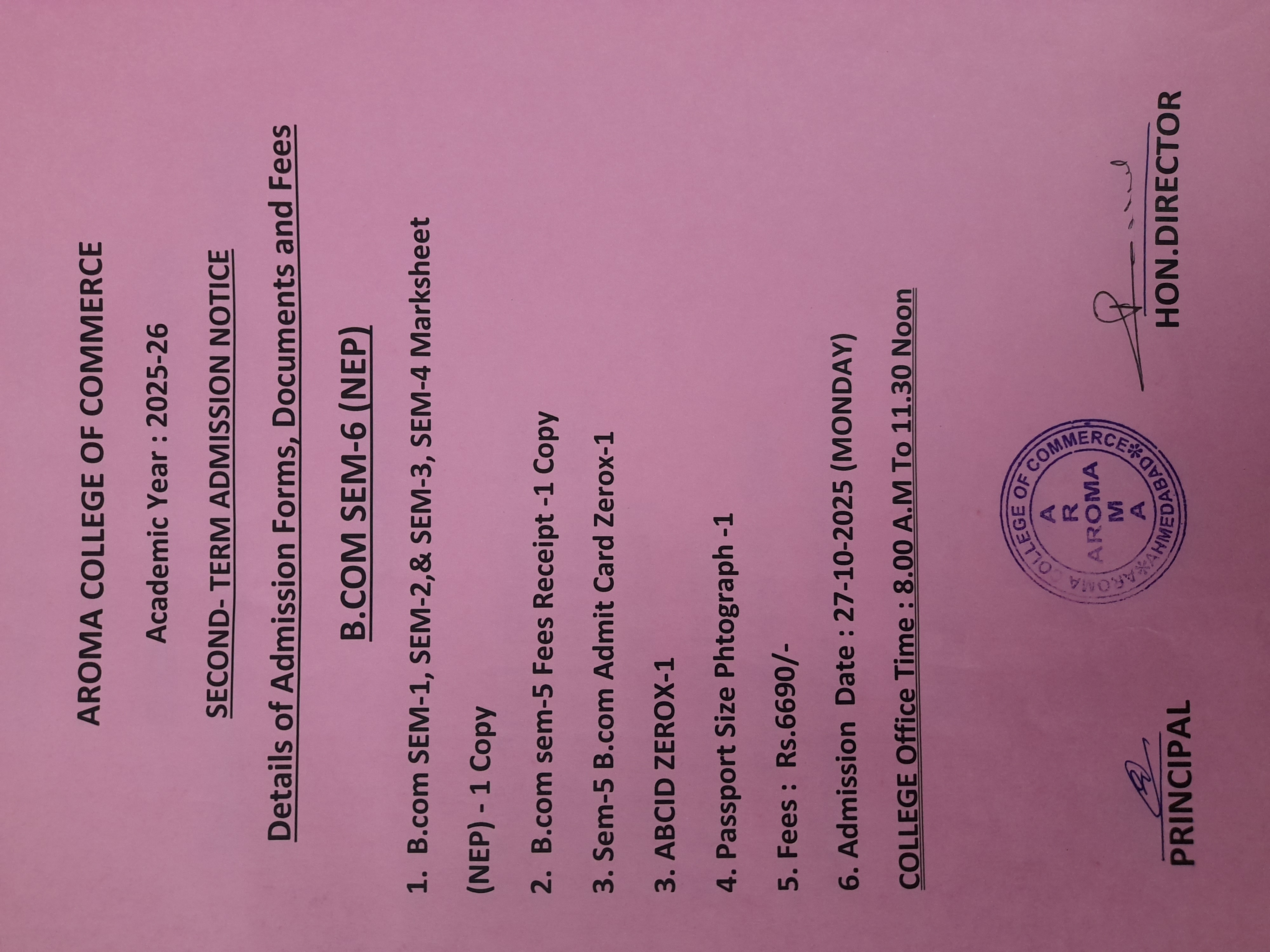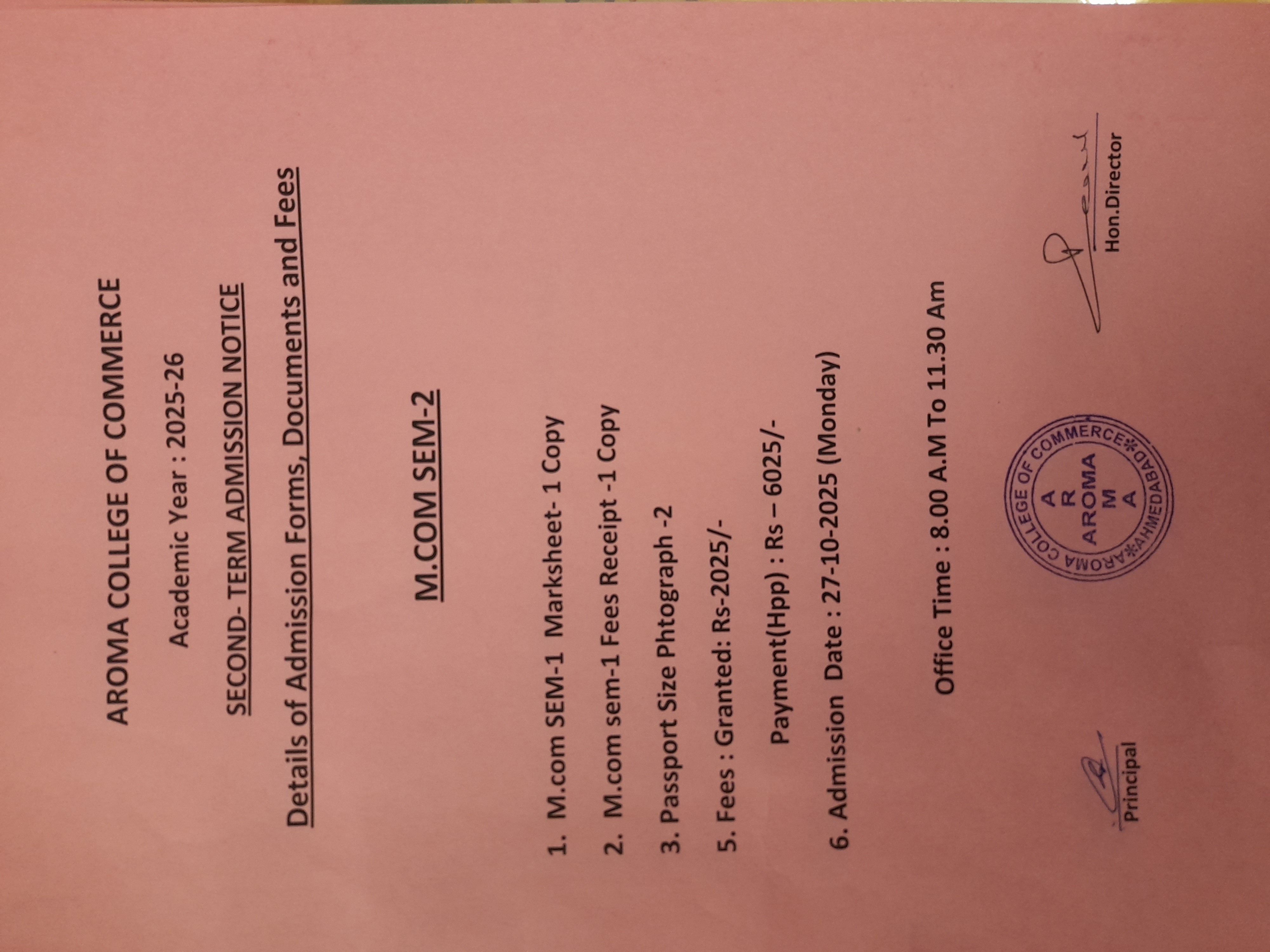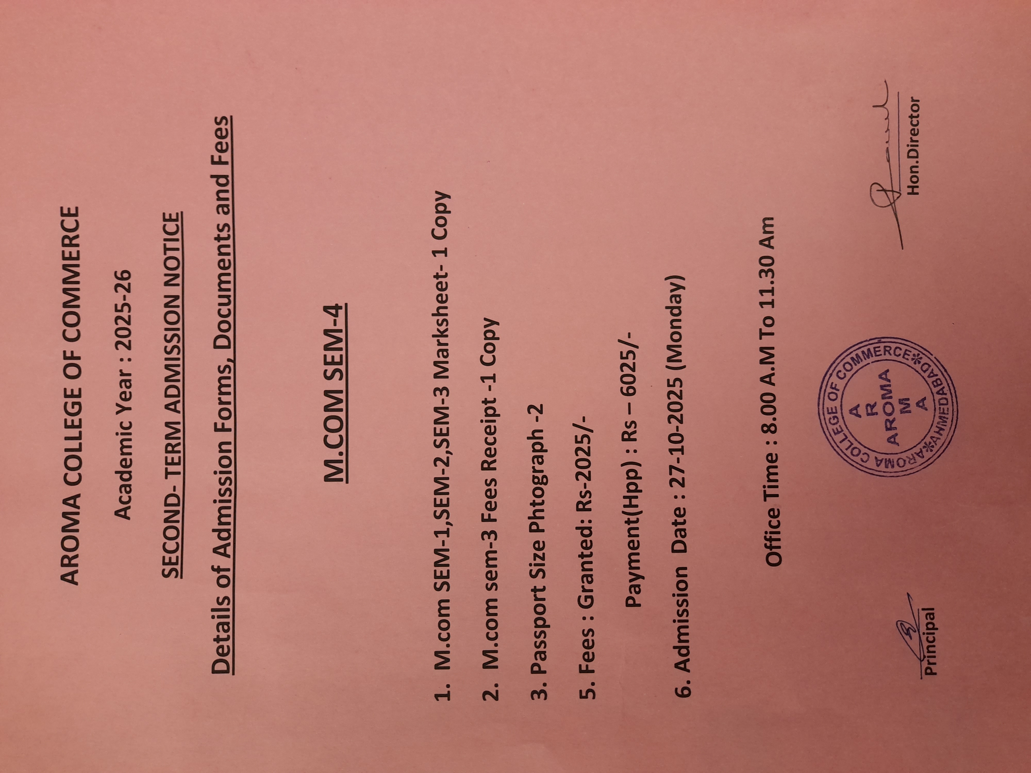 Important Notice: Last date for Admissions Forms and Term Fees with late fees for B.COM.SEM-3 ,B.COM SEM-5 and M.COM SEM-3 will be 02/09/2025 and Considered for Internal Exam starting from 15/09/2025.