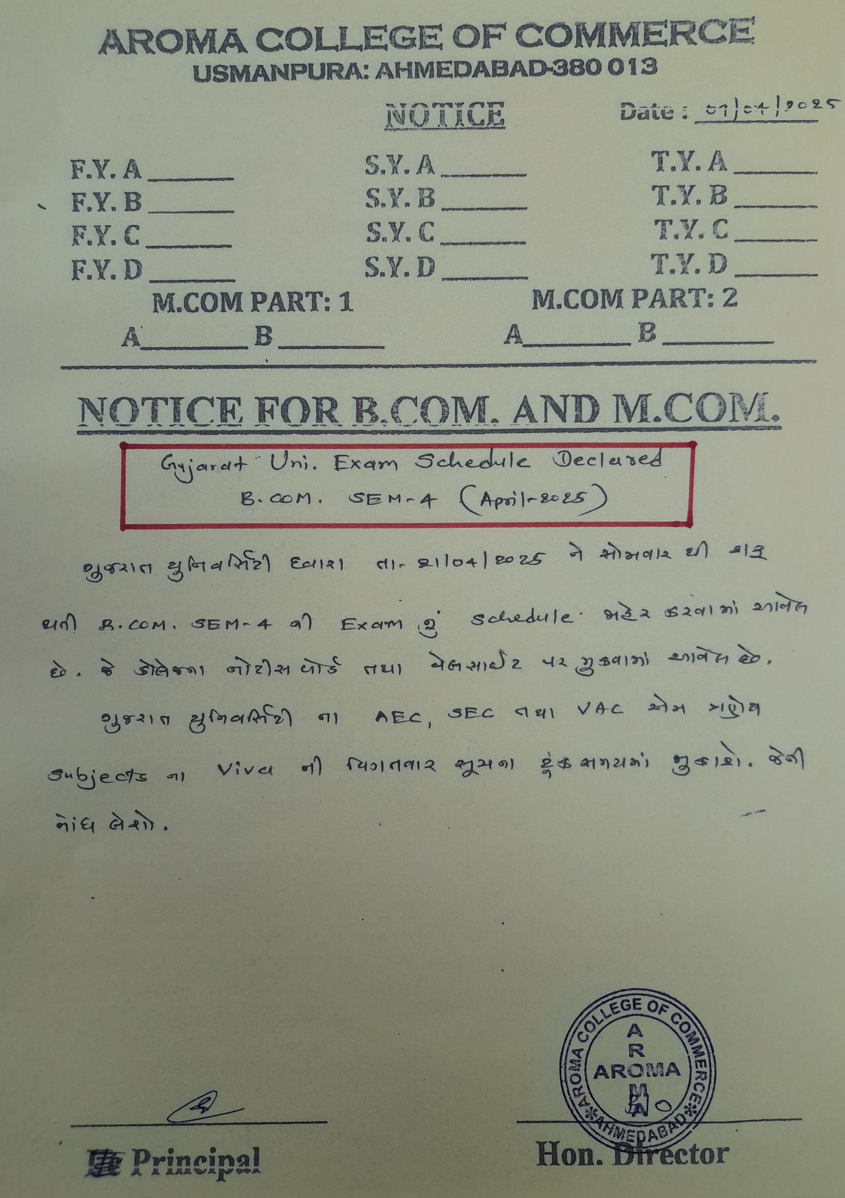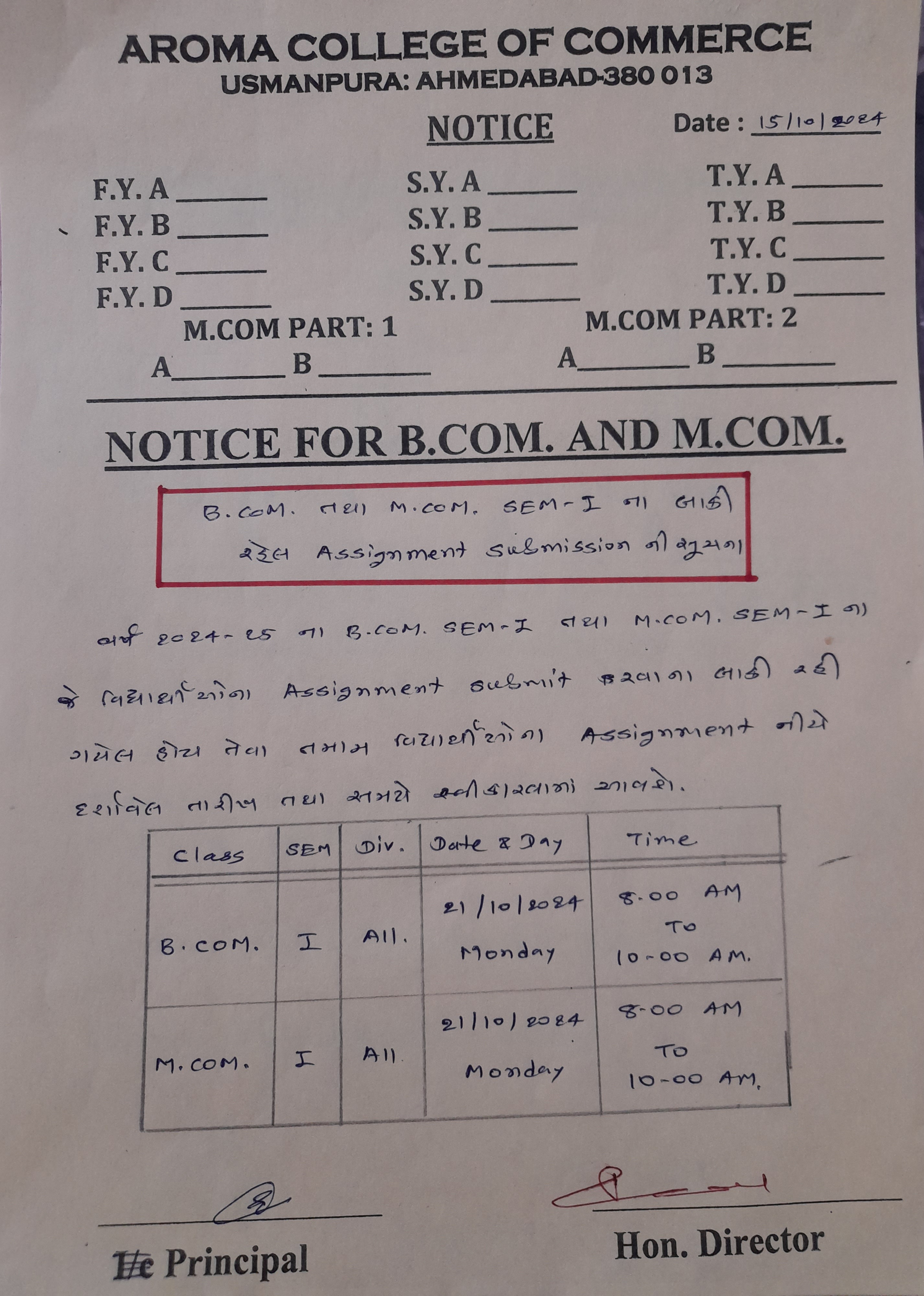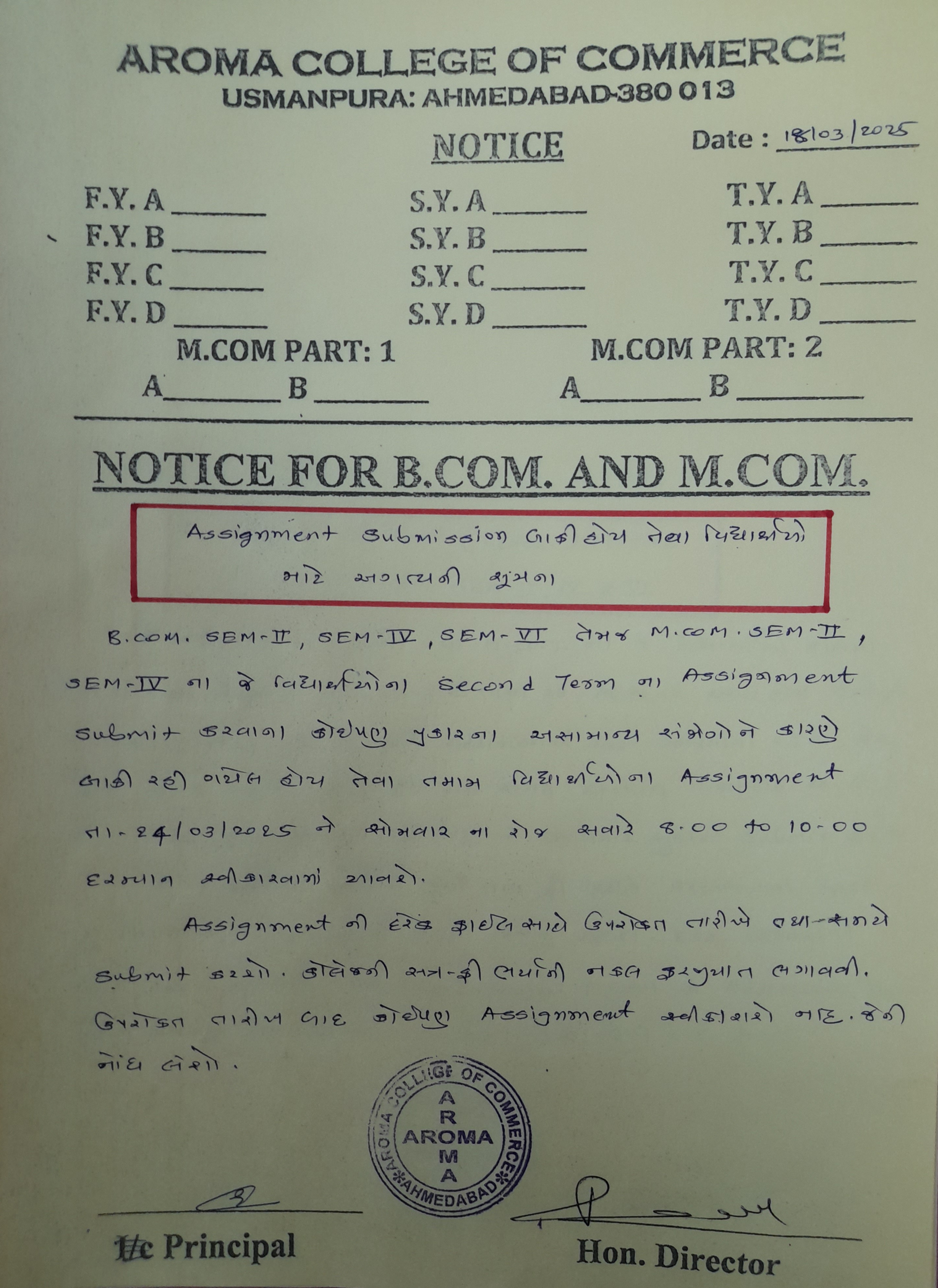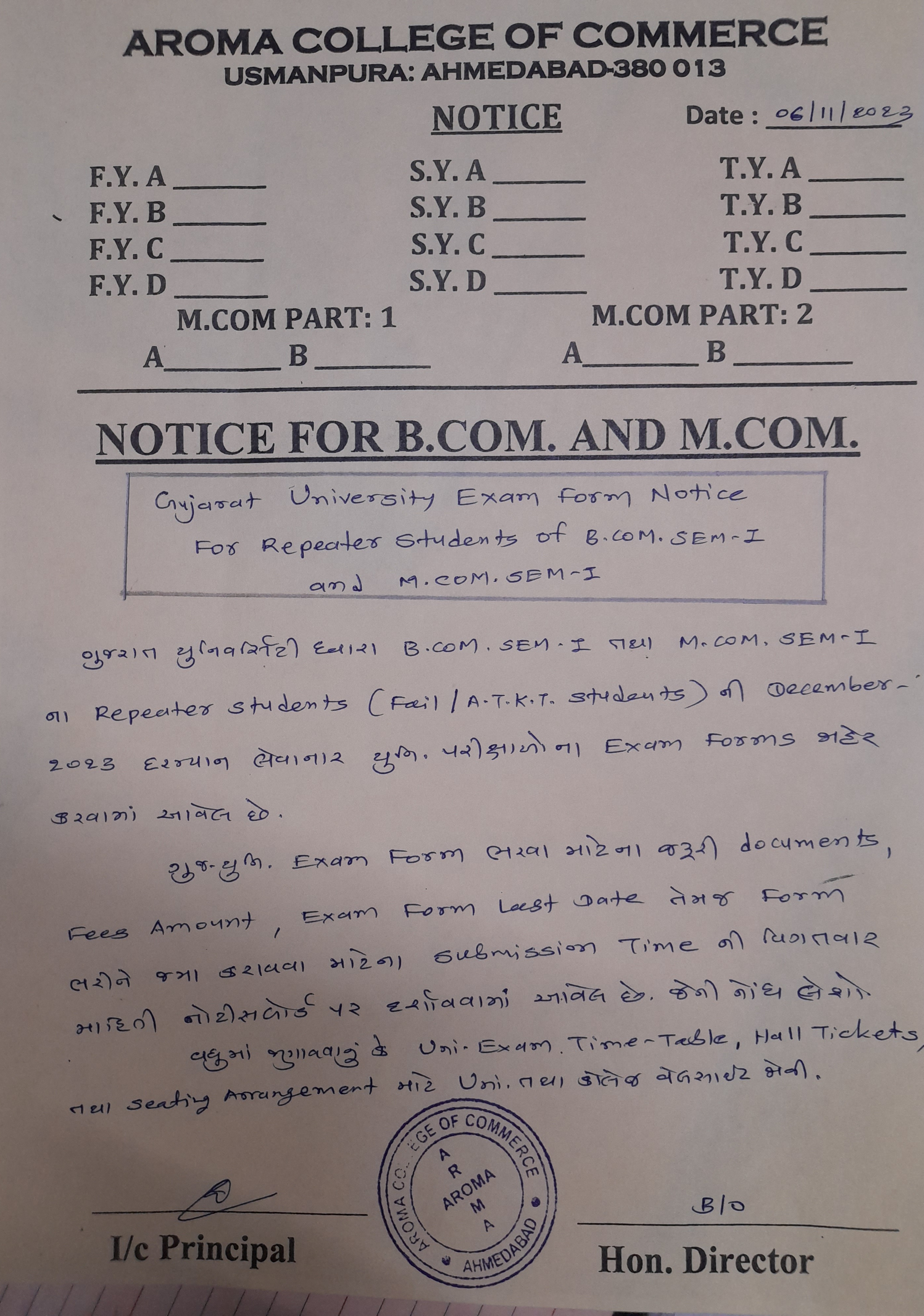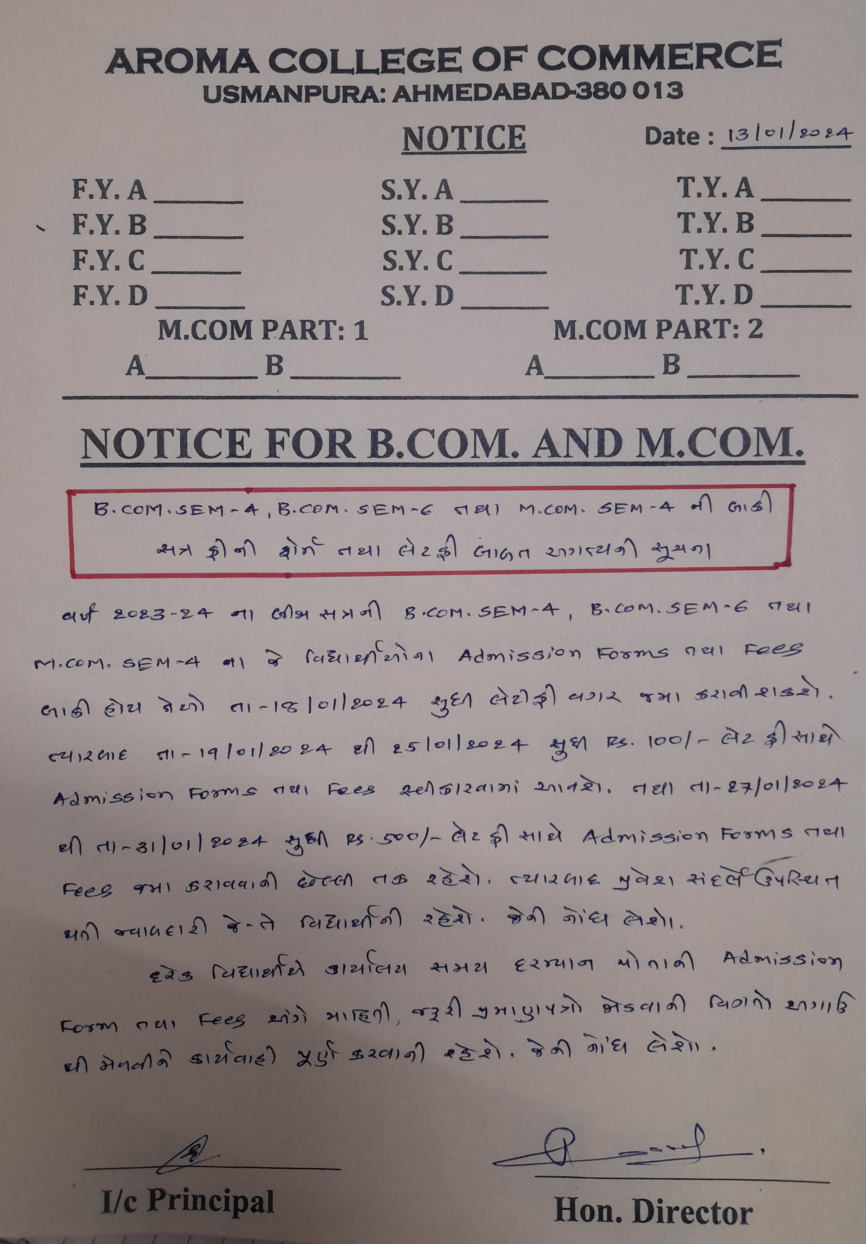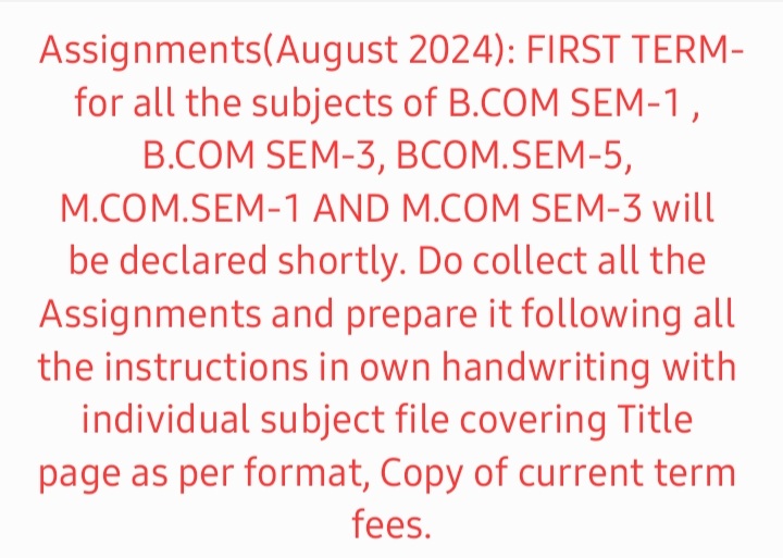 Important Notice: (1) B.com sem-1 Guj Uni Exam Forms for Regular and Repeater students will be declared on website as and when notified. (2)M.com sem-1 Guj Uni Exam Forms for Regular and Repeater students will also be declared on website as and when notified. (3)Assignments submission dates for B.com sem4 ,Bcom sem-6 and Mcom sem-4 will be declared shortly. (4)Do attend online classes regularly. (5) Admission Forms and fees process will complete in current month with late fees.