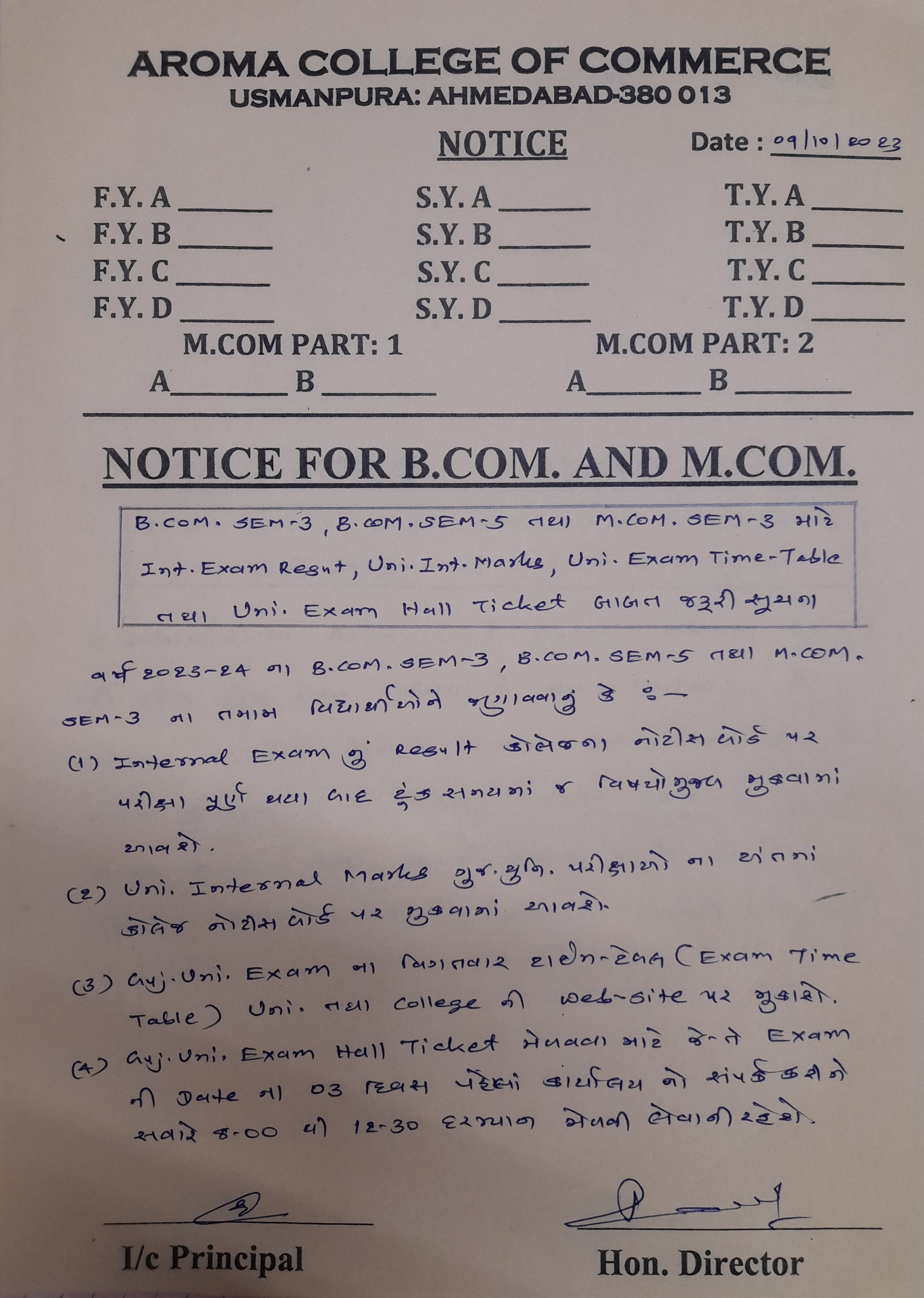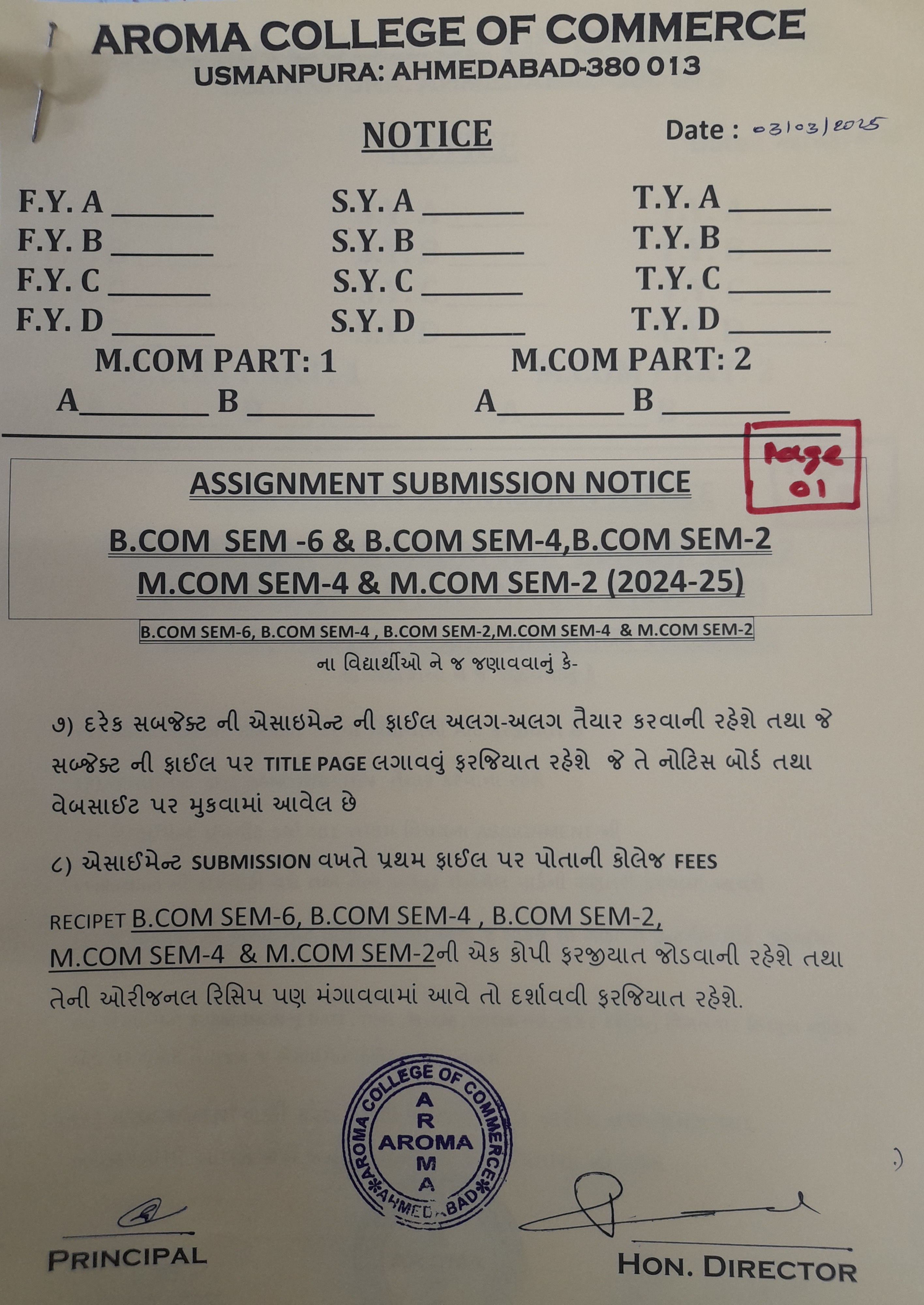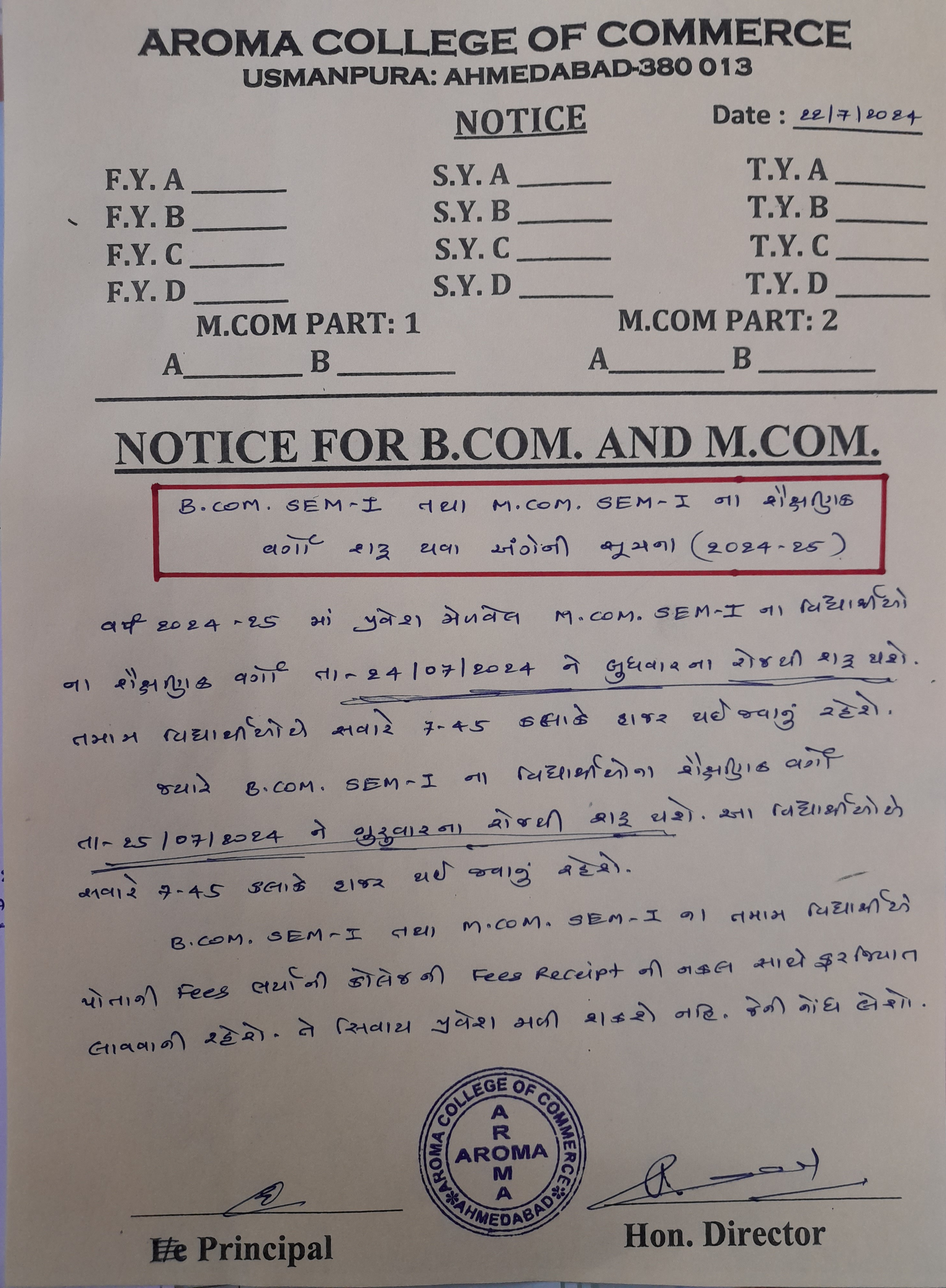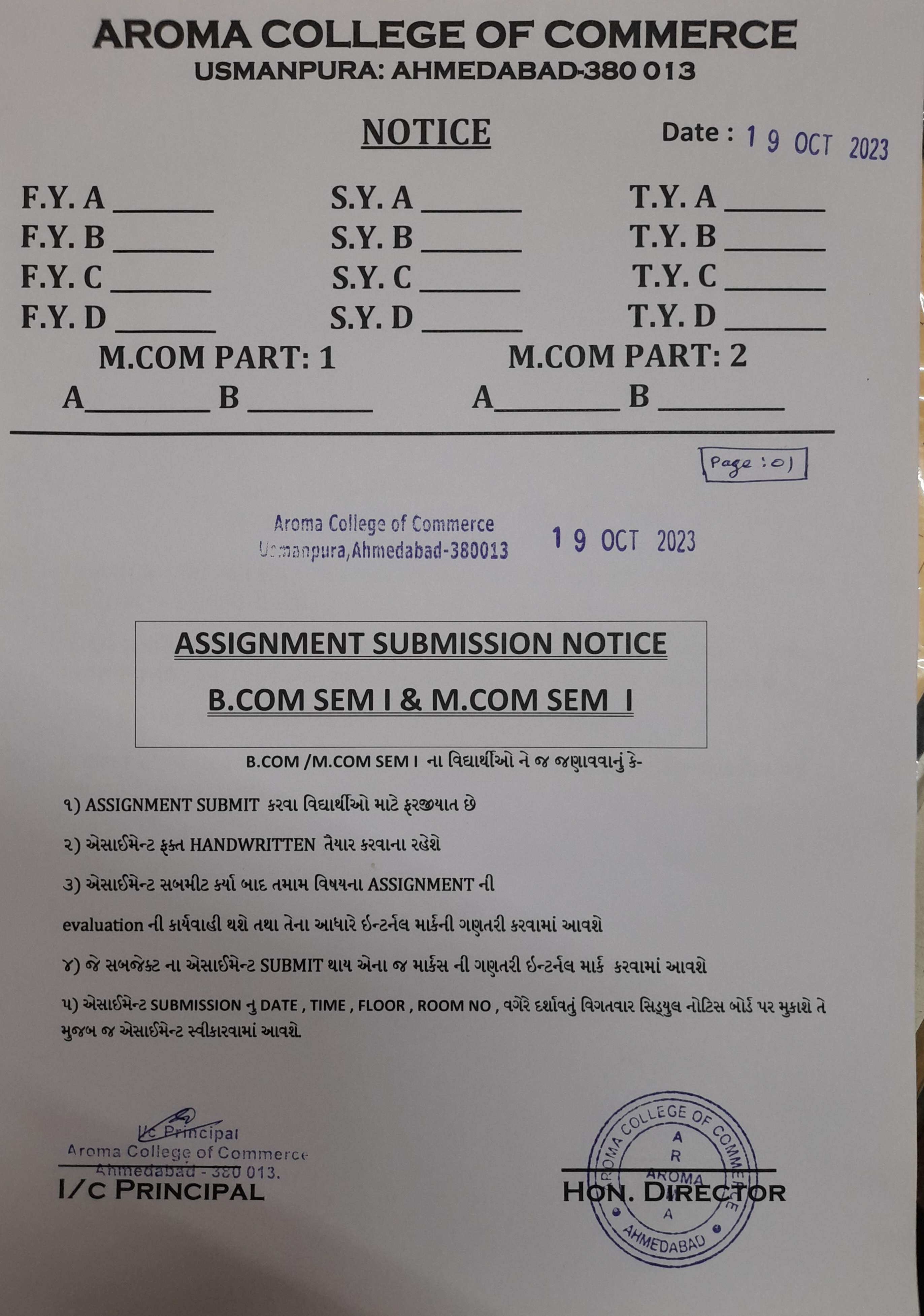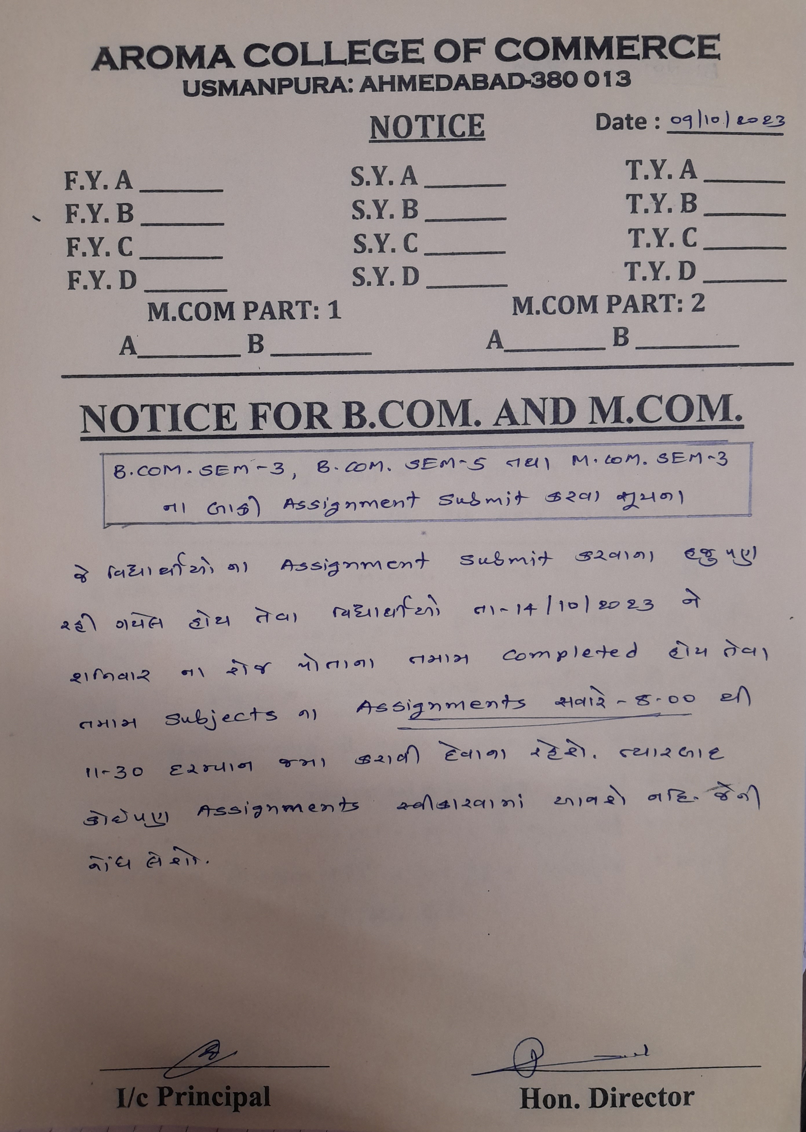 Important Notice: (1) B.com sem-1 Guj Uni Exam Forms for Regular and Repeater students will be declared on website as and when notified. (2)M.com sem-1 Guj Uni Exam Forms for Regular and Repeater students will also be declared on website as and when notified. (3)Assignments submission dates for B.com sem4 ,Bcom sem-6 and Mcom sem-4 will be declared shortly. (4)Do attend online classes regularly. (5) Admission Forms and fees process will complete in current month with late fees.
