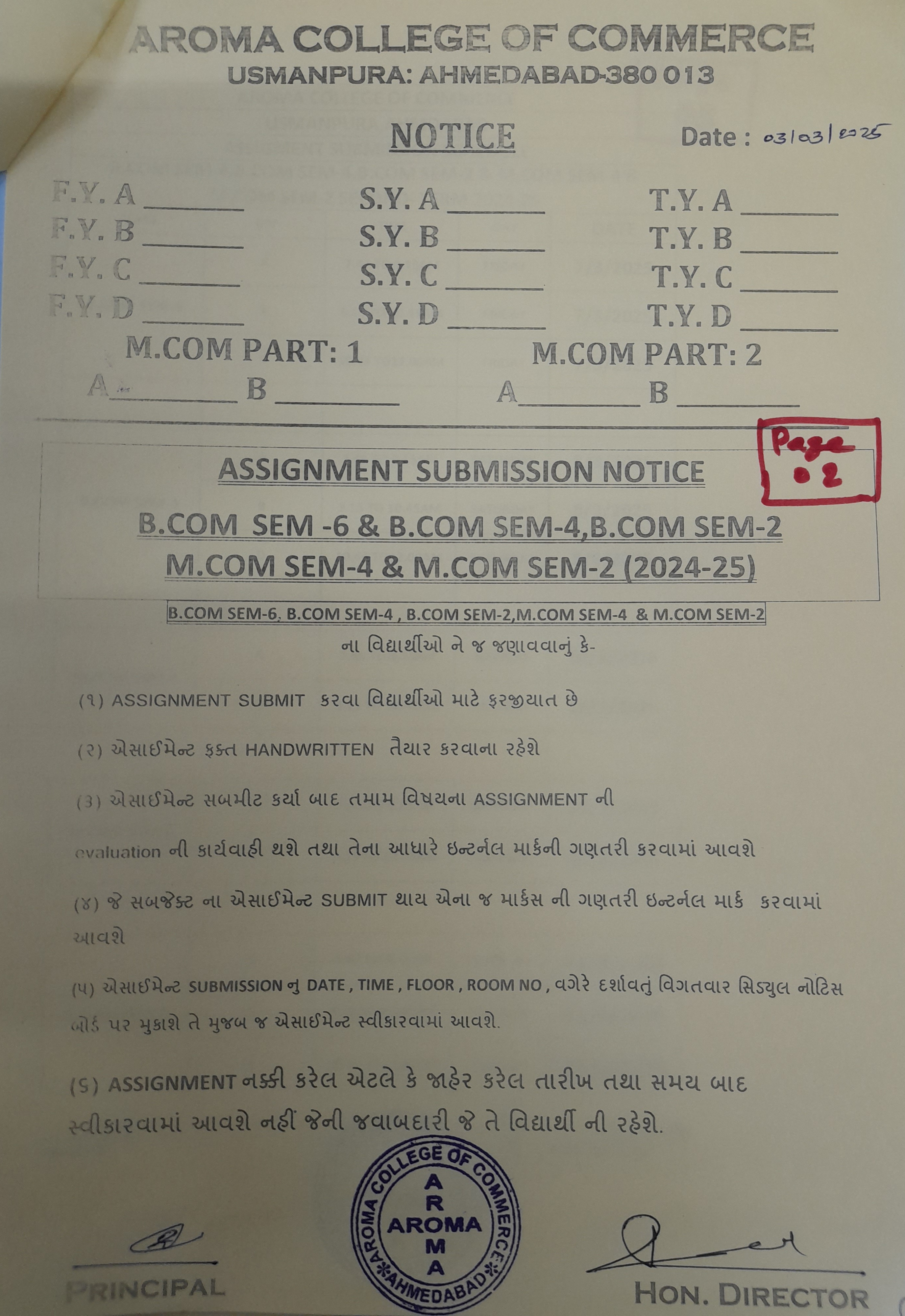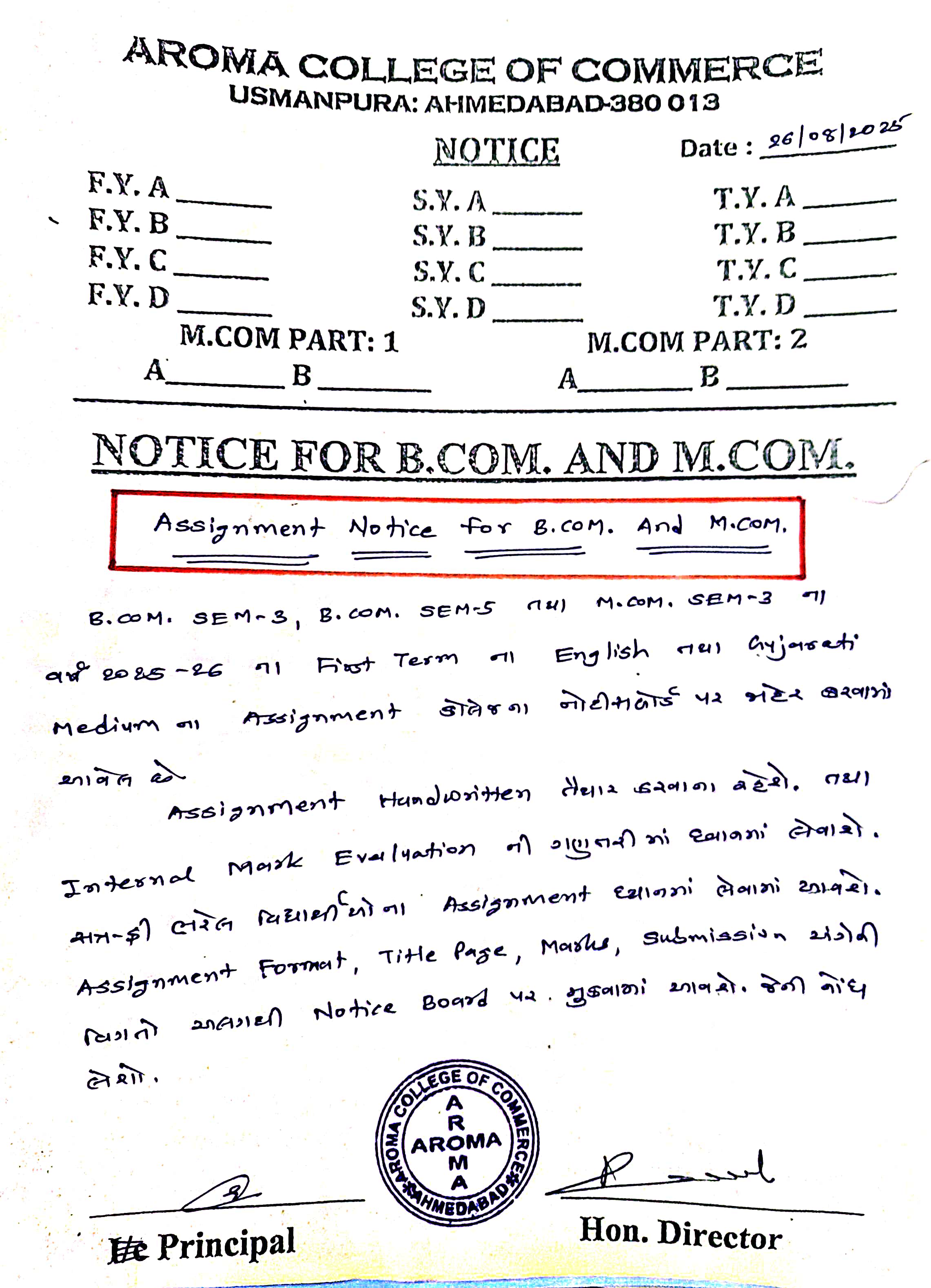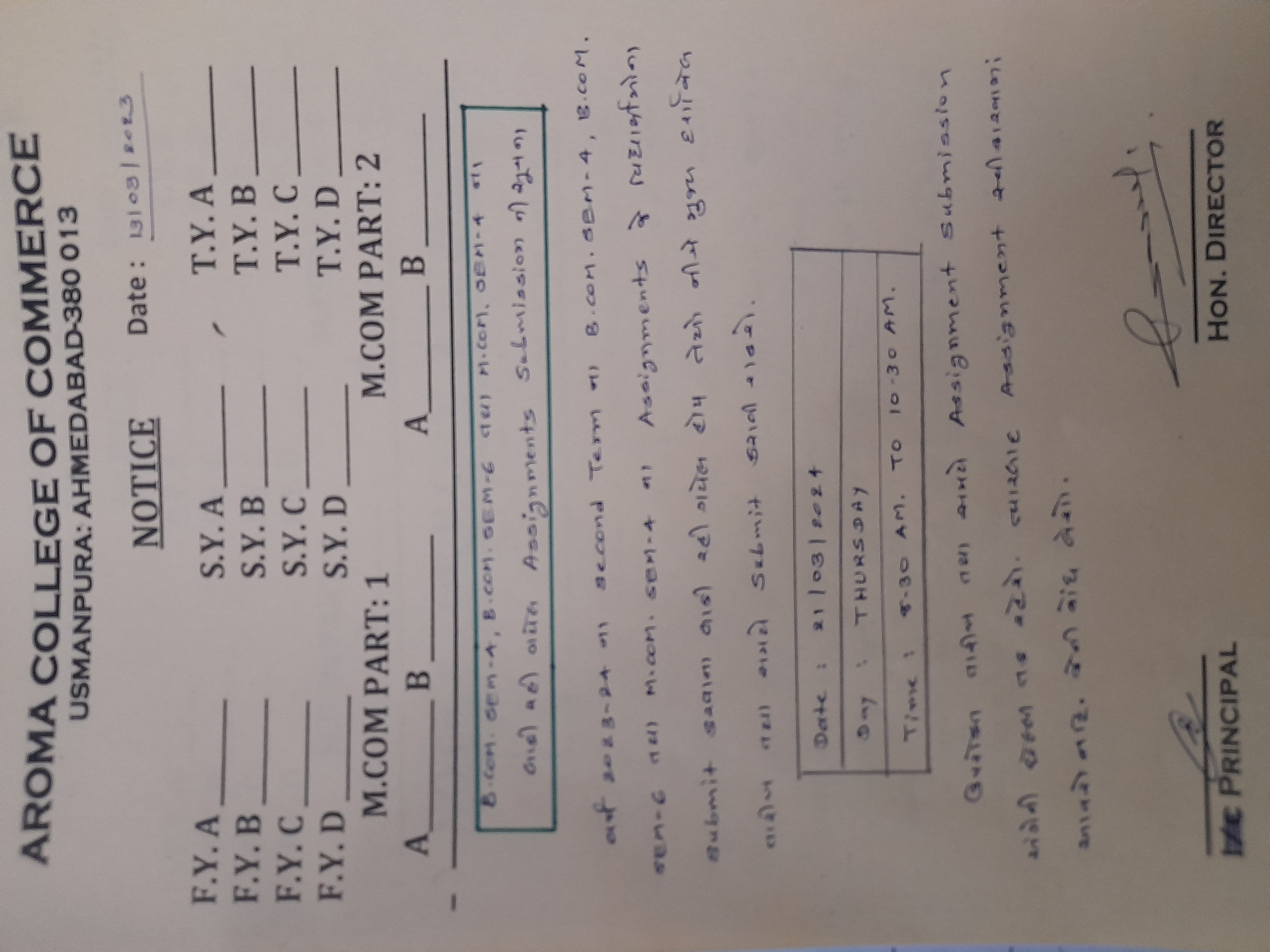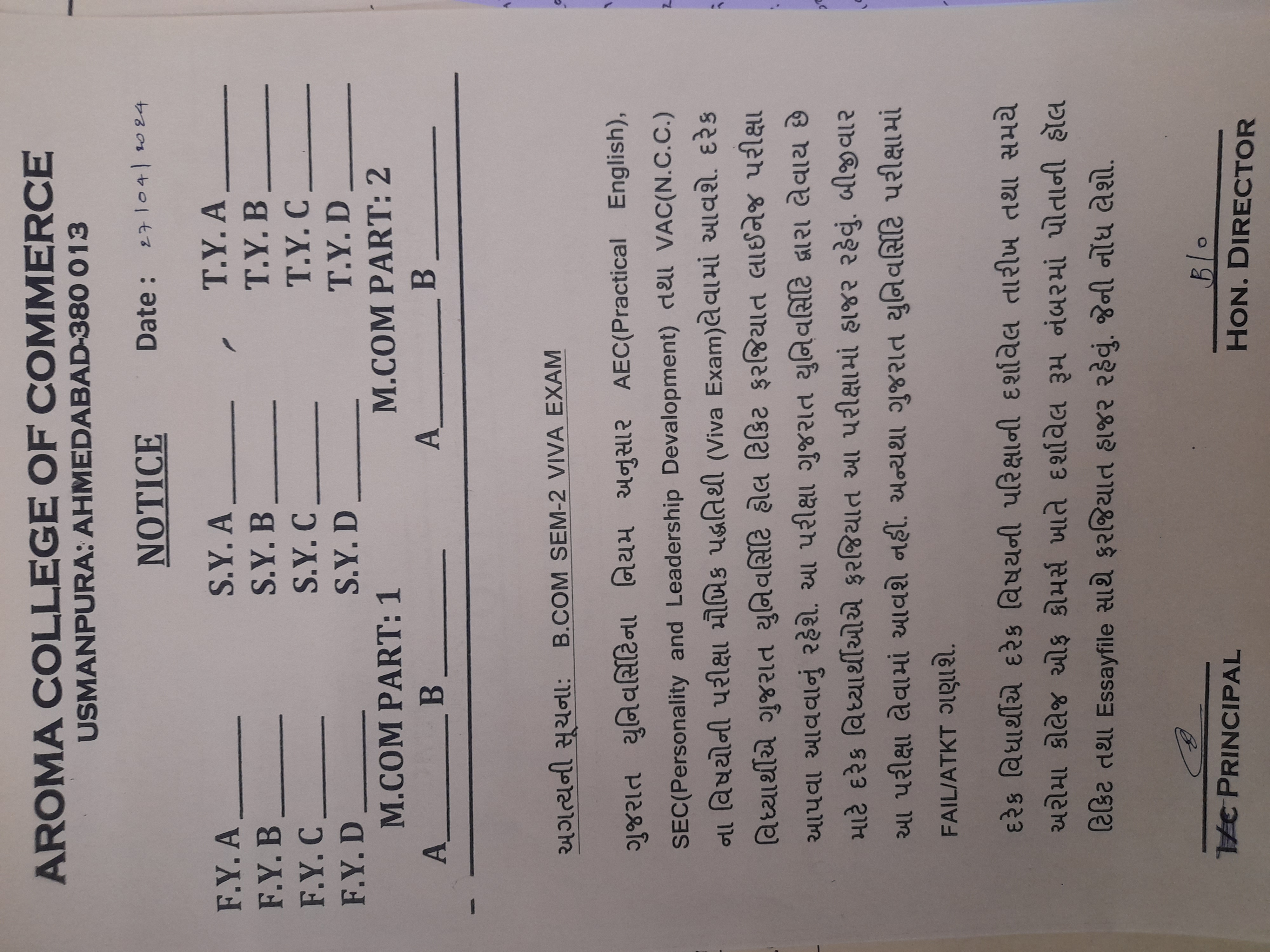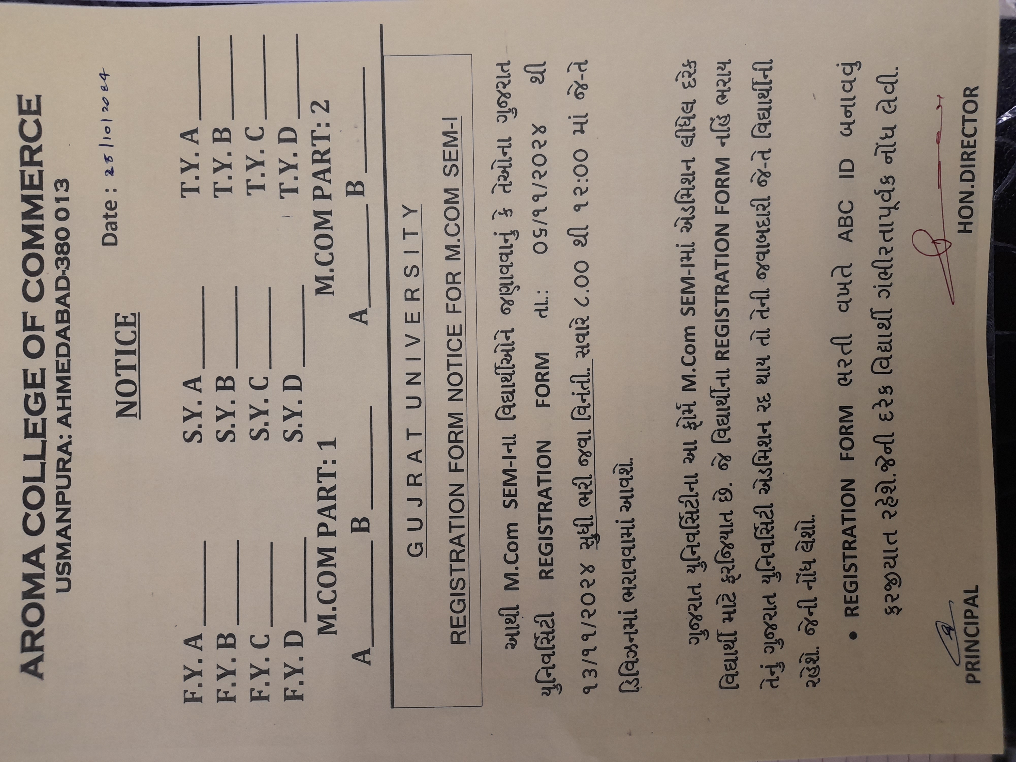 Important Notice: (1) B.com sem-1 Guj Uni Exam Forms for Regular and Repeater students will be declared on website as and when notified. (2)M.com sem-1 Guj Uni Exam Forms for Regular and Repeater students will also be declared on website as and when notified. (3)Assignments submission dates for B.com sem4 ,Bcom sem-6 and Mcom sem-4 will be declared shortly. (4)Do attend online classes regularly. (5) Admission Forms and fees process will complete in current month with late fees.