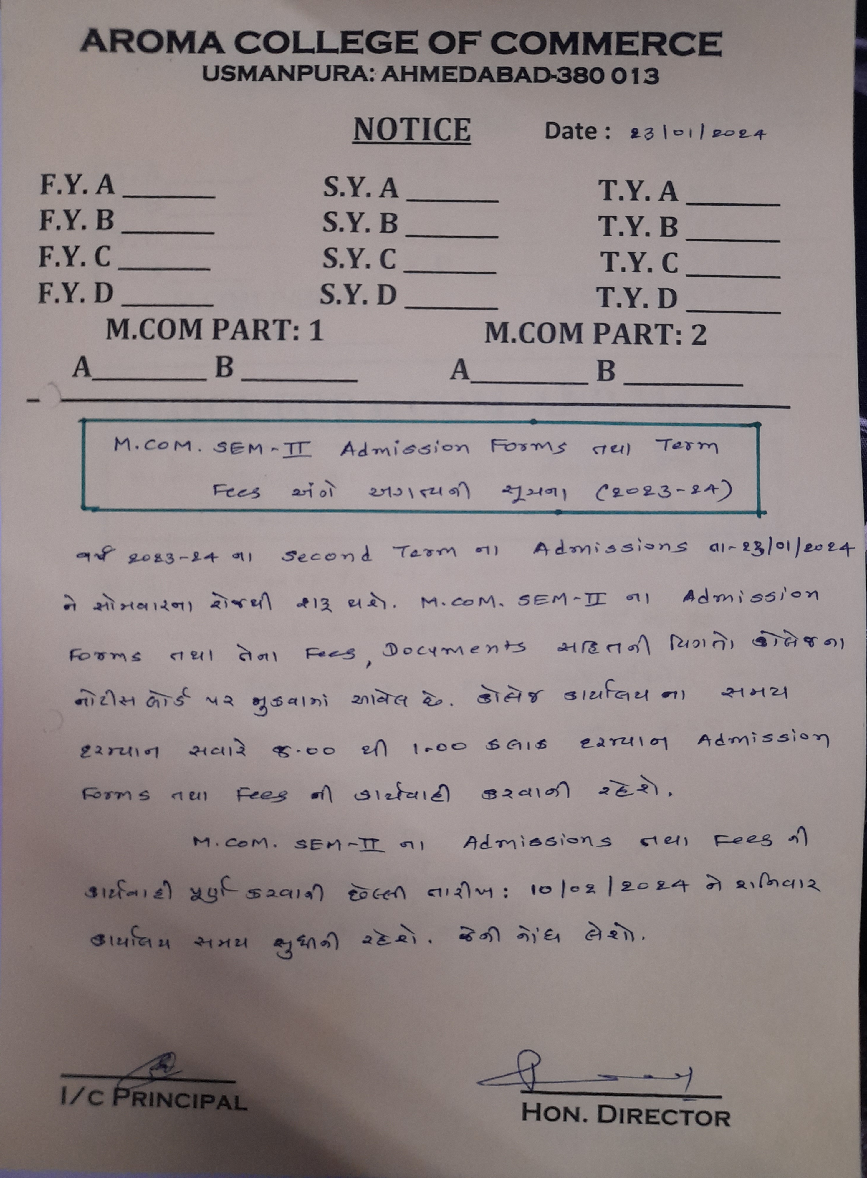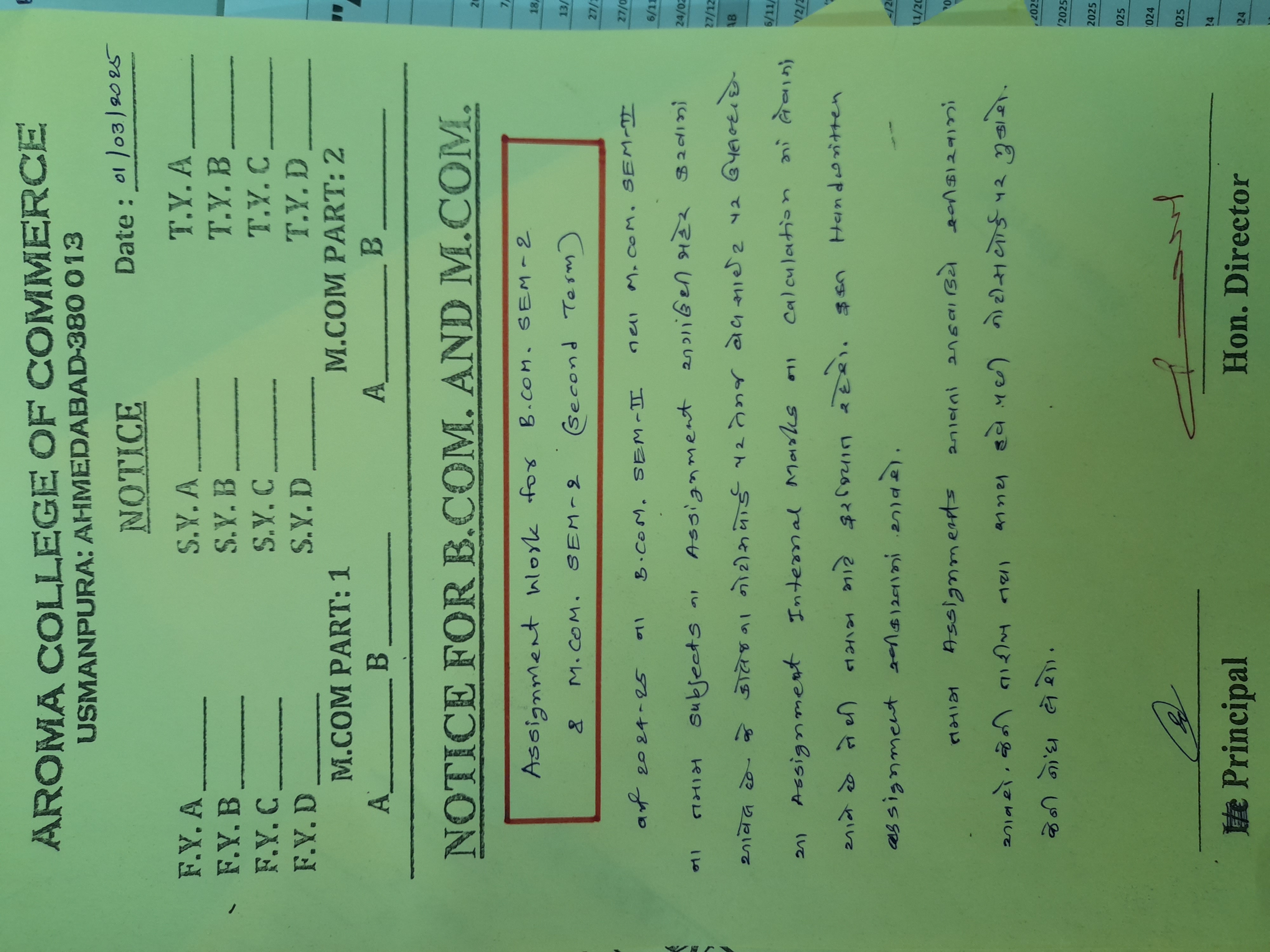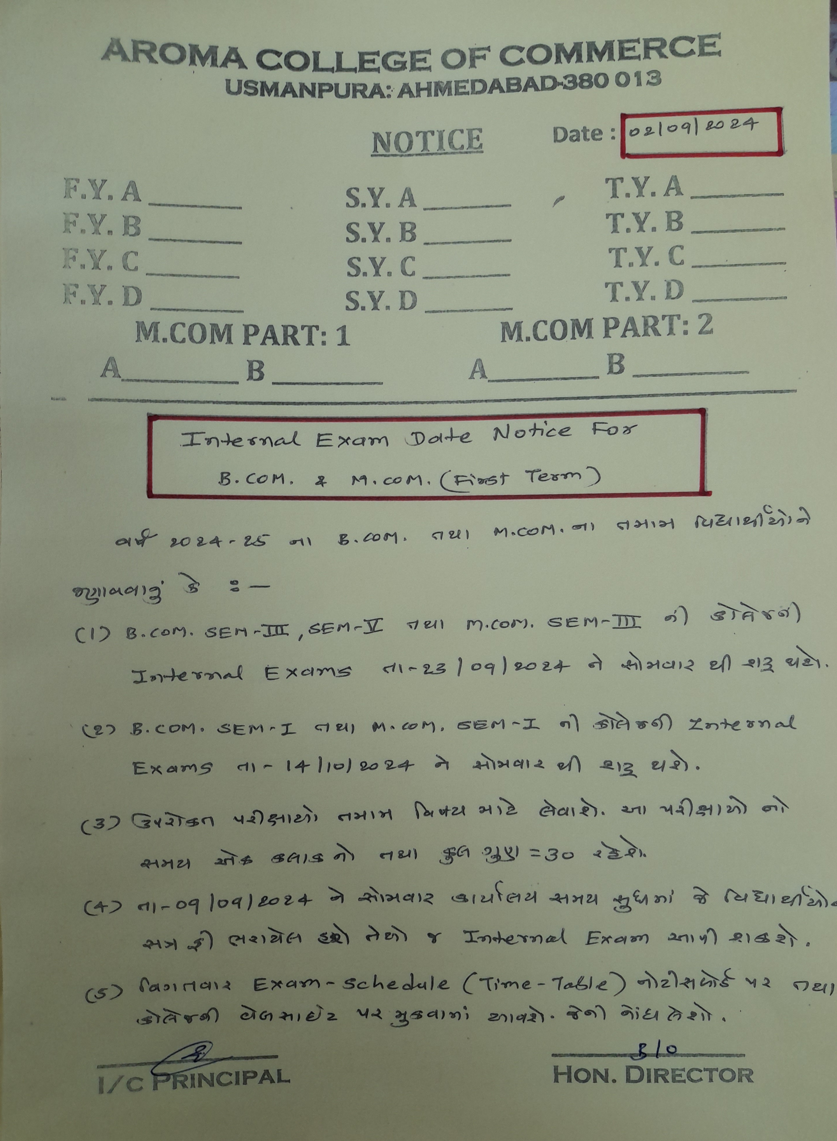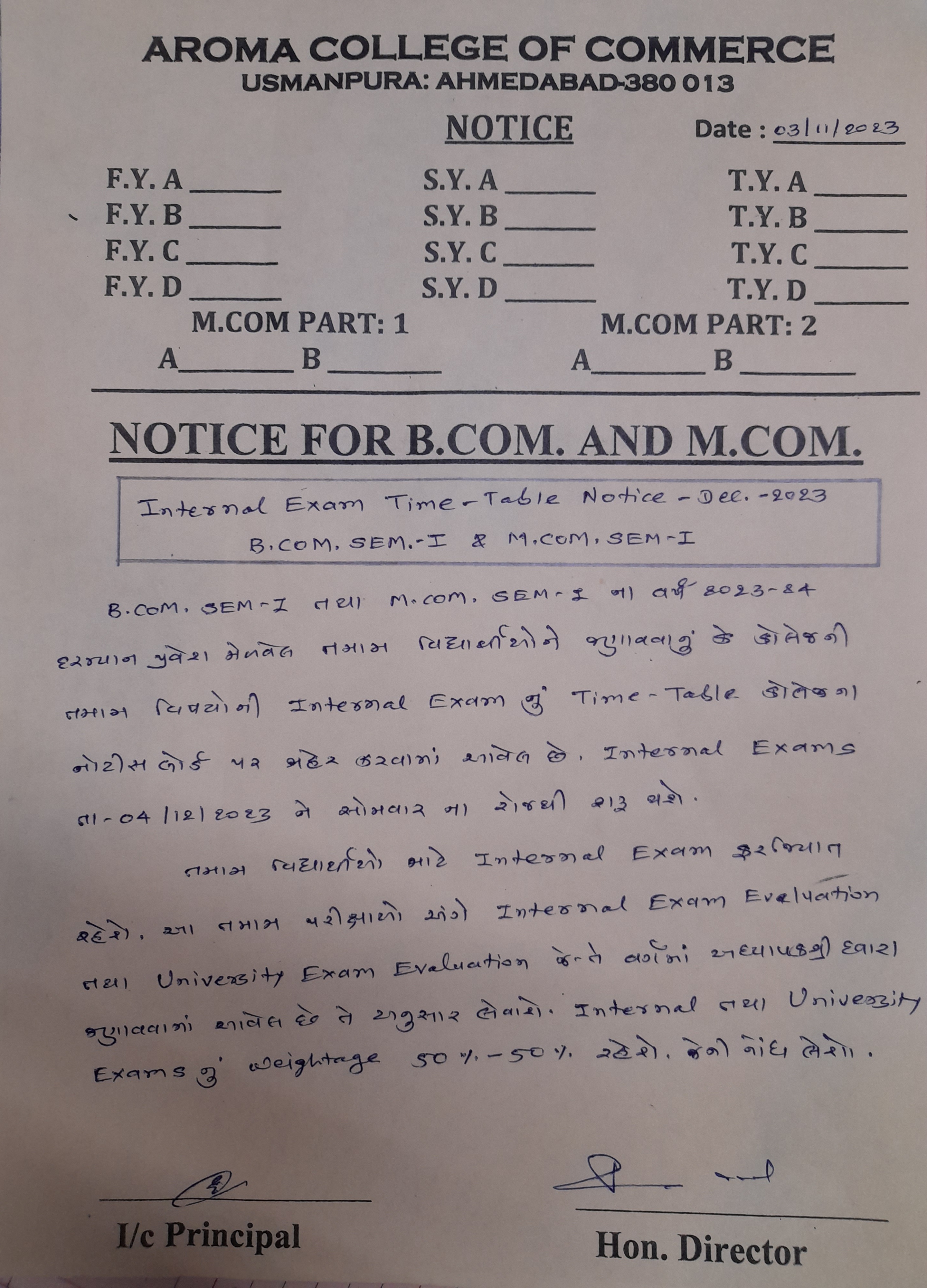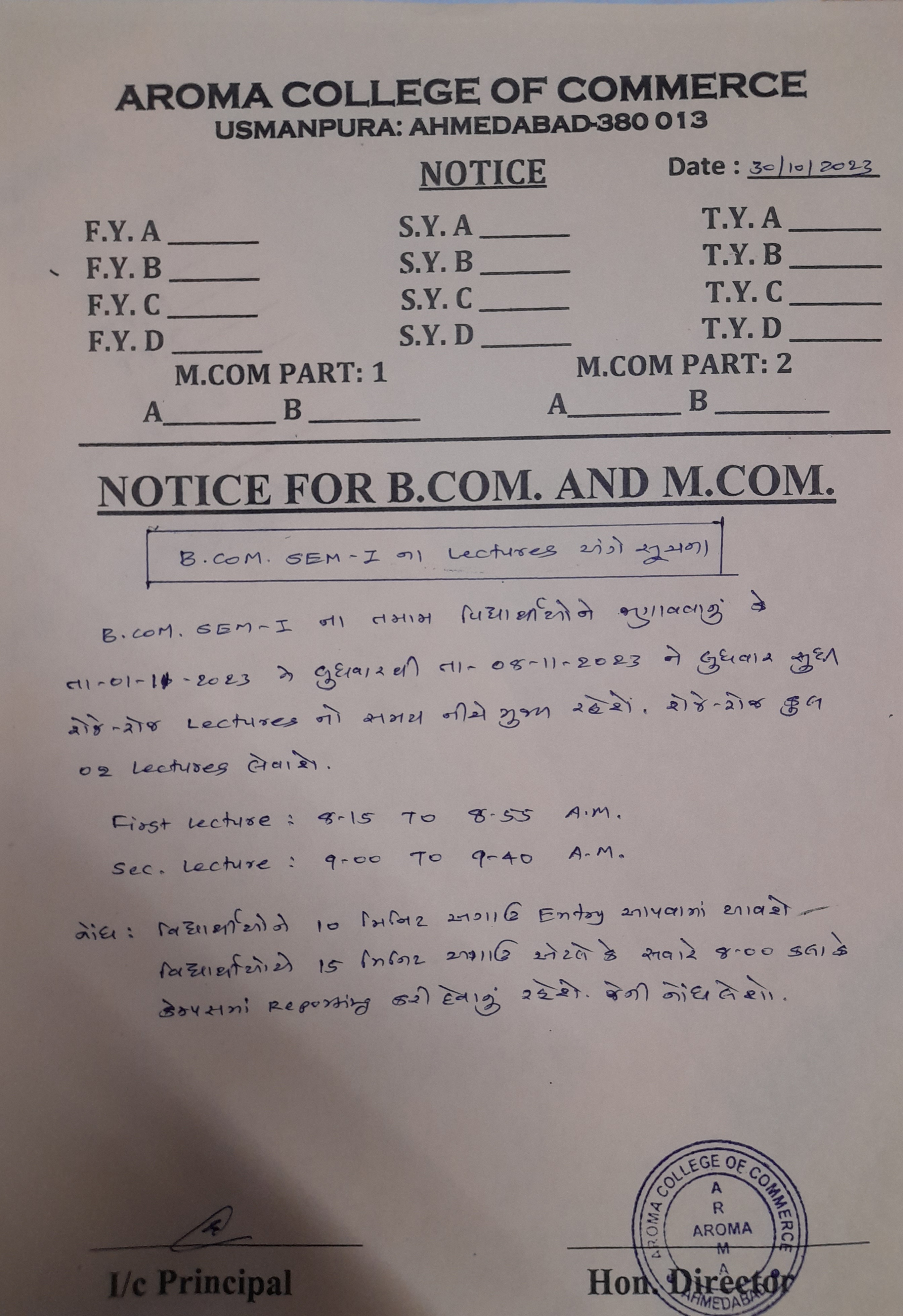 Important Notice: (1) B.com sem-1 Guj Uni Exam Forms for Regular and Repeater students will be declared on website as and when notified. (2)M.com sem-1 Guj Uni Exam Forms for Regular and Repeater students will also be declared on website as and when notified. (3)Assignments submission dates for B.com sem4 ,Bcom sem-6 and Mcom sem-4 will be declared shortly. (4)Do attend online classes regularly. (5) Admission Forms and fees process will complete in current month with late fees.