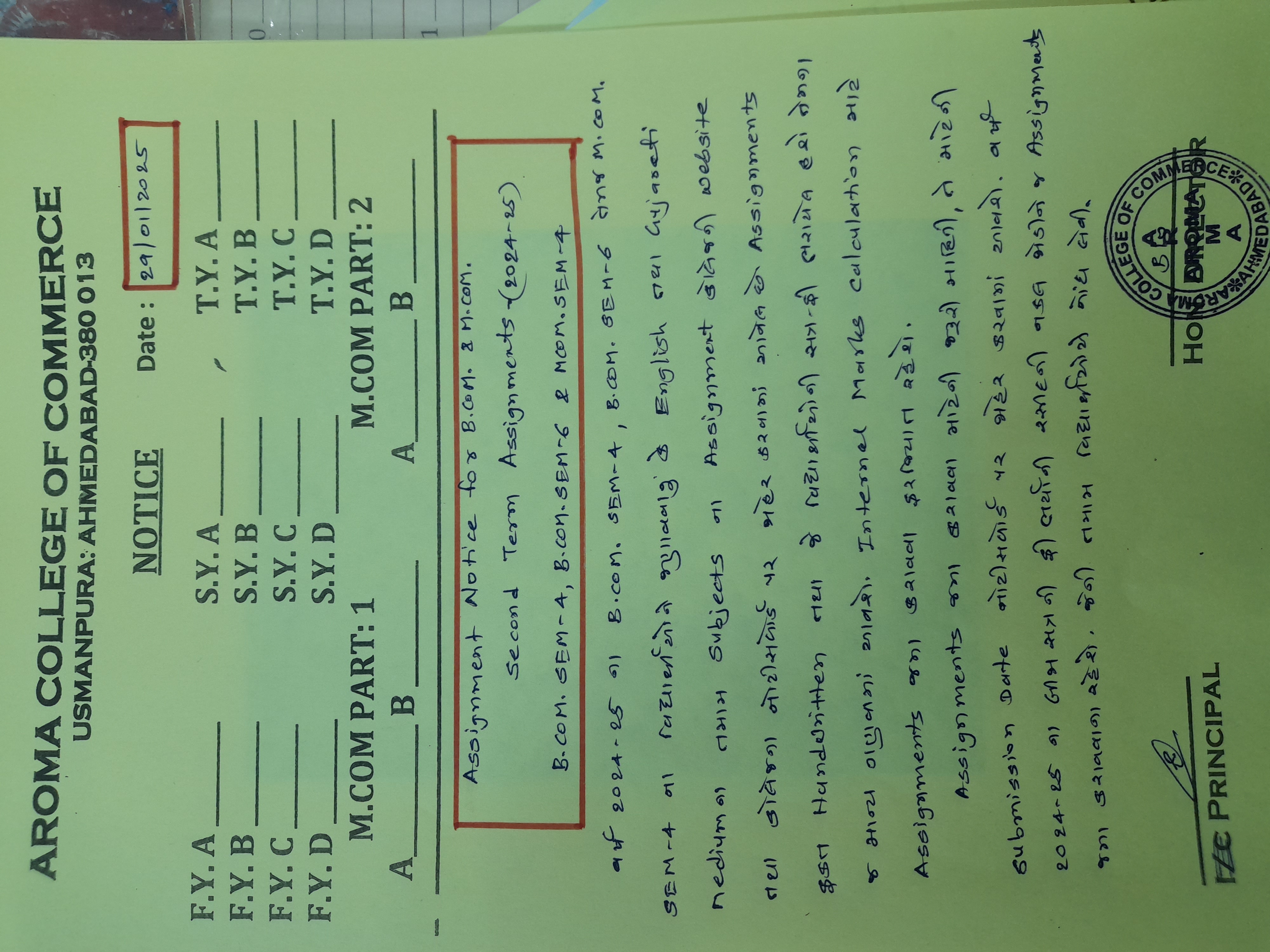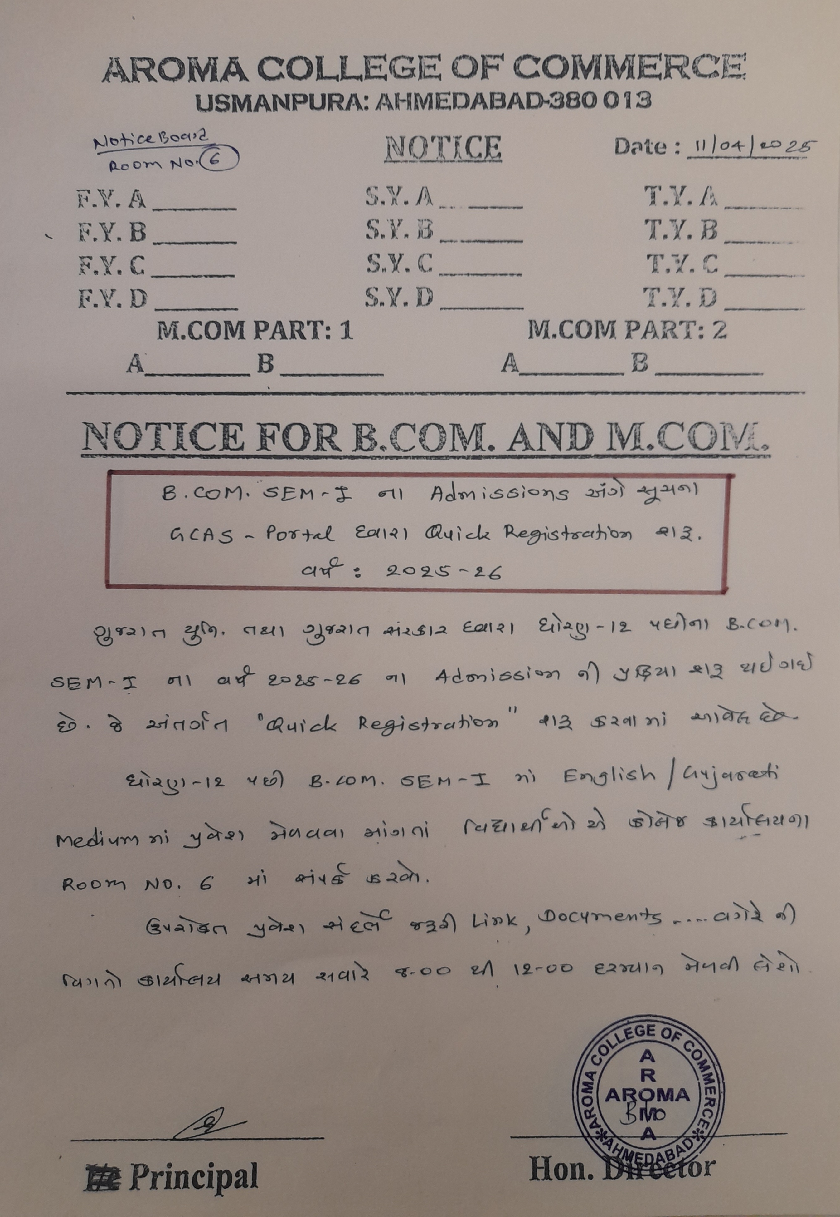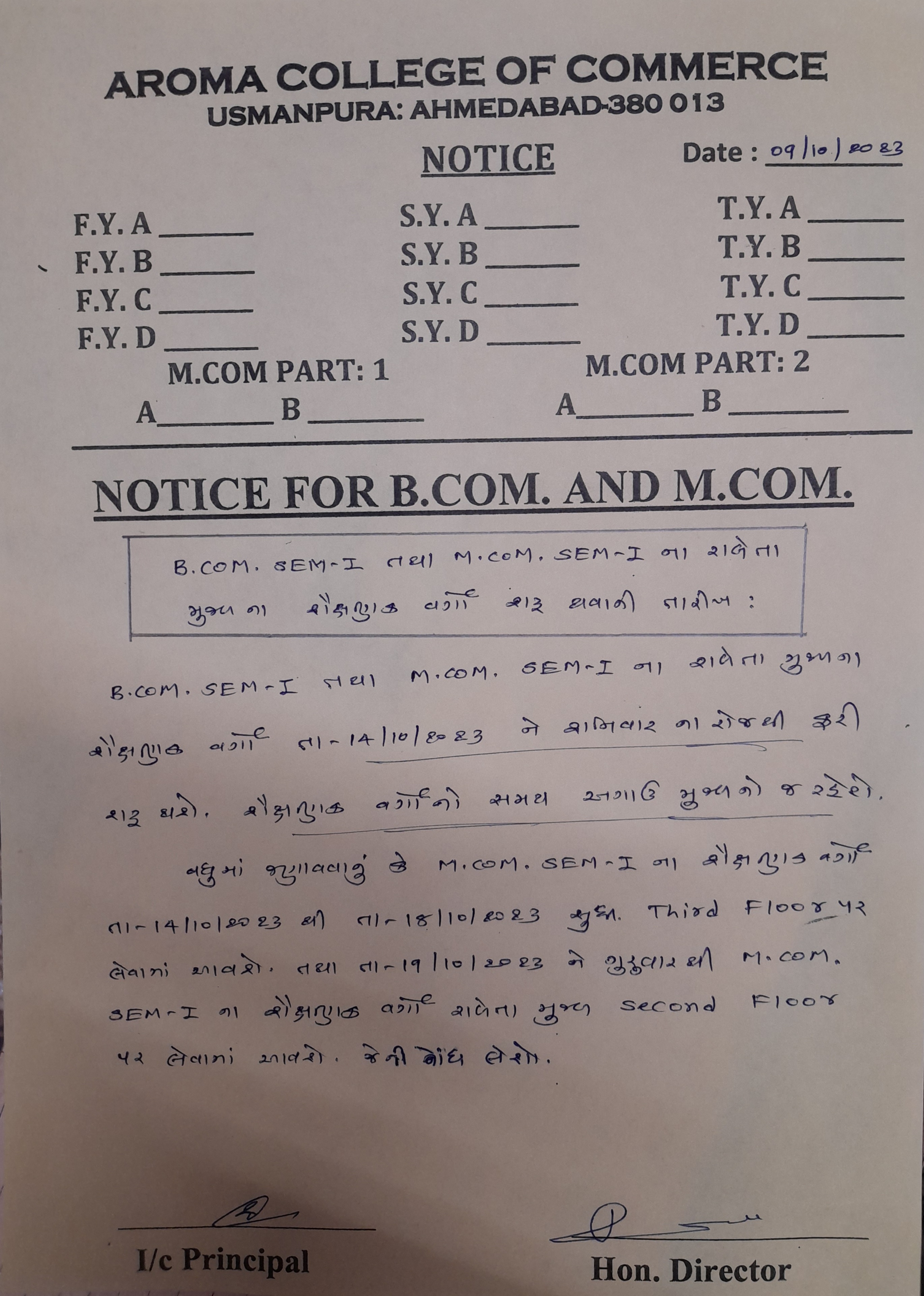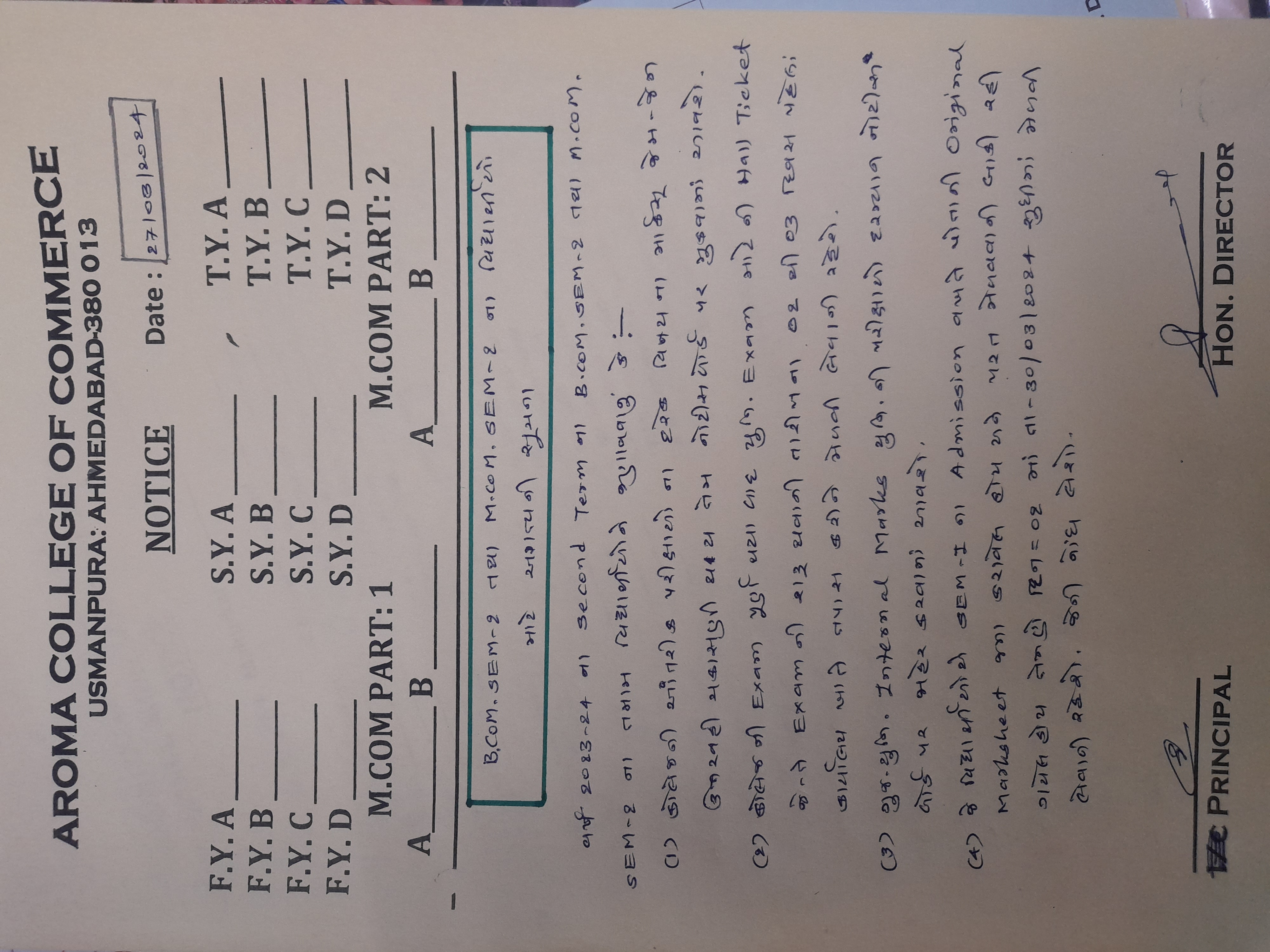 Important Notice: (1) B.com sem-1 Guj Uni Exam Forms for Regular and Repeater students will be declared on website as and when notified. (2)M.com sem-1 Guj Uni Exam Forms for Regular and Repeater students will also be declared on website as and when notified. (3)Assignments submission dates for B.com sem4 ,Bcom sem-6 and Mcom sem-4 will be declared shortly. (4)Do attend online classes regularly. (5) Admission Forms and fees process will complete in current month with late fees.