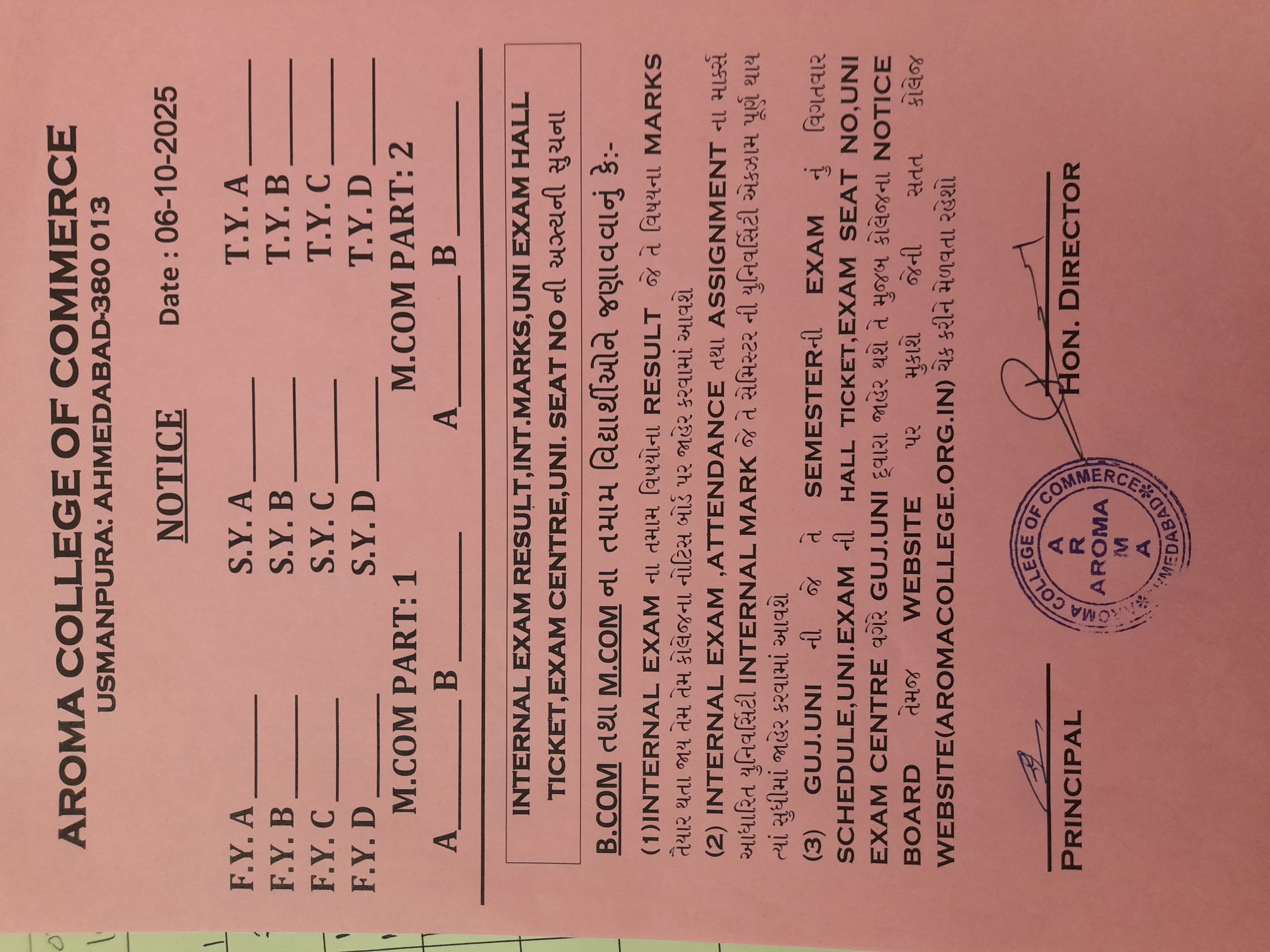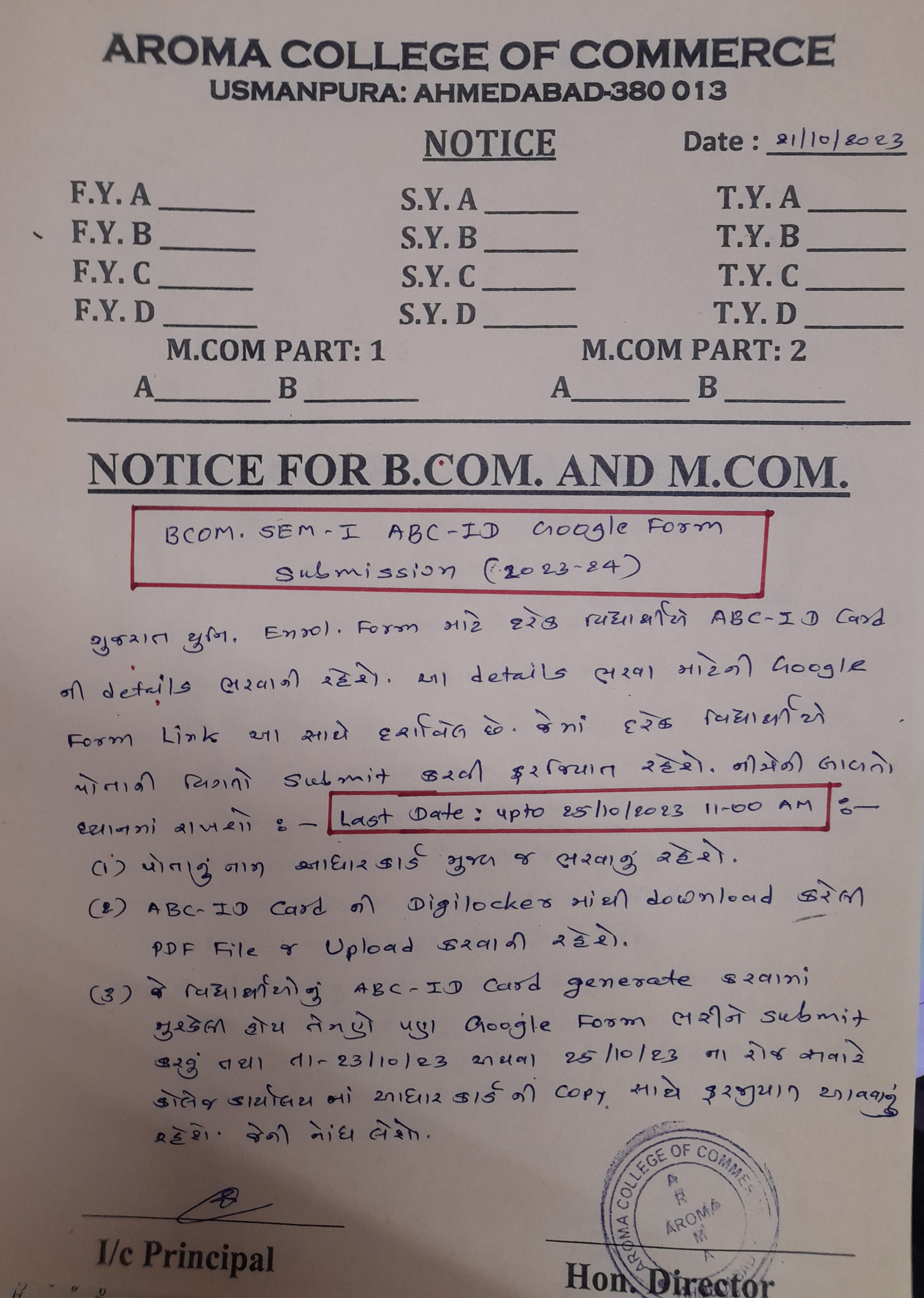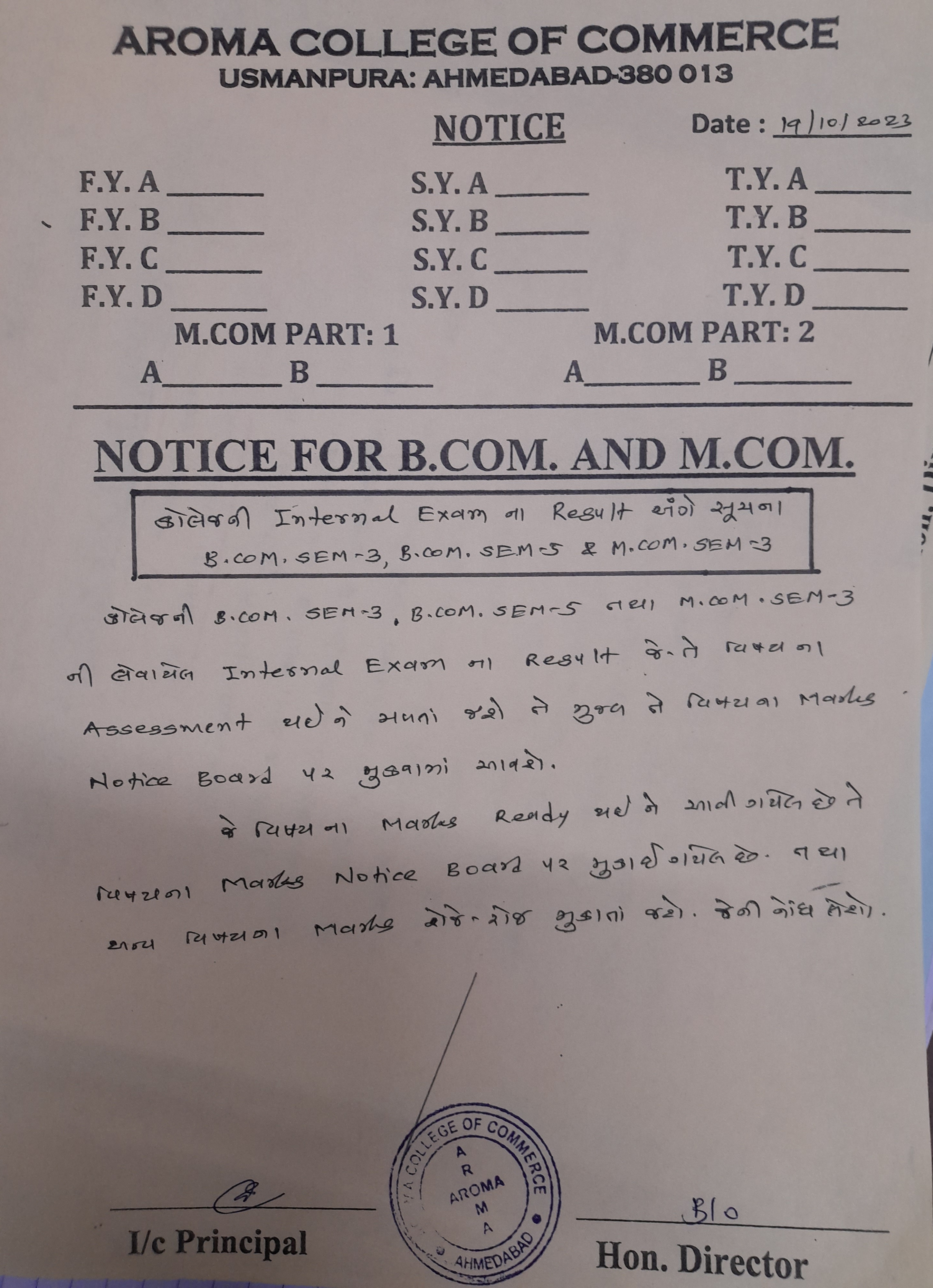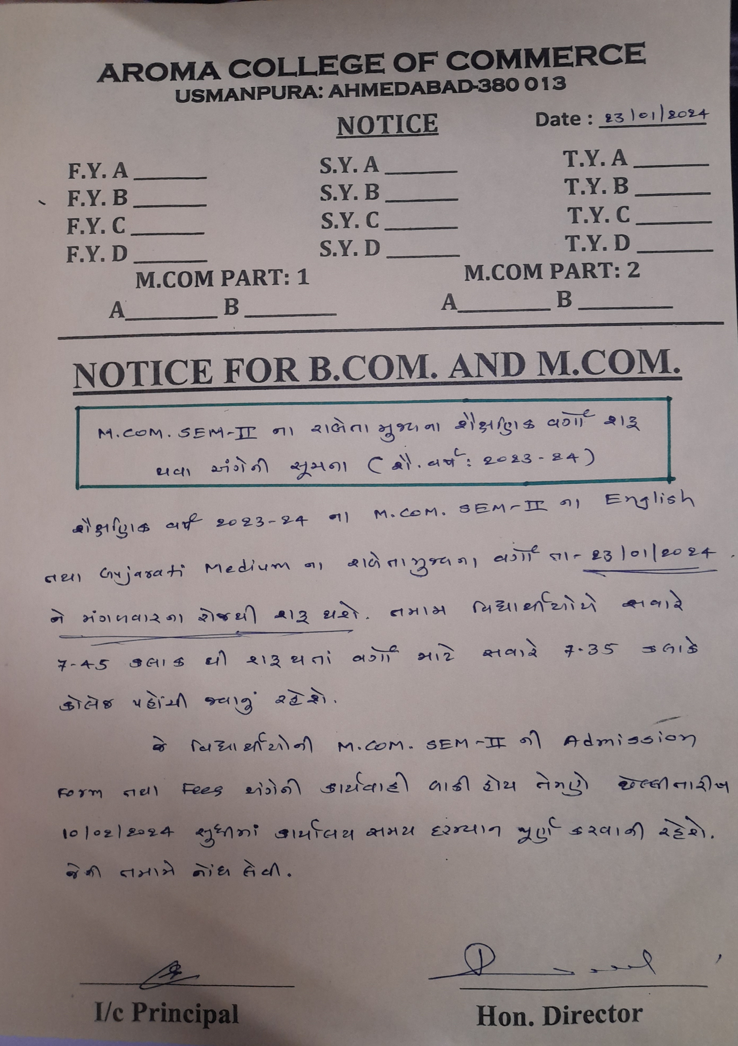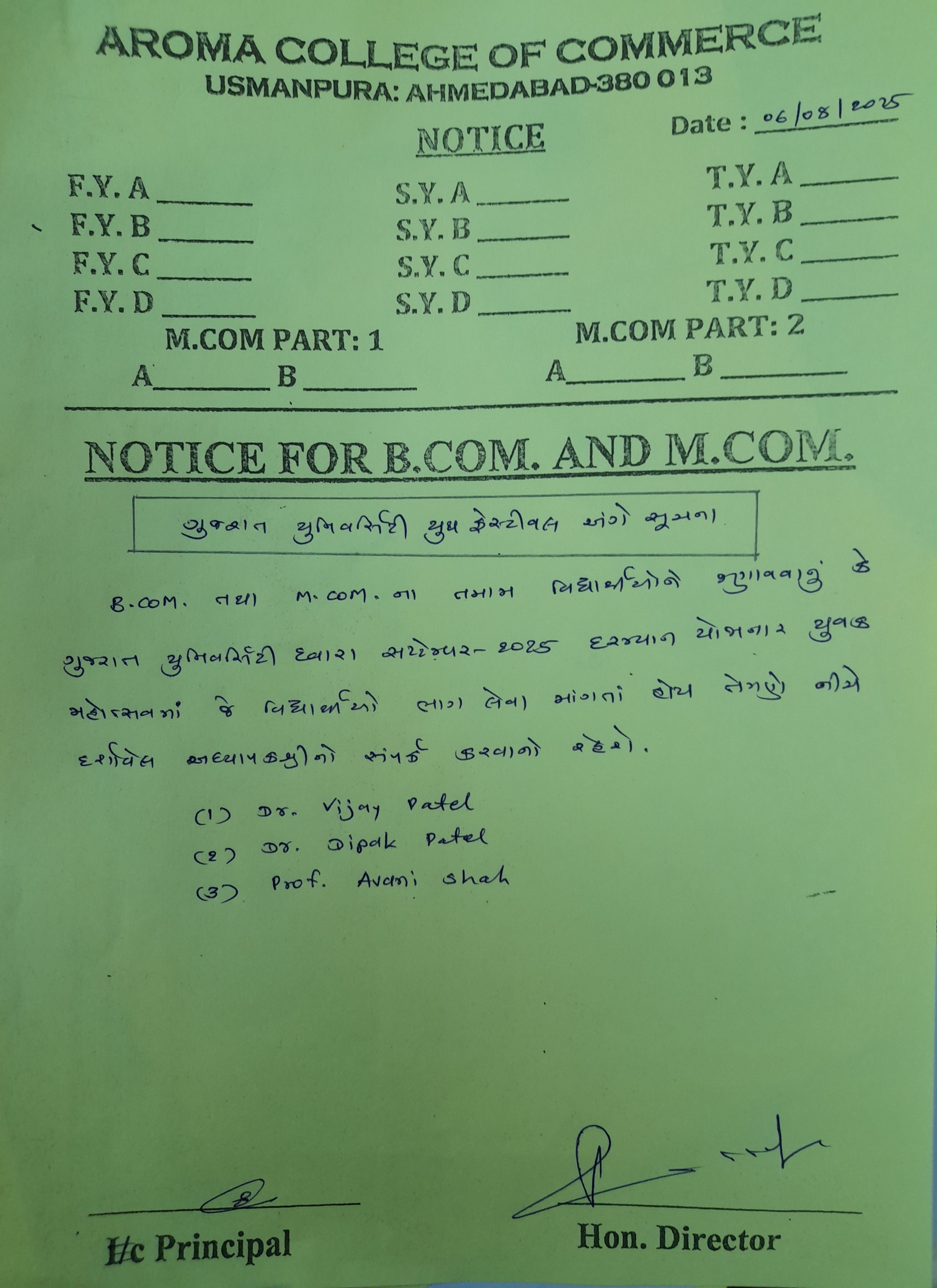 Important Notice: (1) B.com sem-1 Guj Uni Exam Forms for Regular and Repeater students will be declared on website as and when notified. (2)M.com sem-1 Guj Uni Exam Forms for Regular and Repeater students will also be declared on website as and when notified. (3)Assignments submission dates for B.com sem4 ,Bcom sem-6 and Mcom sem-4 will be declared shortly. (4)Do attend online classes regularly. (5) Admission Forms and fees process will complete in current month with late fees.