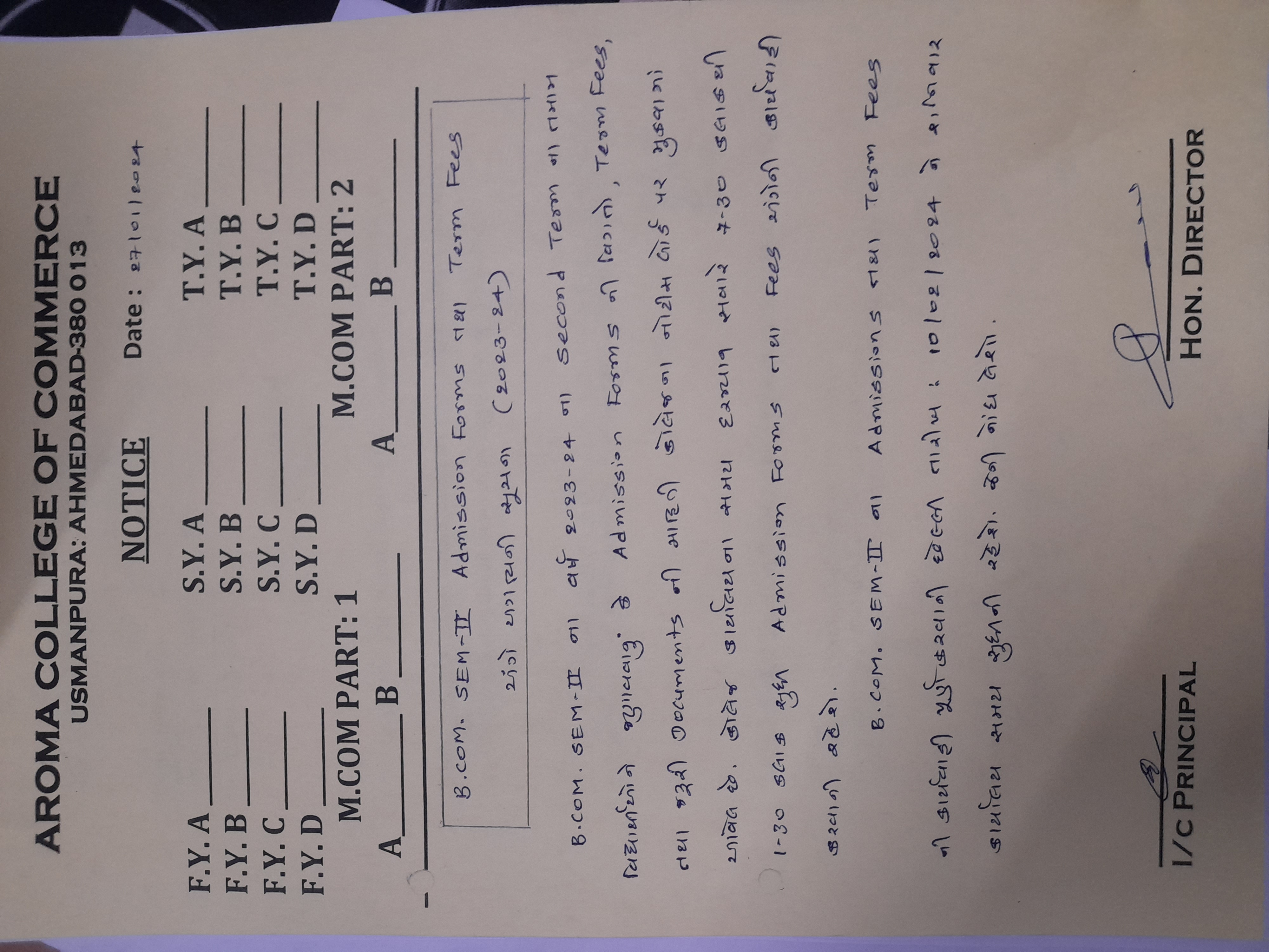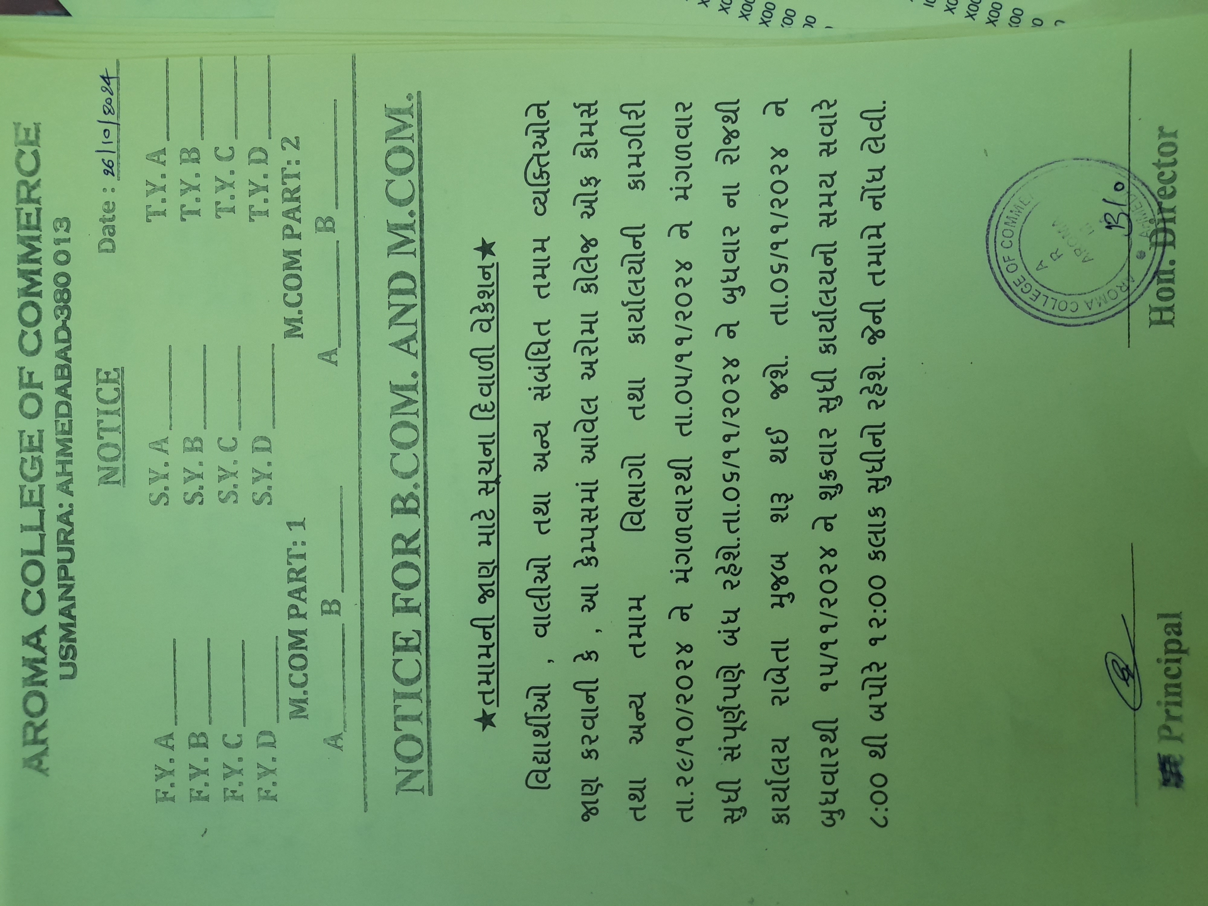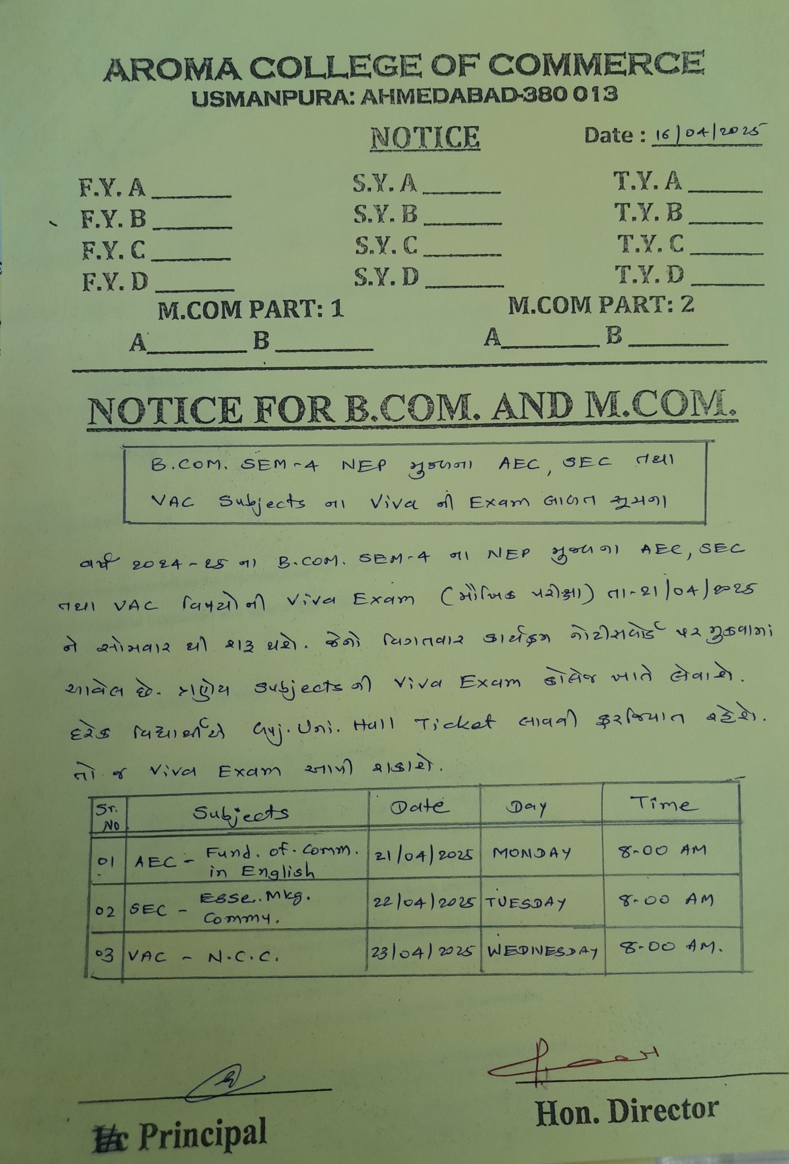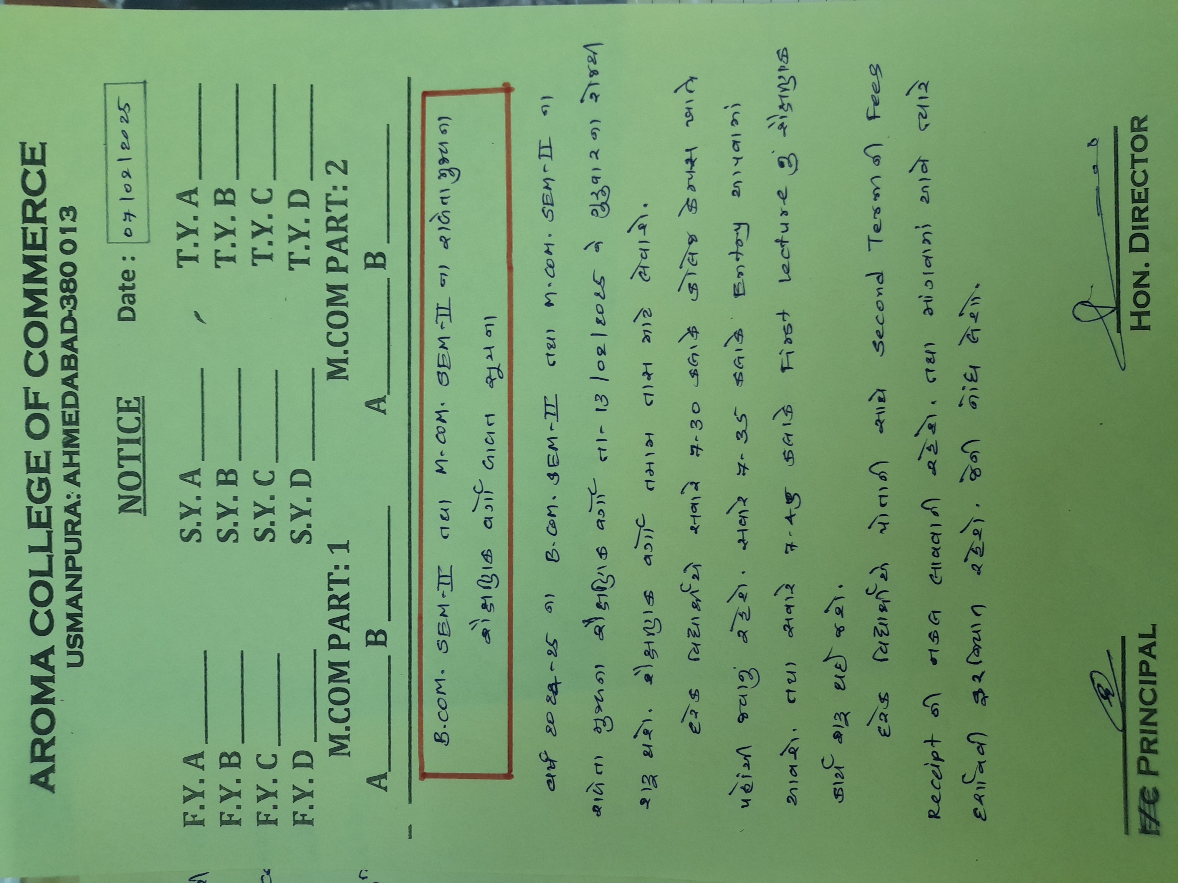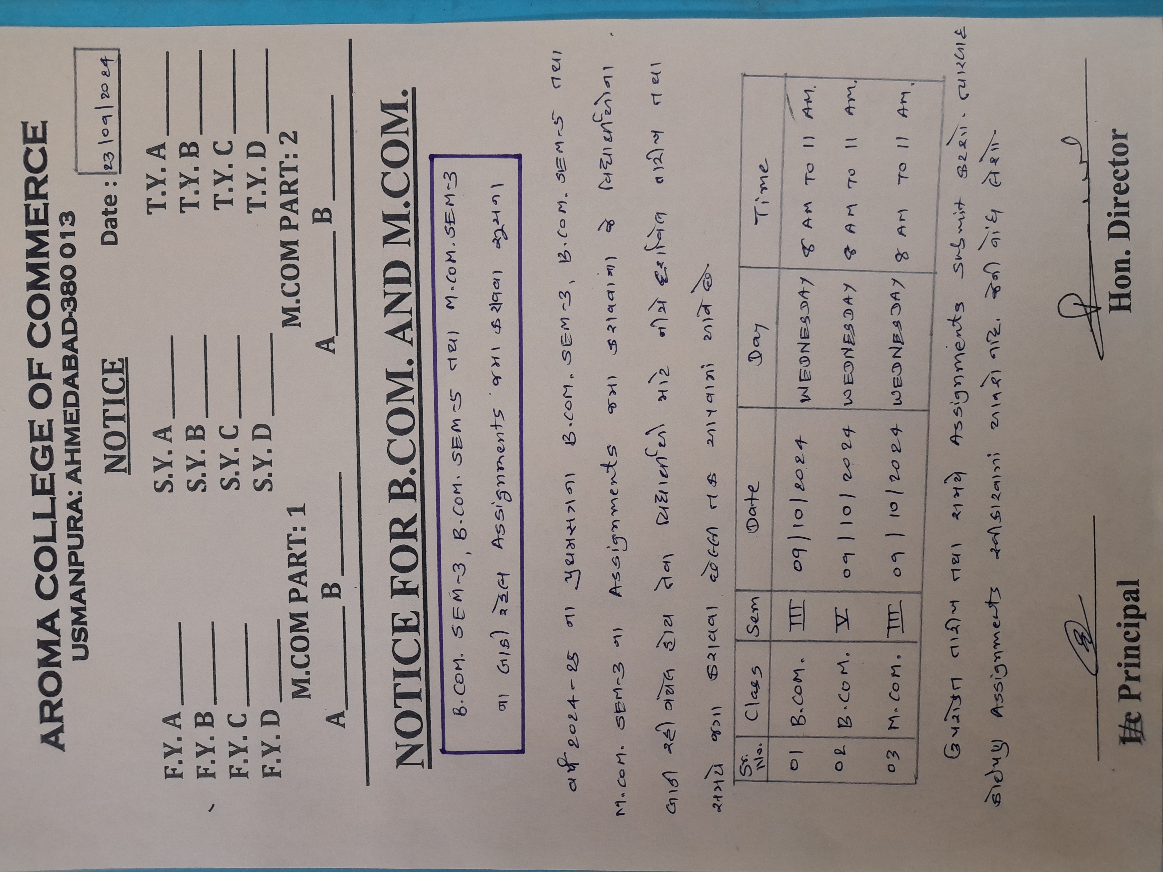 Important Notice: (1) B.com sem-1 Guj Uni Exam Forms for Regular and Repeater students will be declared on website as and when notified. (2)M.com sem-1 Guj Uni Exam Forms for Regular and Repeater students will also be declared on website as and when notified. (3)Assignments submission dates for B.com sem4 ,Bcom sem-6 and Mcom sem-4 will be declared shortly. (4)Do attend online classes regularly. (5) Admission Forms and fees process will complete in current month with late fees.