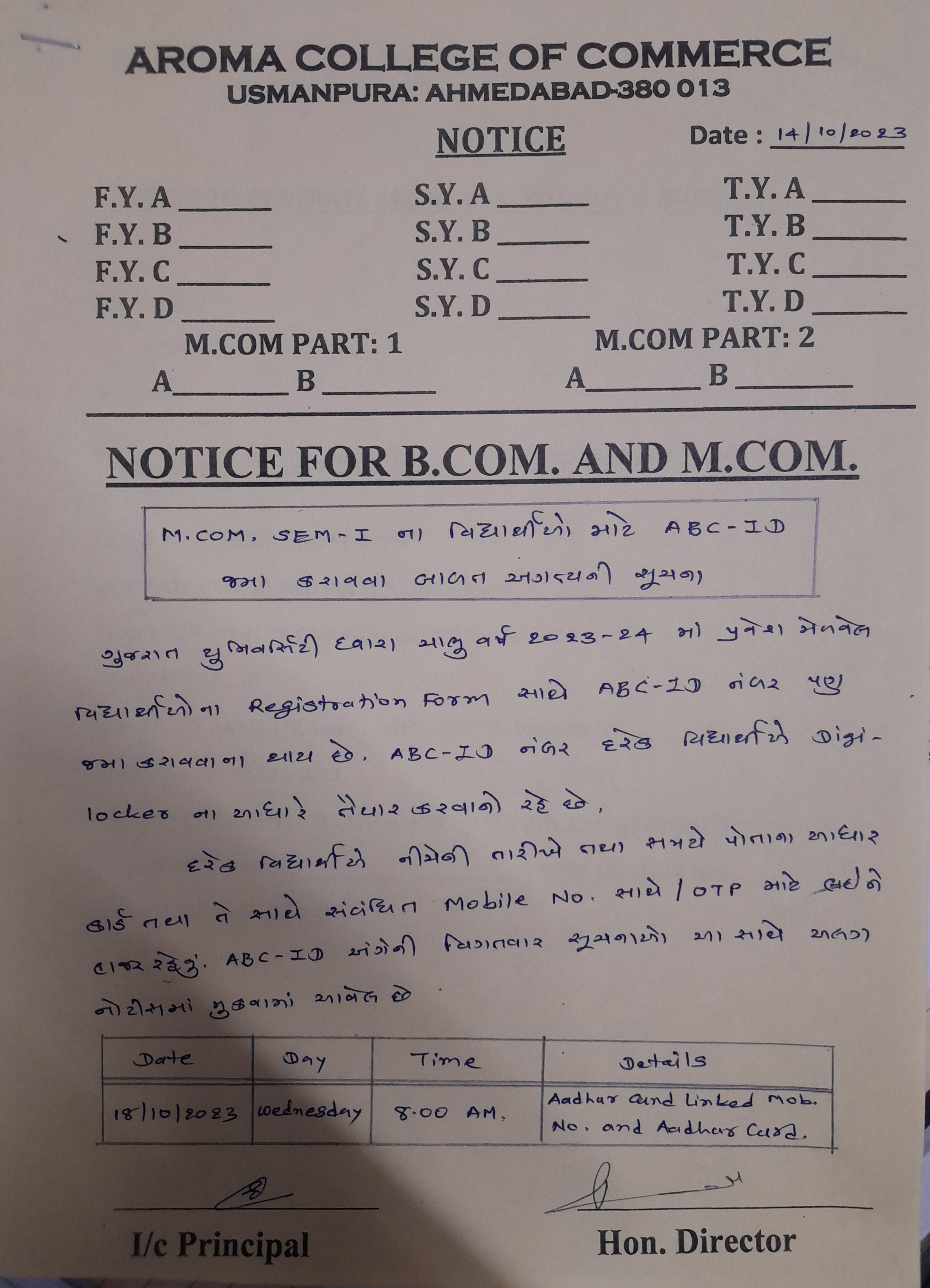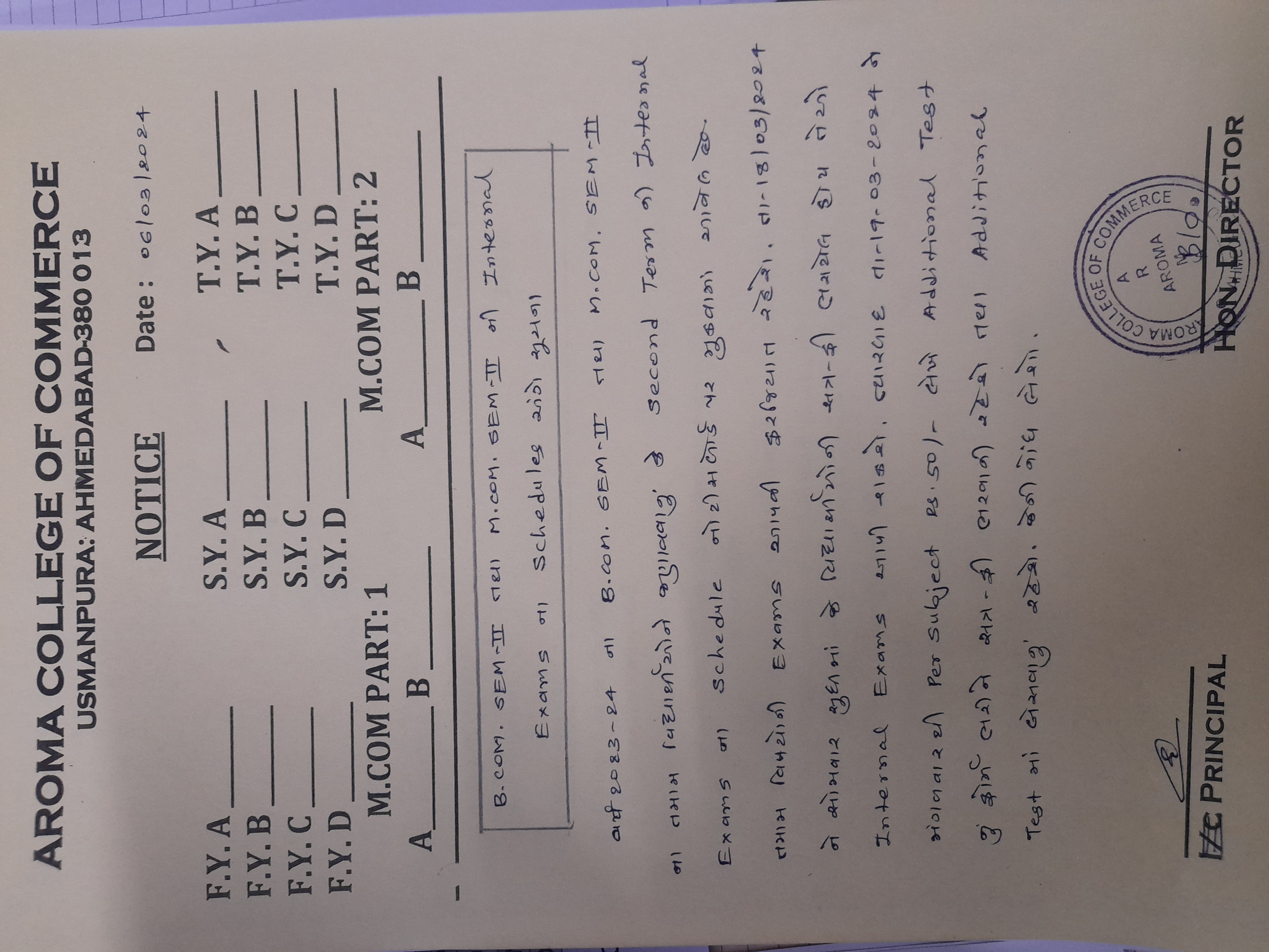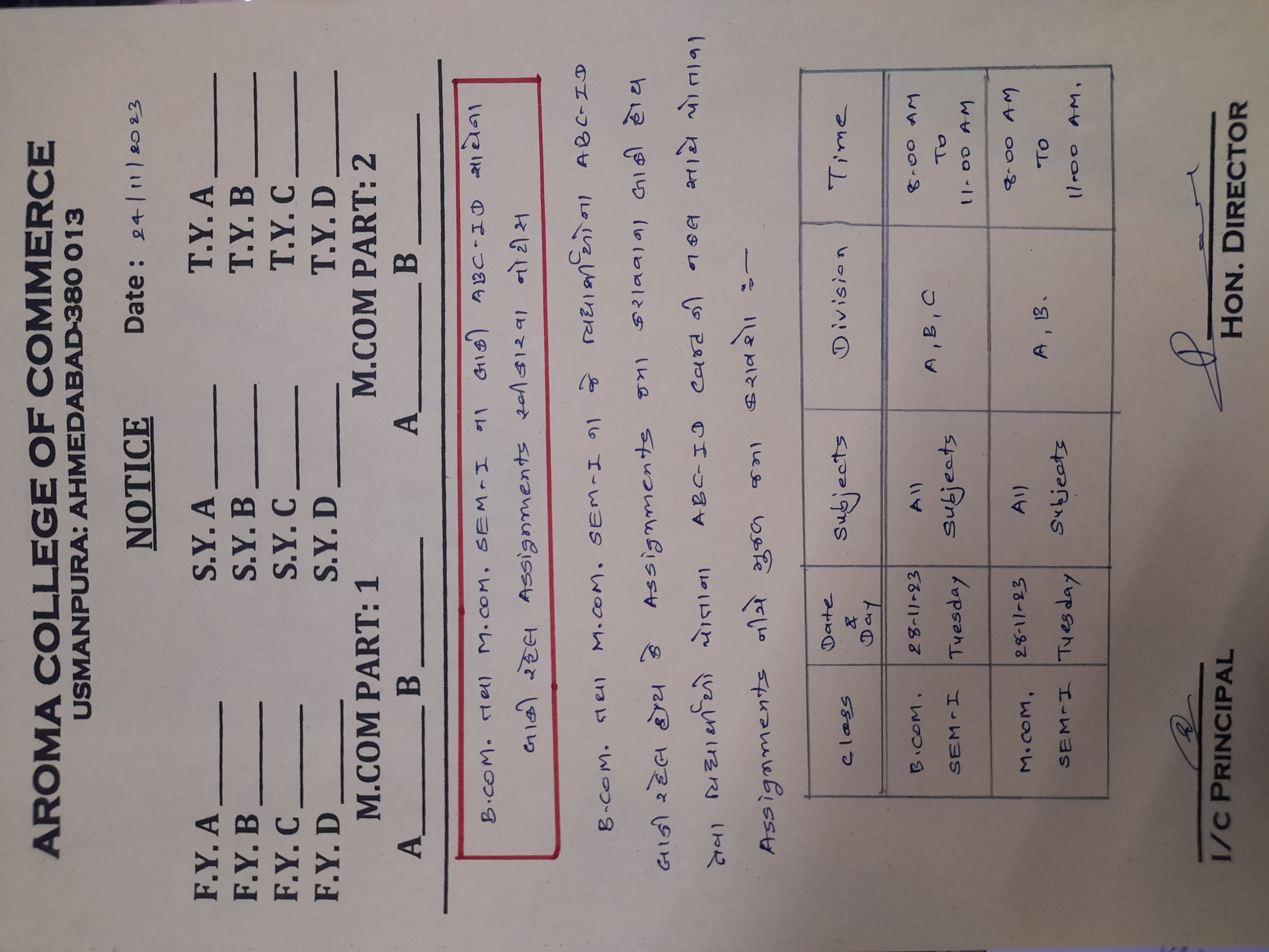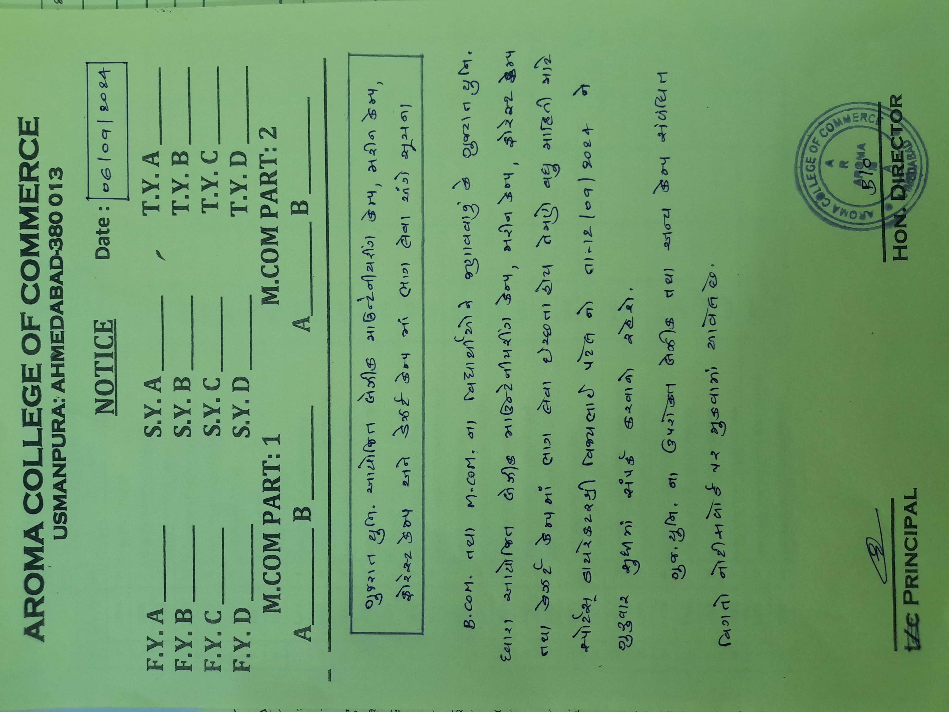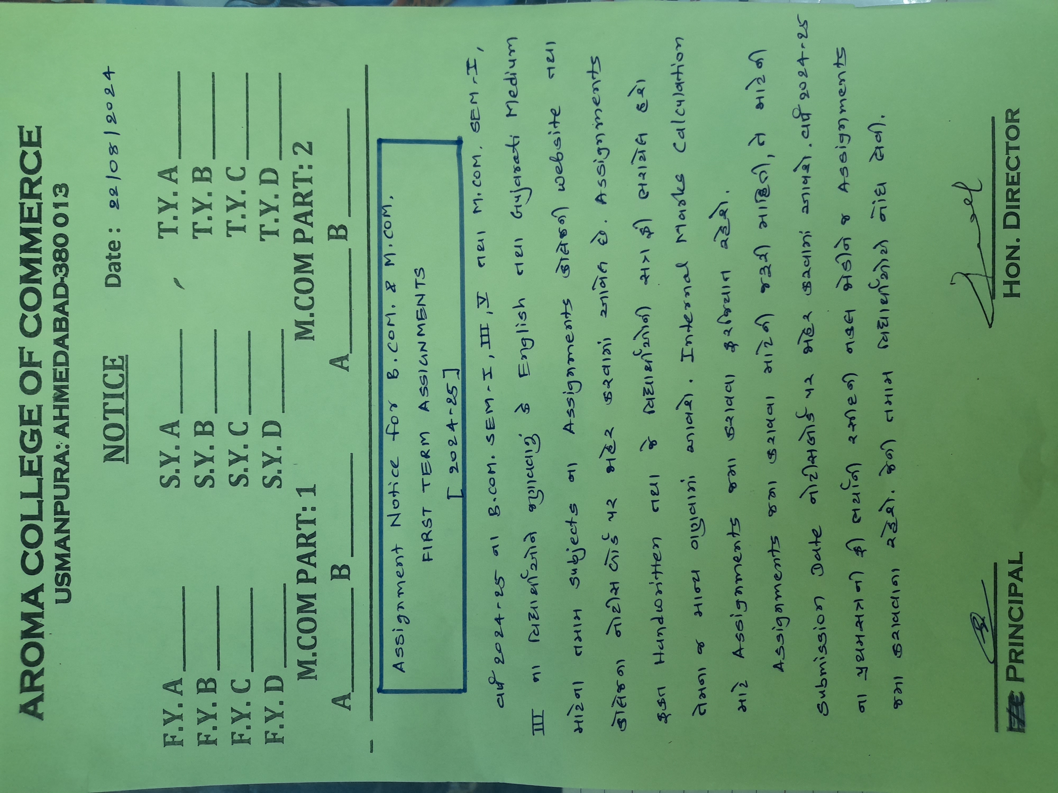 Important Notice: (1) B.com sem-1 Guj Uni Exam Forms for Regular and Repeater students will be declared on website as and when notified. (2)M.com sem-1 Guj Uni Exam Forms for Regular and Repeater students will also be declared on website as and when notified. (3)Assignments submission dates for B.com sem4 ,Bcom sem-6 and Mcom sem-4 will be declared shortly. (4)Do attend online classes regularly. (5) Admission Forms and fees process will complete in current month with late fees.