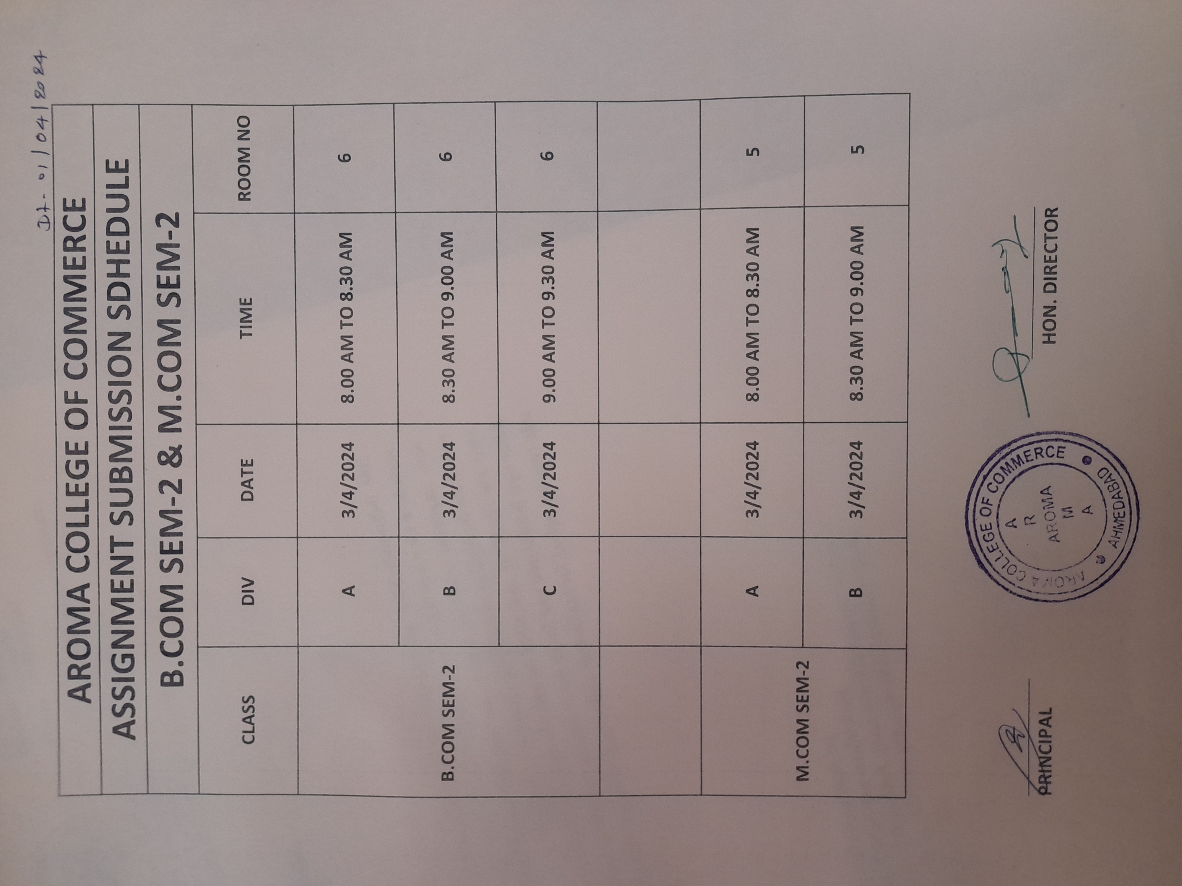 Assignment Submission Notice(Year 2021-22 SECOND TERM):(Follow the Detailed Time Slots with Roll Numbers which will declare tomorrow): (1)BCOM.SEM-6:DIVISION:A: SUBMISSION DATE:21/02/2022,MONDAY) (2)BCOM.SEM-6:DIVISION:B: SUBMISSION DATE:22/02/2022,TUESDAY) (3)BCOM.SEM-6:DIVISION:D: SUBMISSION DATE:23/02/2022,WEDNESDAY) (4)BCOM.SEM-4:DIVISION:A: SUBMISSION DATE:24/02/2022,THURSDAY) (5)BCOM.SEM-4:DIVISION:B: SUBMISSION DATE:25/02/2022,FRIDAY) (6)BCOM.SEM-4:DIVISION:D: SUBMISSION DATE:26/02/2022,SATURDAY) (7)M.COM.SEM-4:DIVISION:A: SUBMISSION DATE:28/02/2022,MONDAY) (8)M.COM.SEM-4:DIVISION:B: SUBMISSION DATE:02/03/2022,WEDNESDAY)