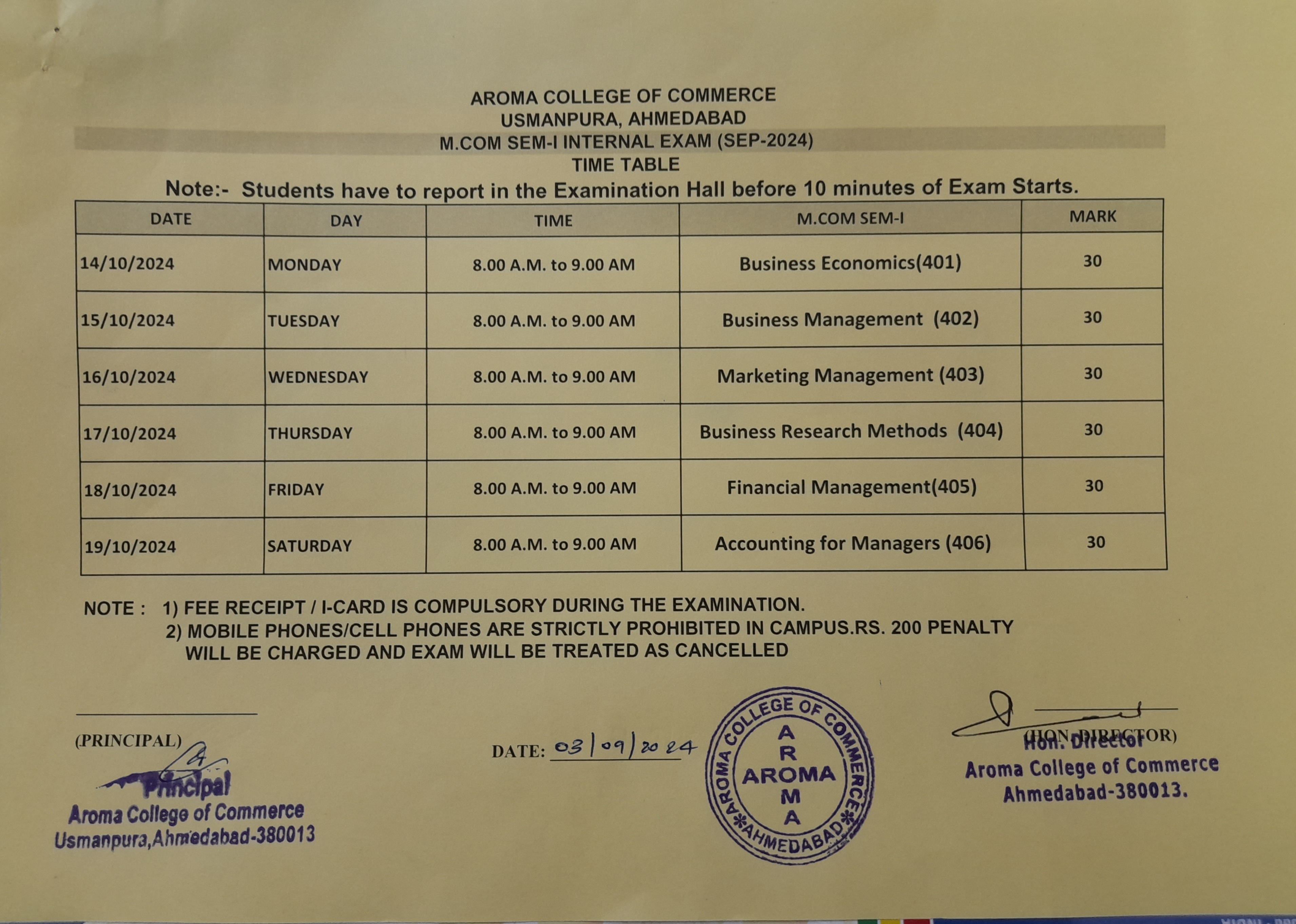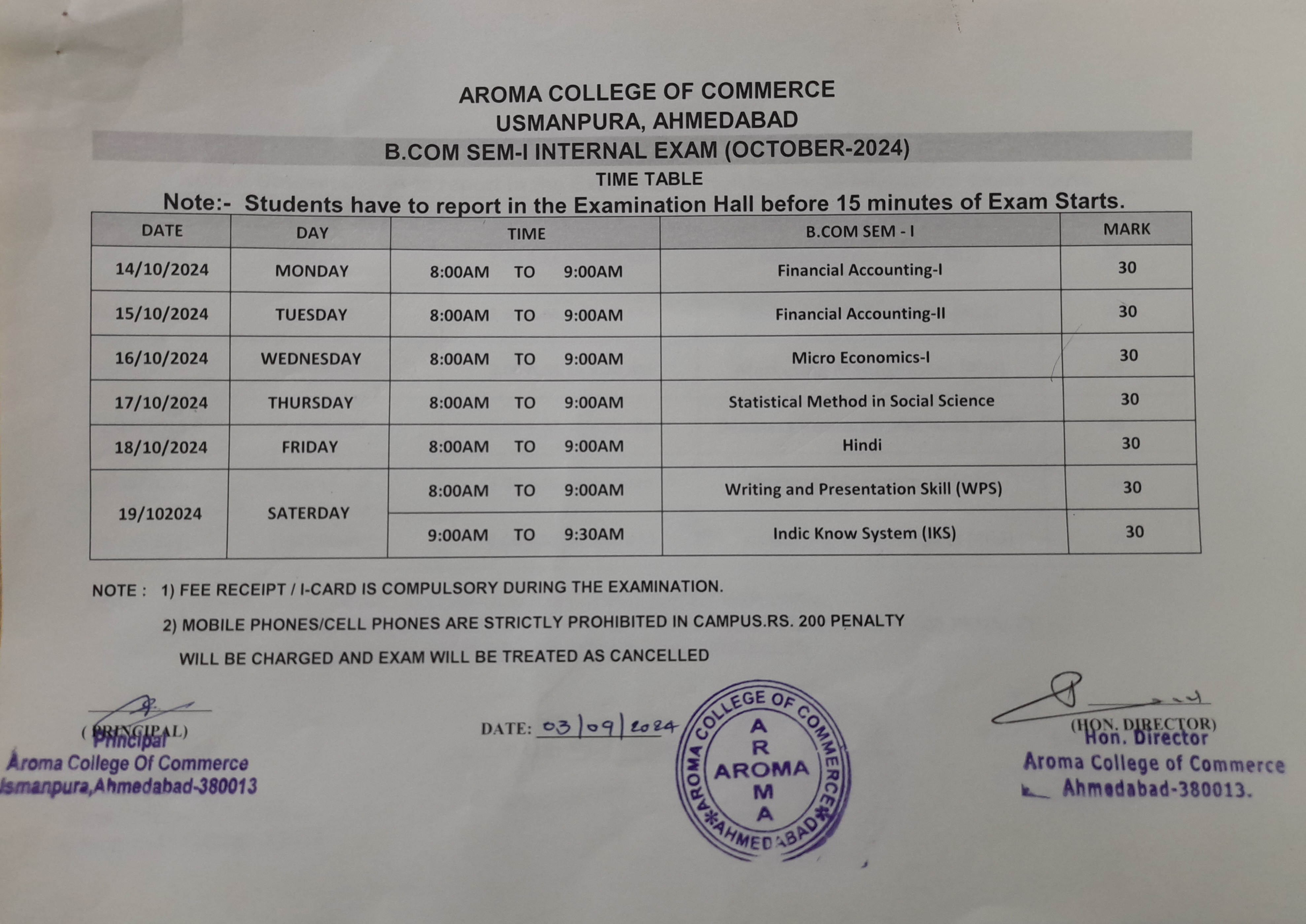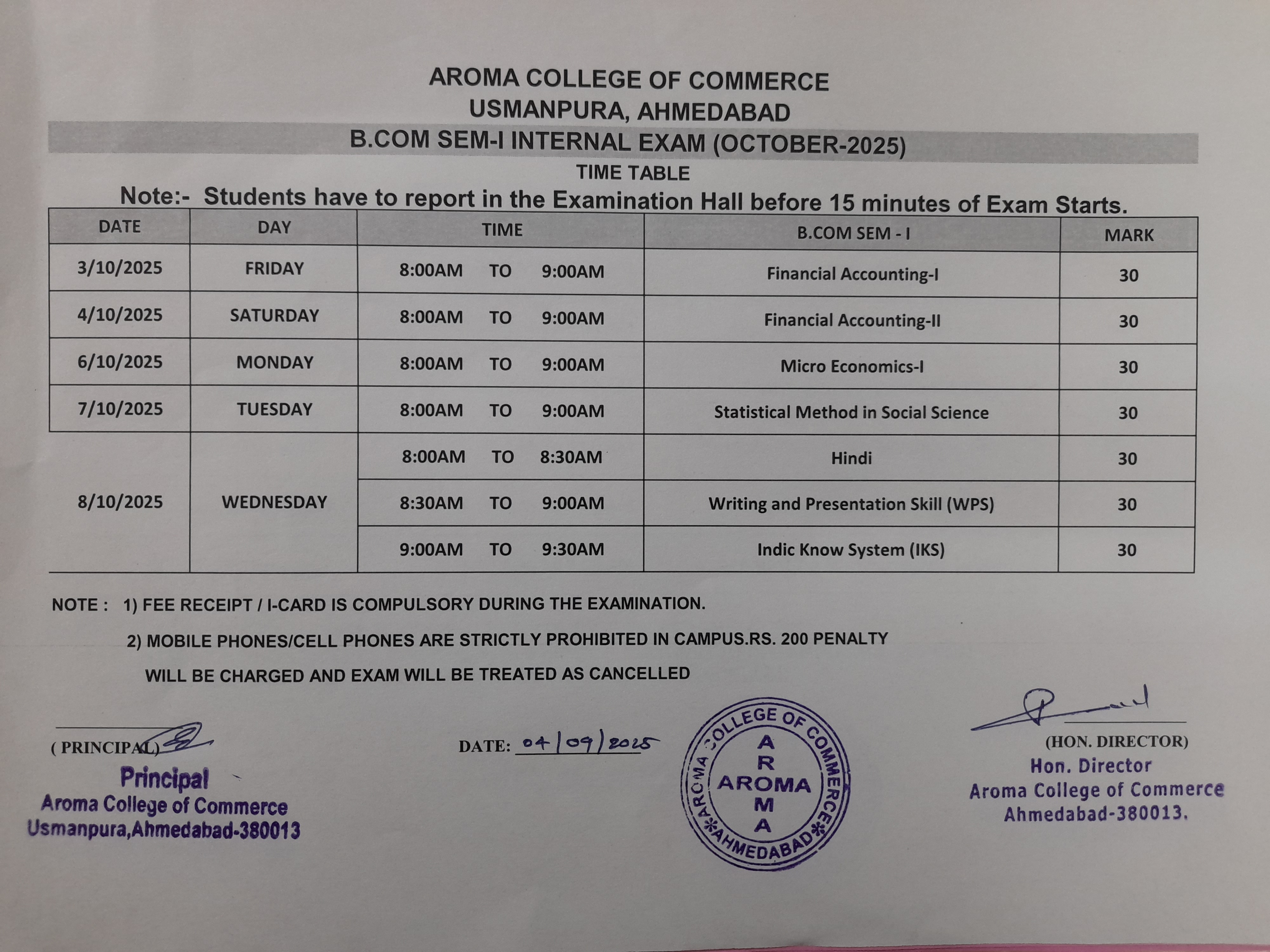 BCOM SEM-1 AND M.COM SEM-1 INTERNAL EXAM SCHEDULE OCTOBER-2025 Notice