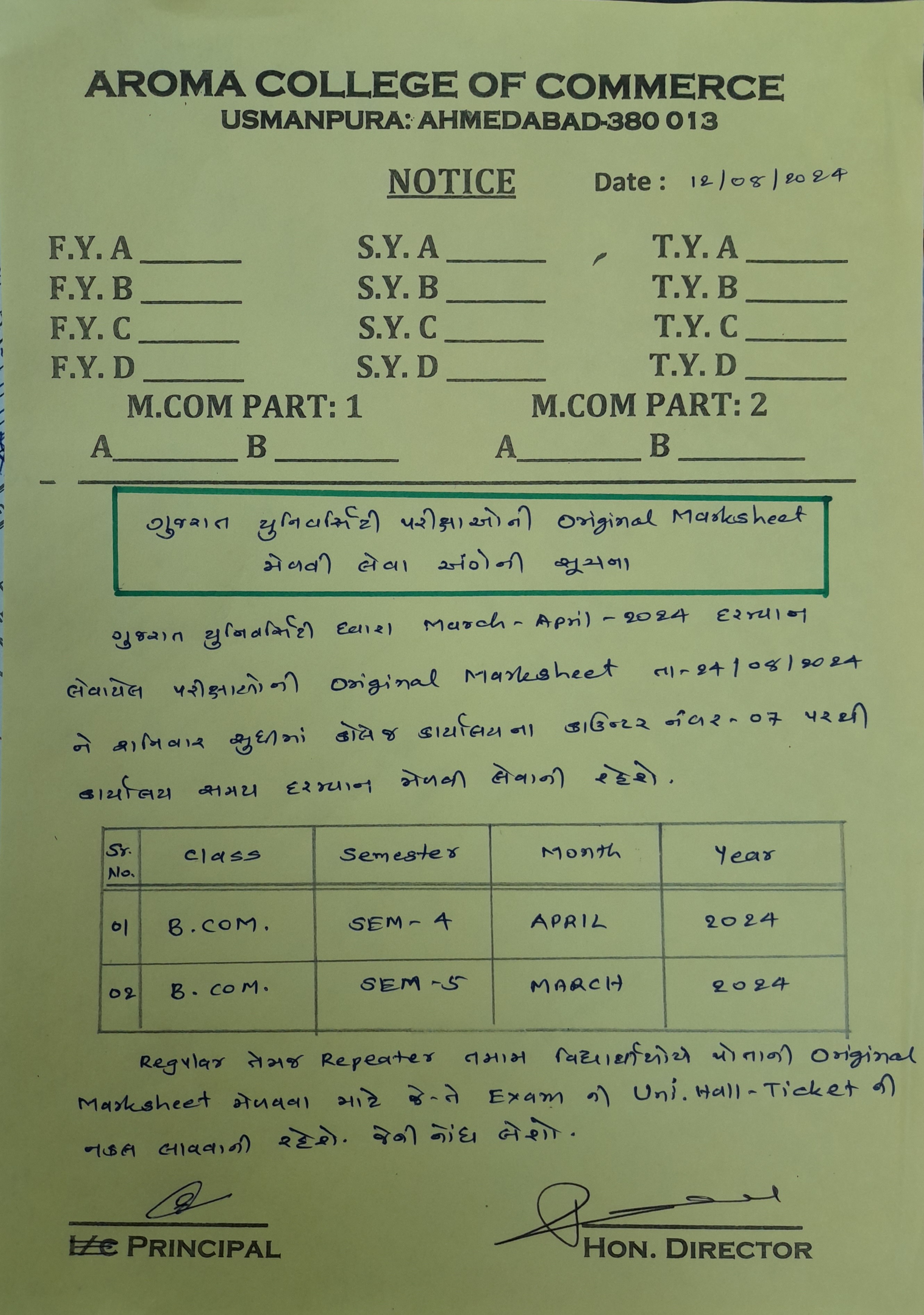 Distribution of Original Marksheet of Gujarati University MCOM.SEM-1 March-2022 Exam Results is started. Collect your Marksheet from College office counter no.06 before last date 25/06/2022 during office hours.