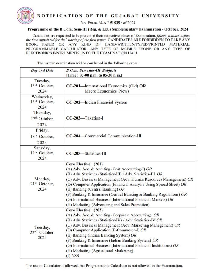Guj Uni Exam Bcom SEM-6 October-2025 EXAM SCHEDULE declared
