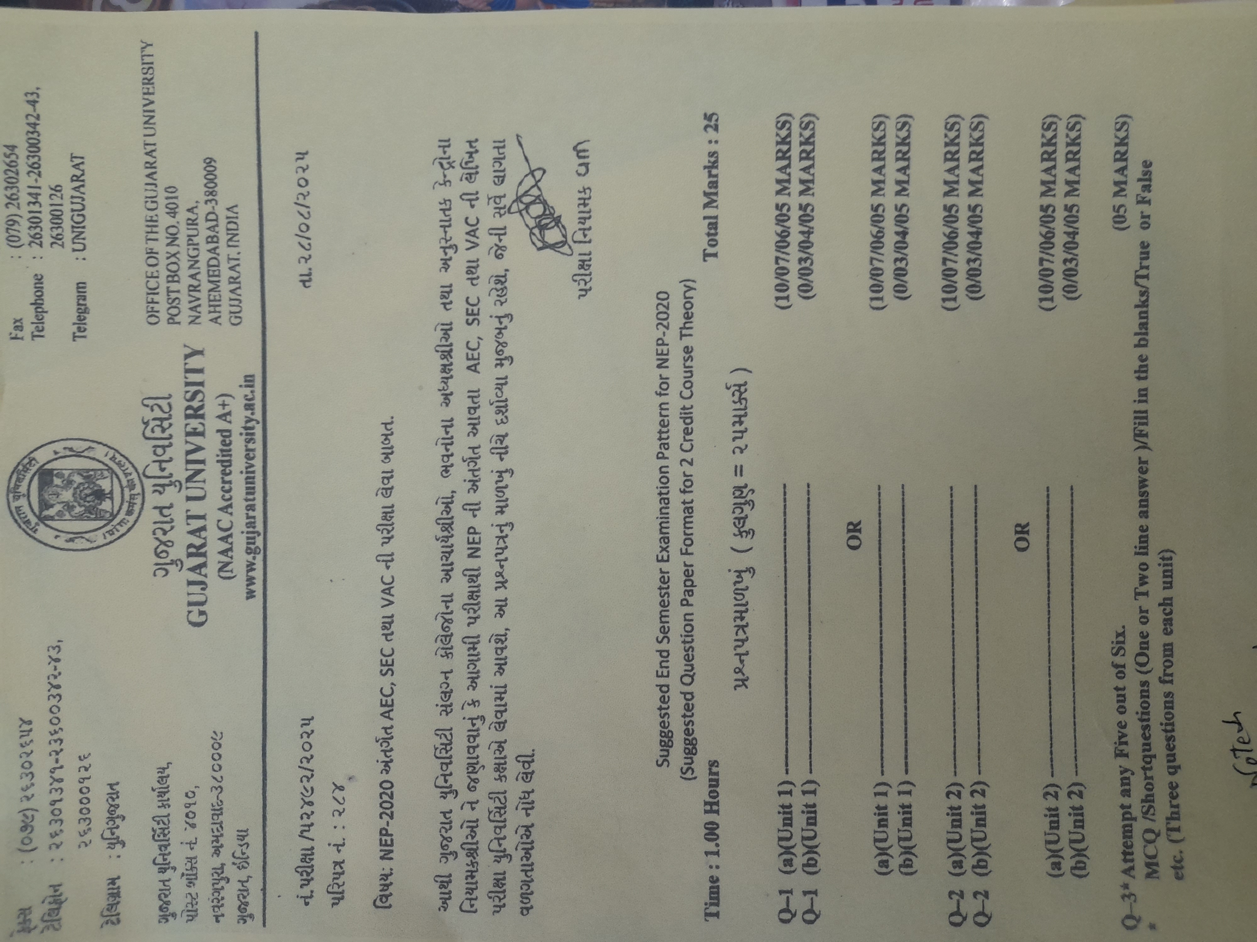 Guj uni circular for written exam of AEC,SEC and VAC subjects with Questions structure