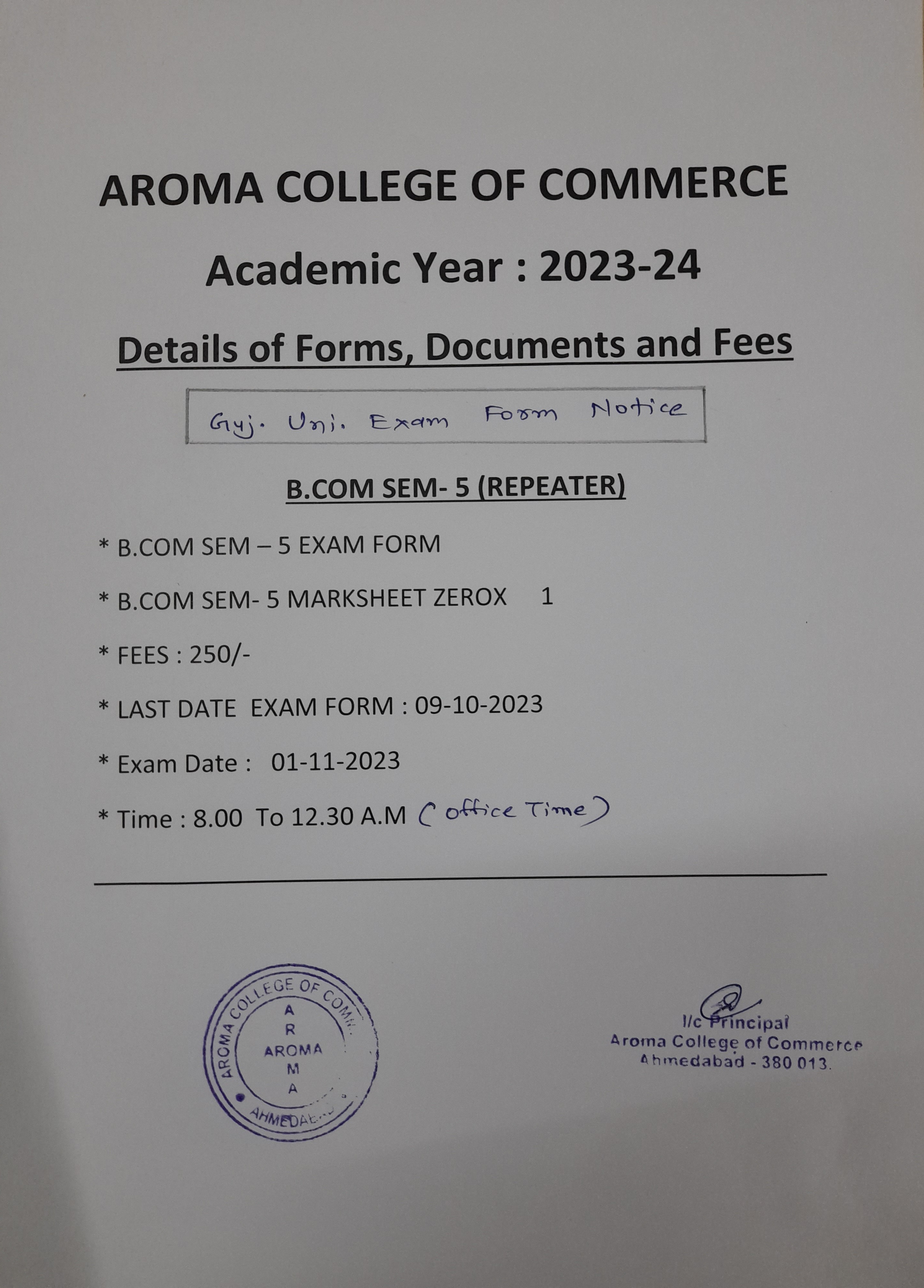 Guj uni Exam form notice for BCOM.SEM-5 (CBCS) Repeater students