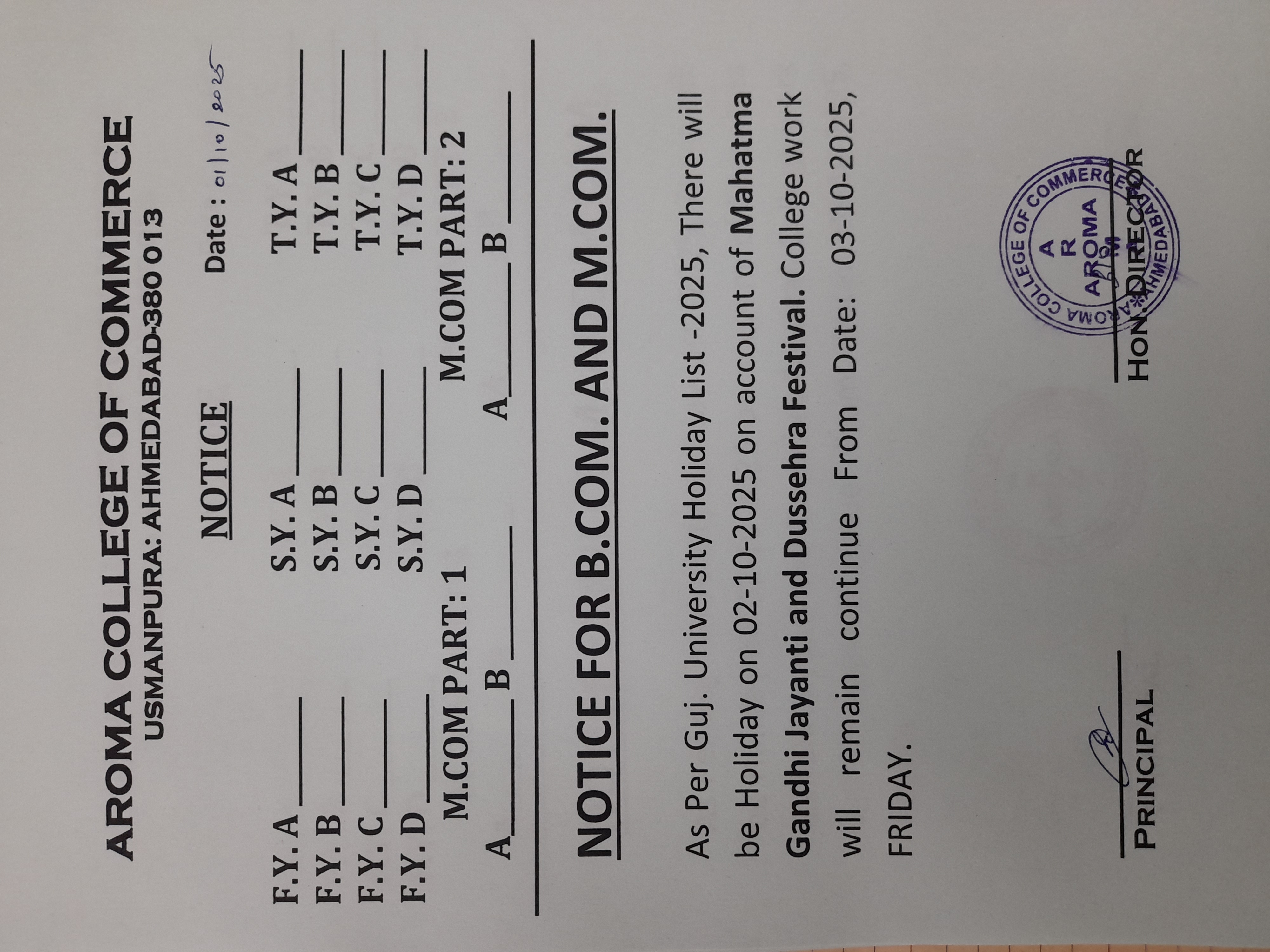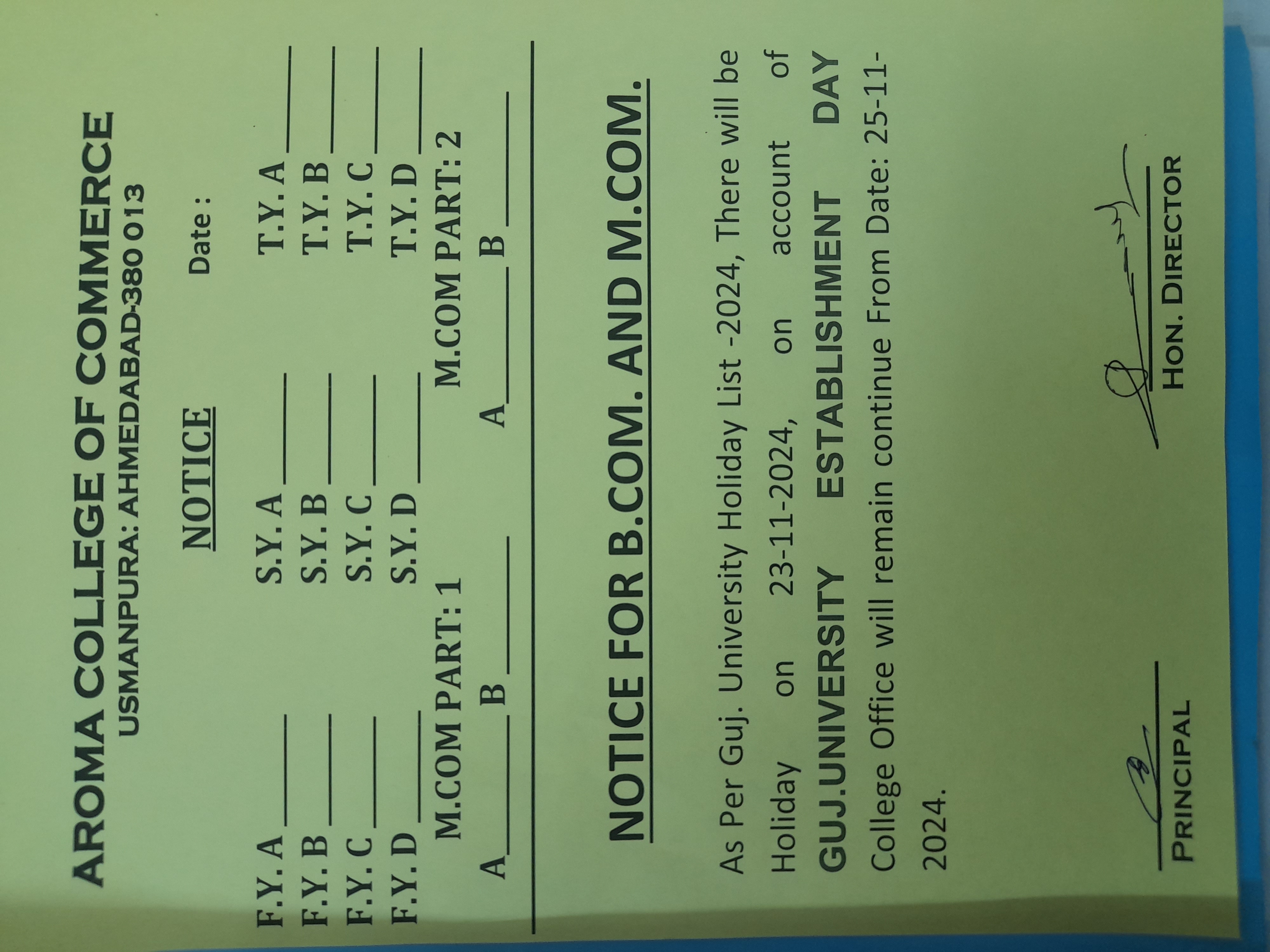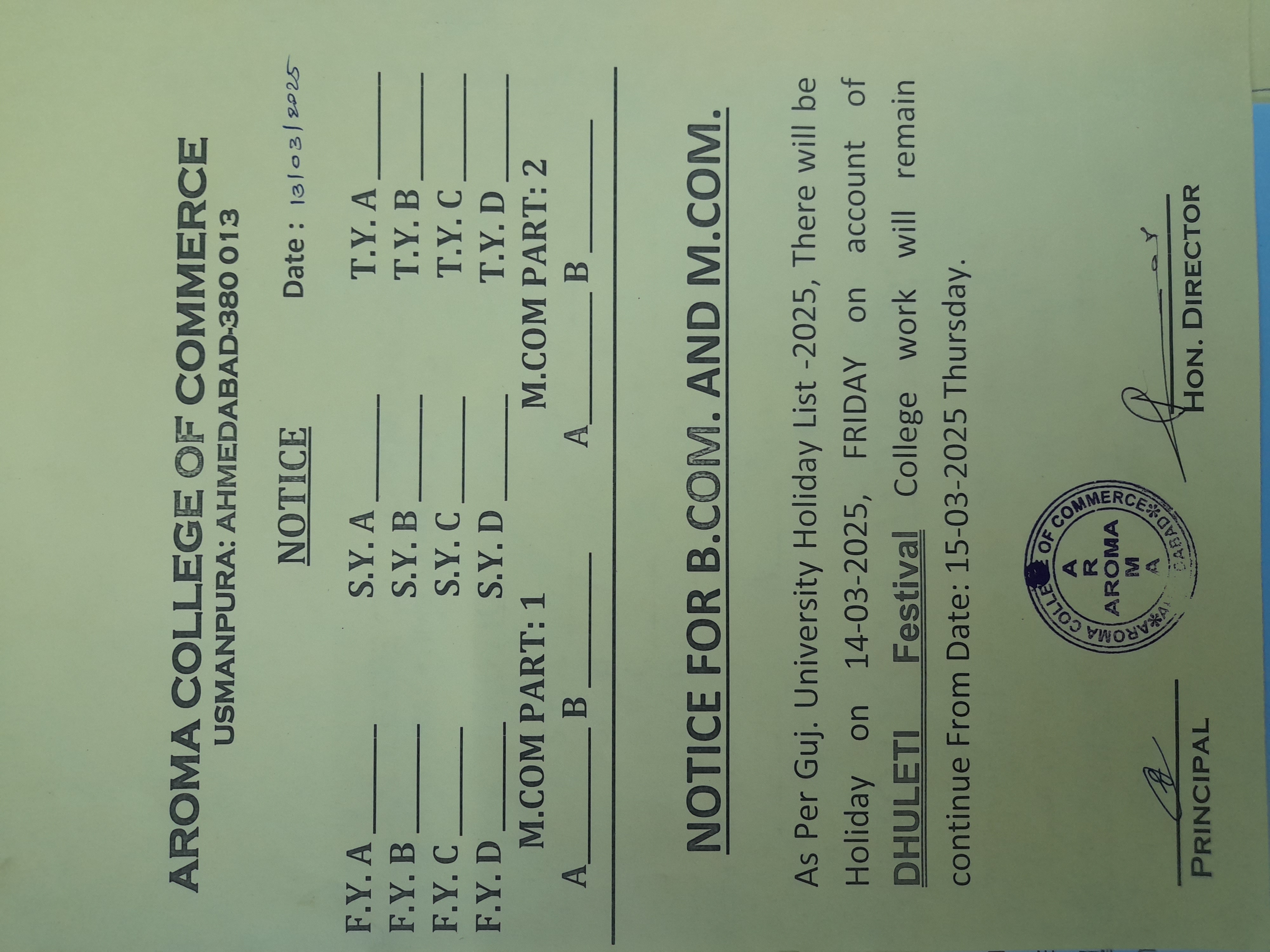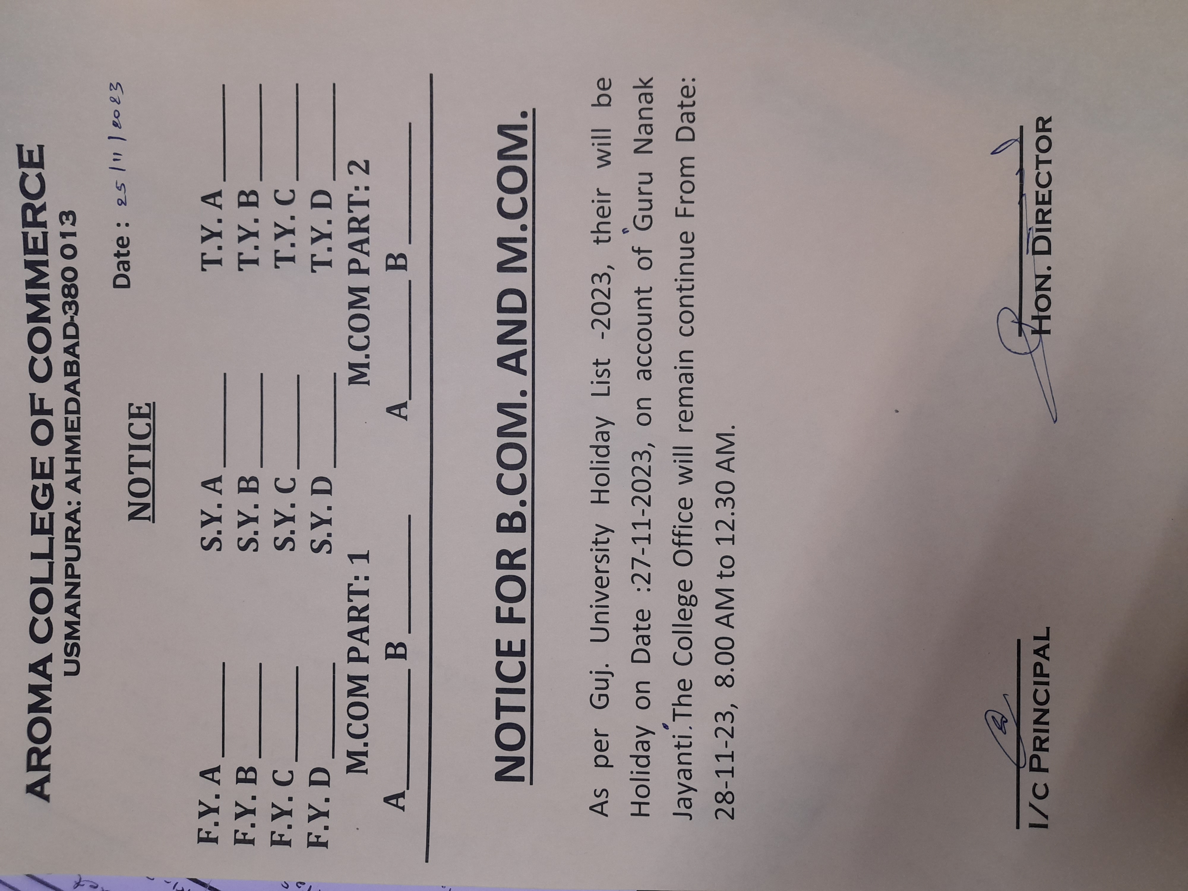 Holiday notice: As per Gujarat University Holiday list, There will be Holiday on 5/11/2025 Wednesday on account of "Gurunanak Jayanti/ Devdiwali" . College office will work regularly from 6/11/2025 Thursday.