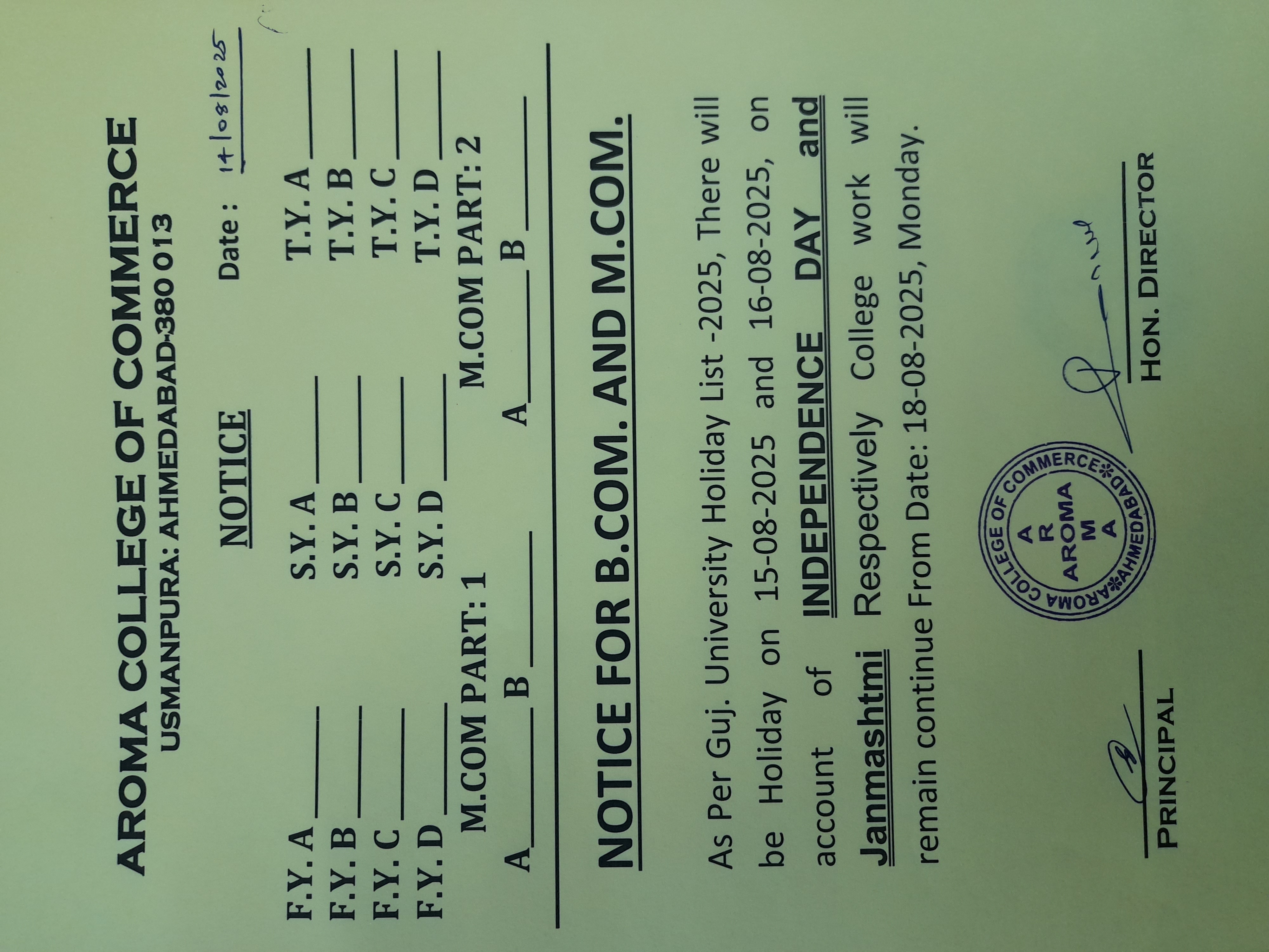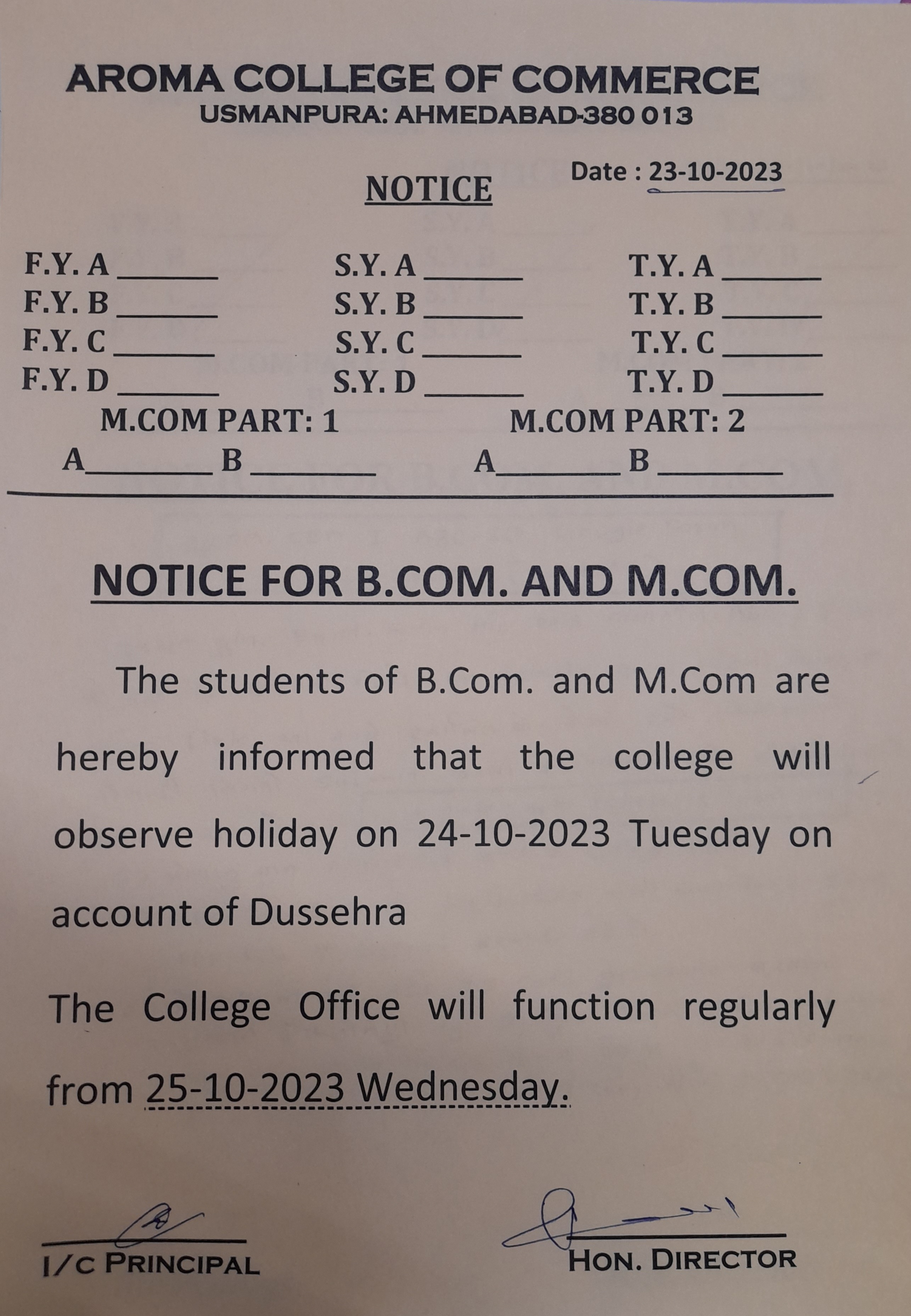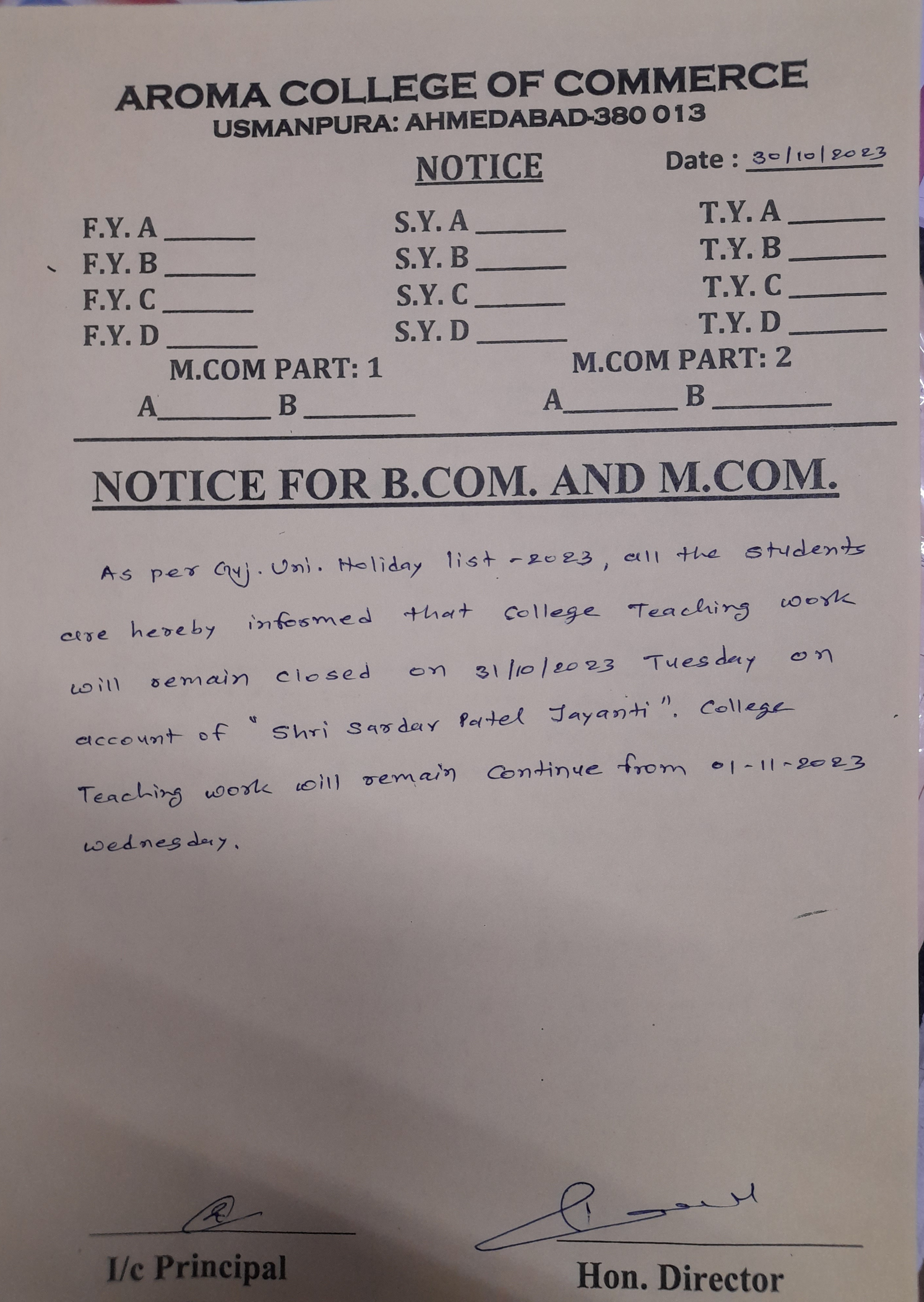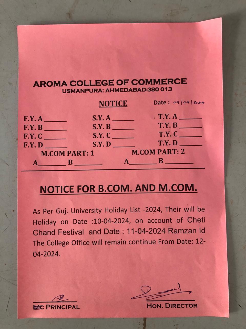 Holiday notice: As per Gujarat University Holiday list, There will be Holiday on 5/11/2025 Wednesday on account of "Gurunanak Jayanti/ Devdiwali" . College office will work regularly from 6/11/2025 Thursday.