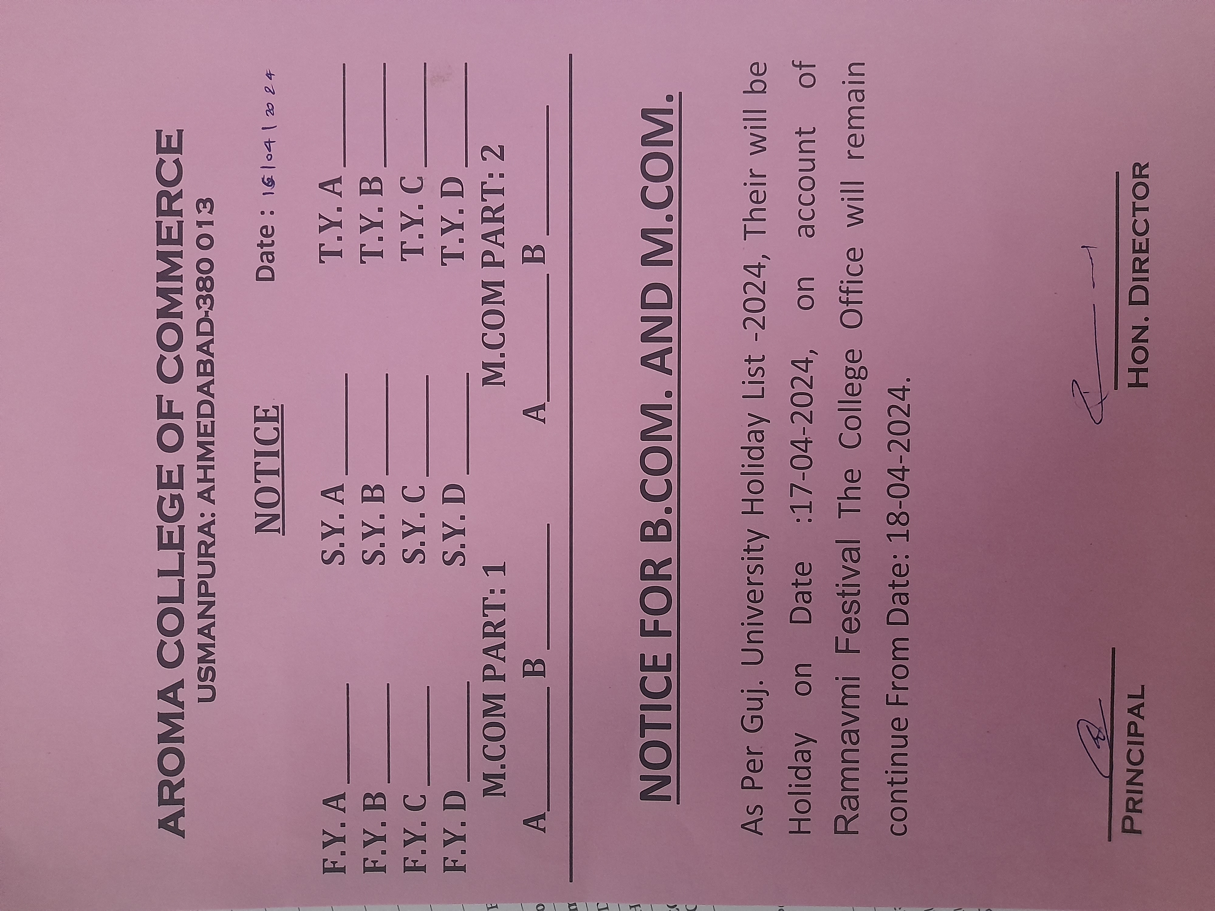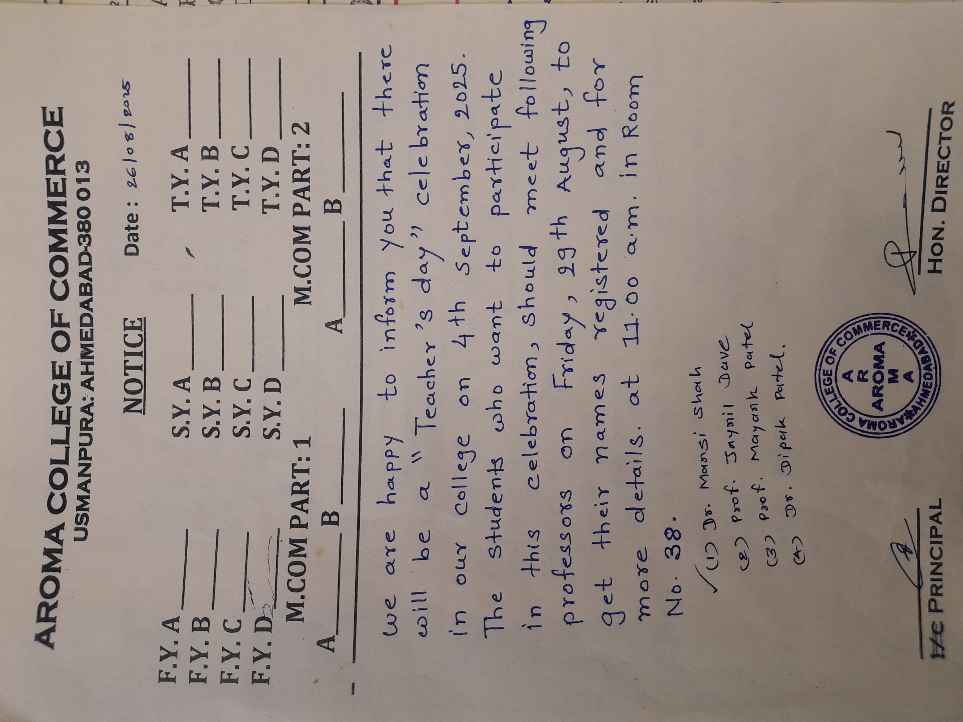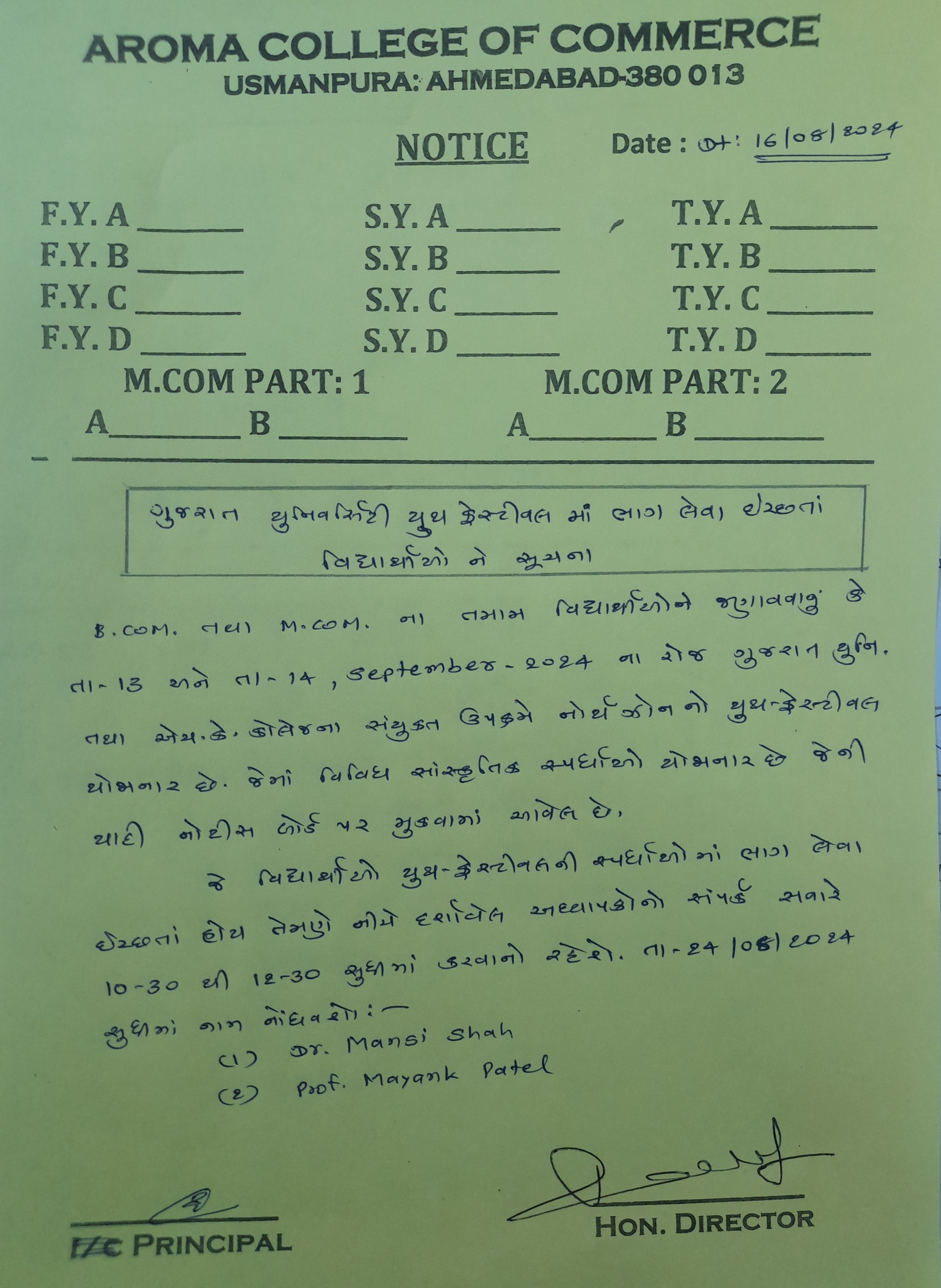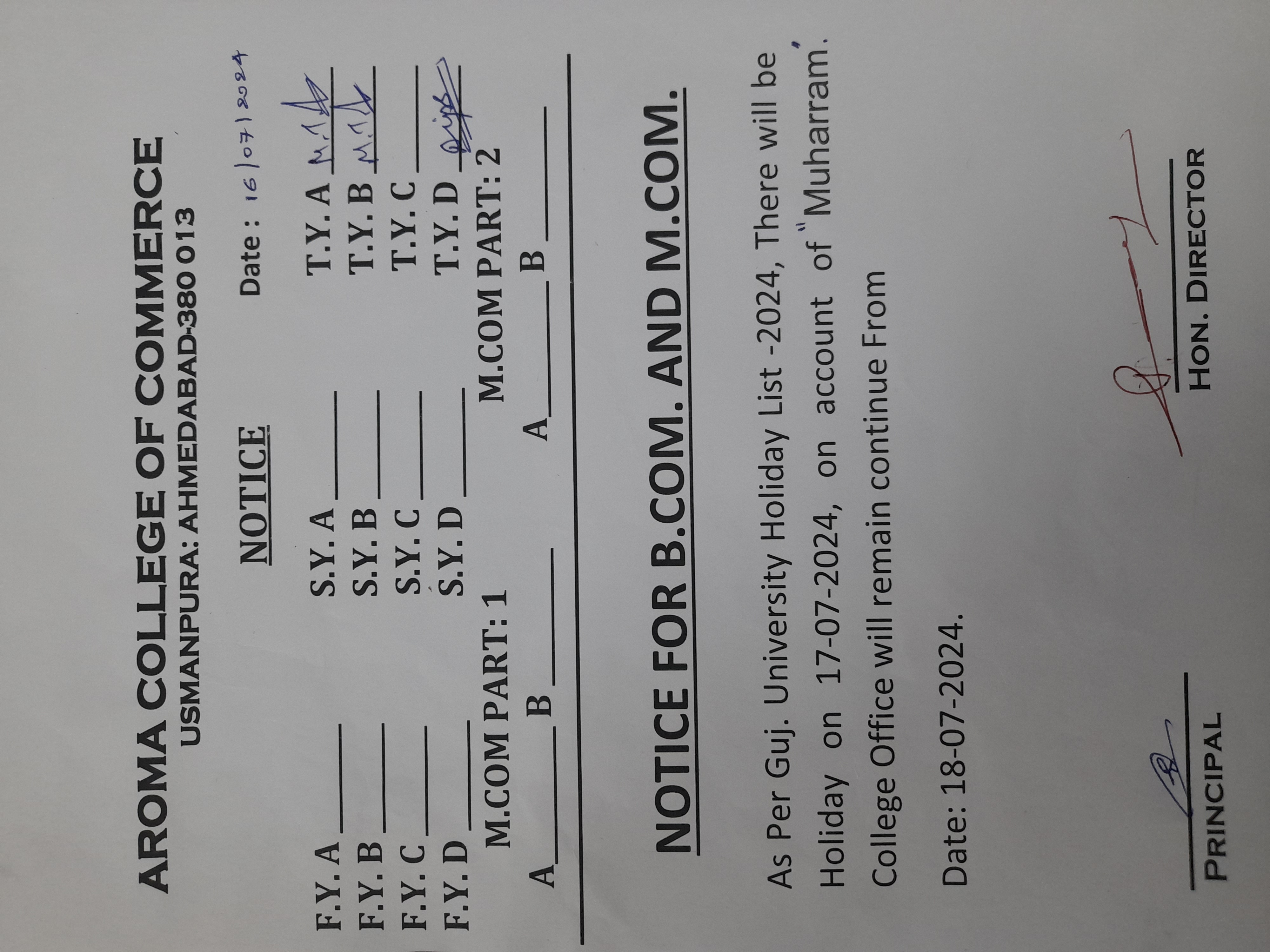 Holiday notice: As per Gujarat University Holiday list, There will be Holiday on 5/11/2025 Wednesday on account of "Gurunanak Jayanti/ Devdiwali" . College office will work regularly from 6/11/2025 Thursday.